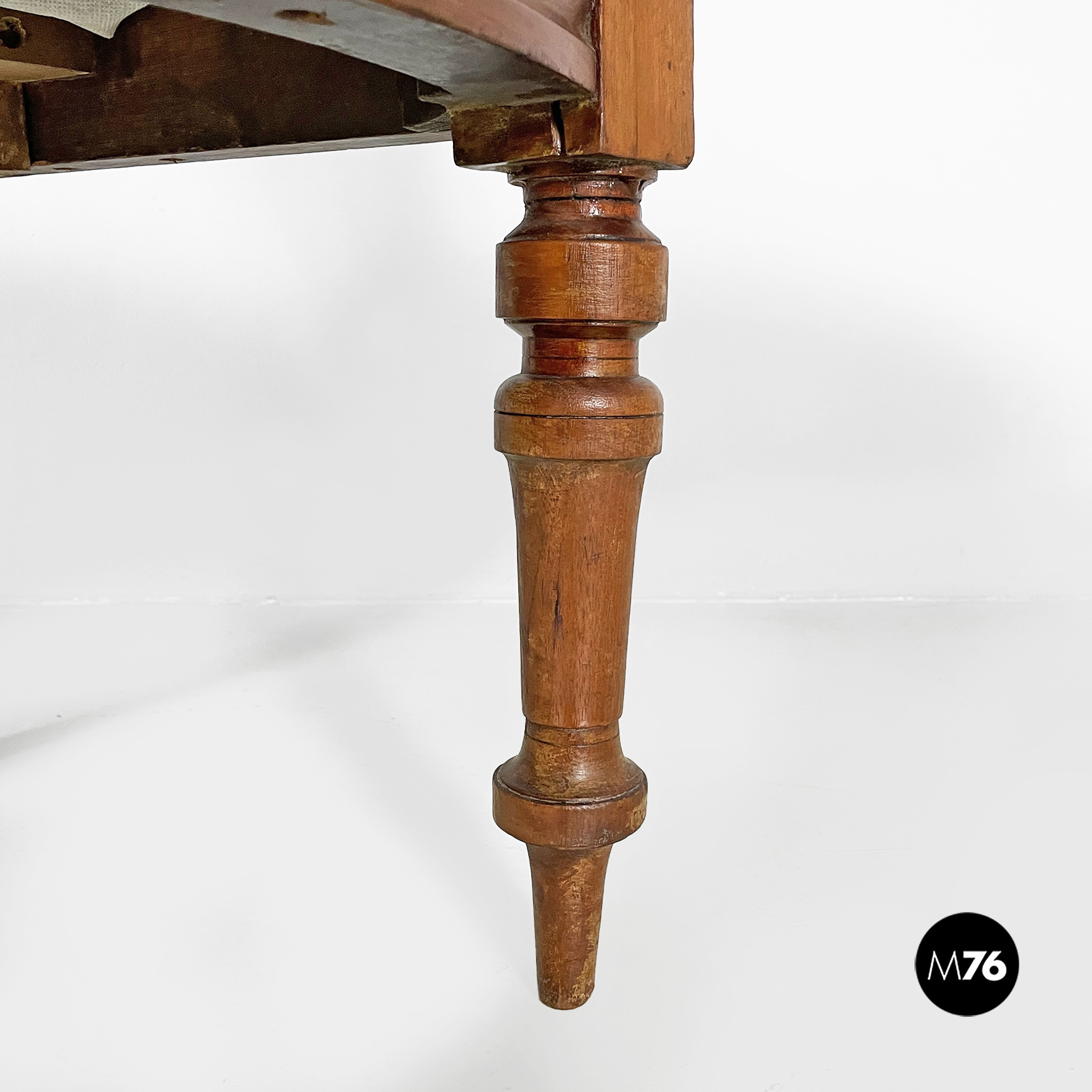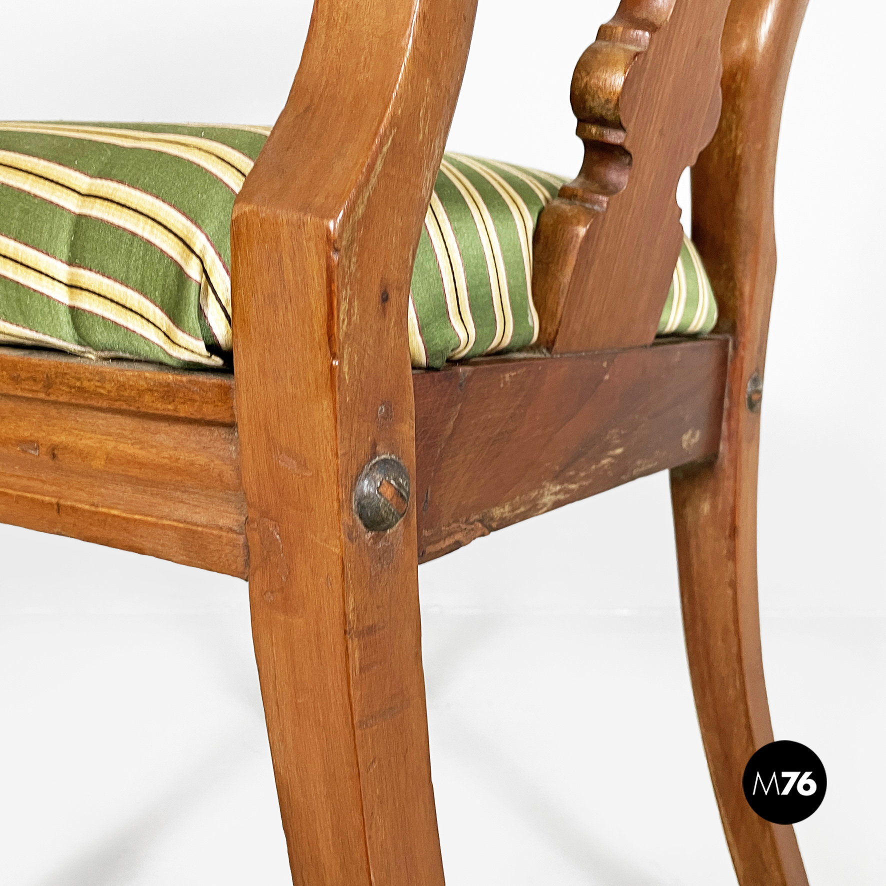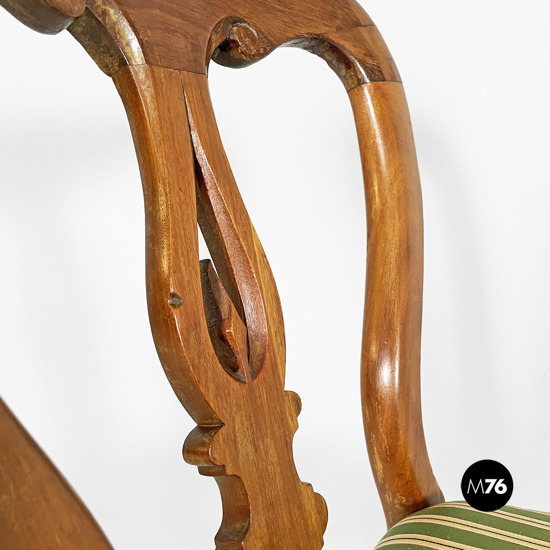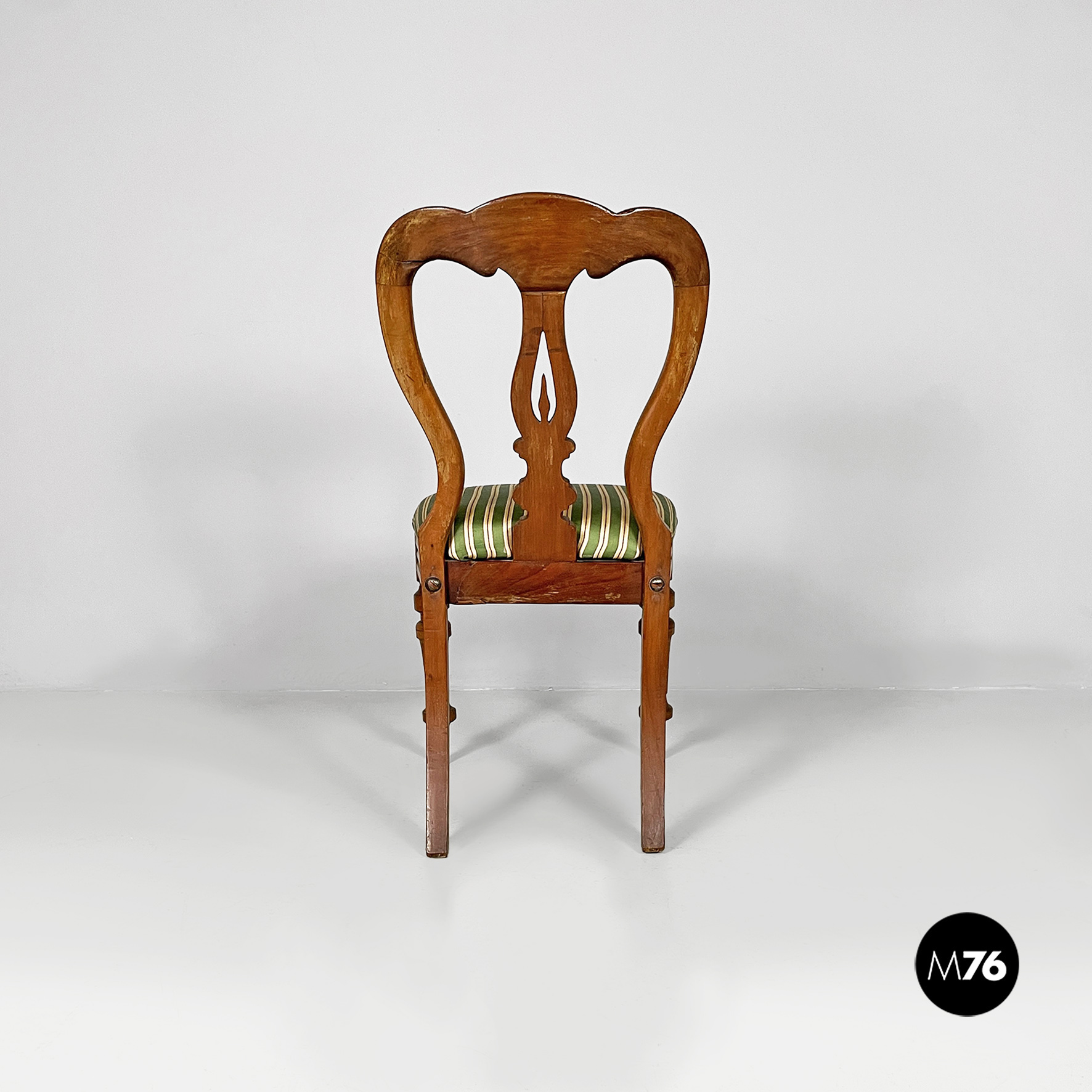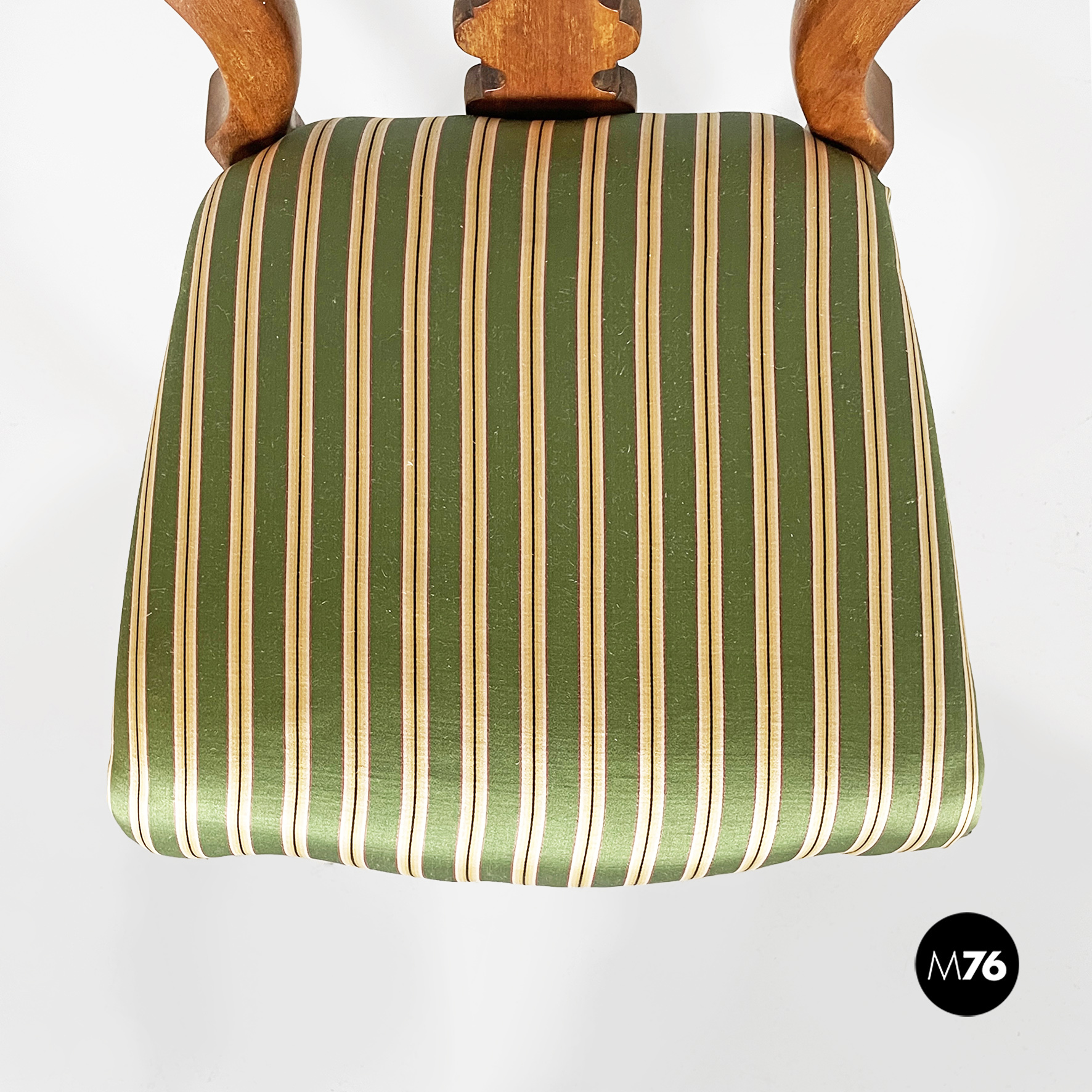 Set di quattro sedie con struttura in legno e seduta imbottita e rivestita di seta a righe di diversi colori. Lo schienale segue forme curve e tondeggianti con una trave centrale intagliata e le due gambe anteriori sono tornite a sezione tonda mentre le due posteriori sono a sezione quadrata.
