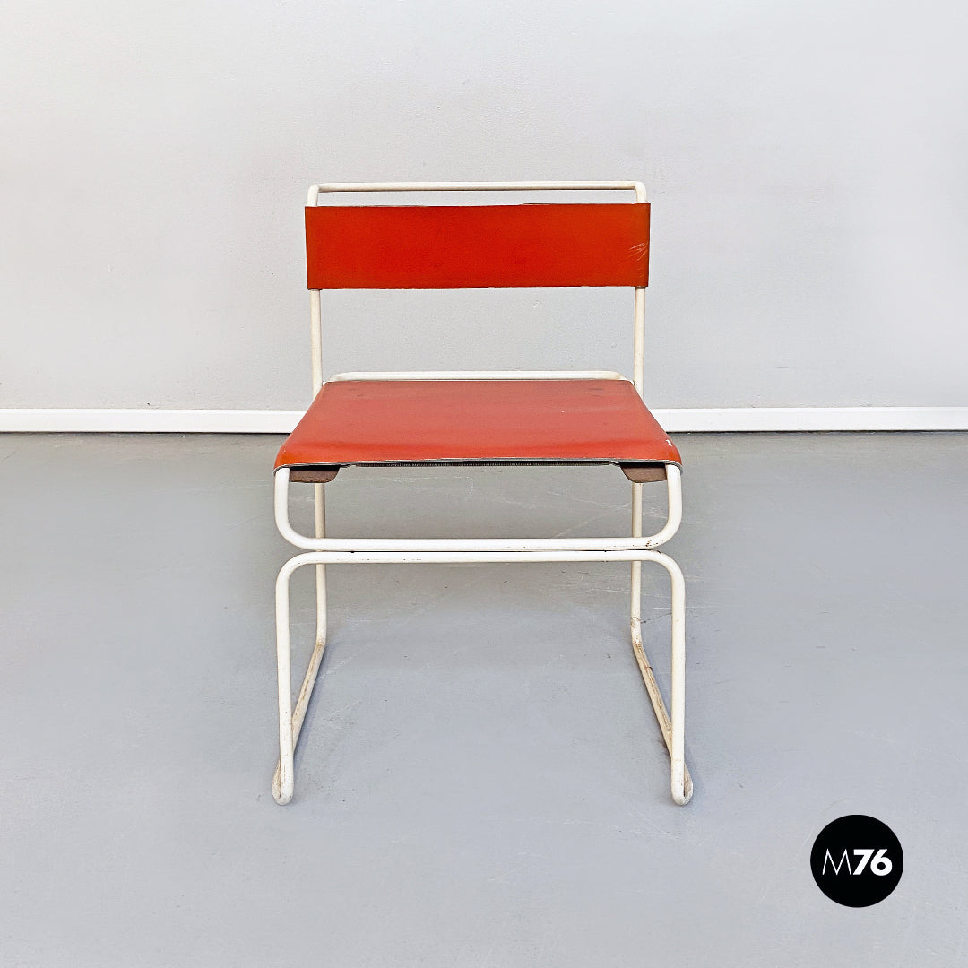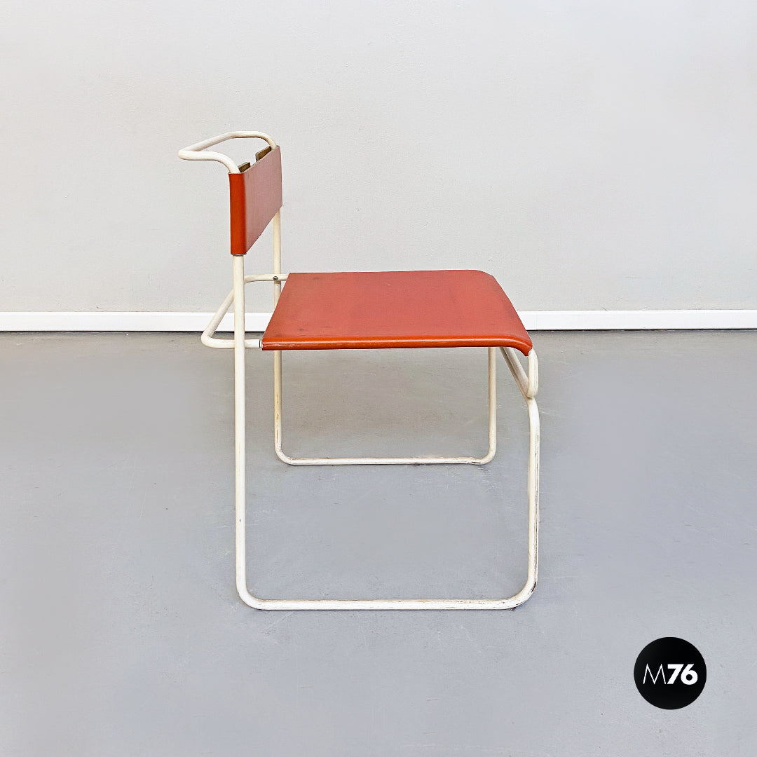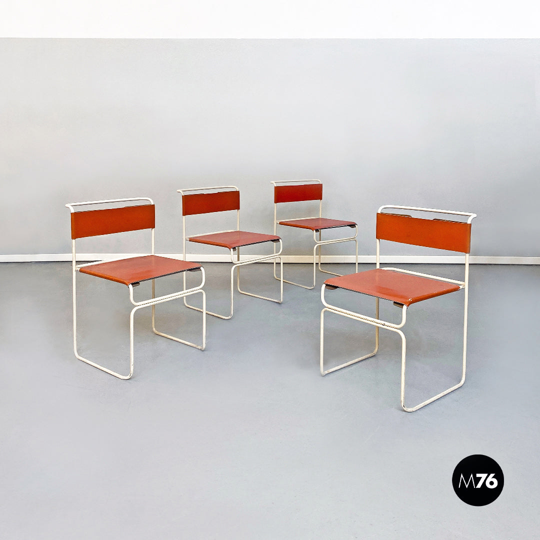 Set composto da quattro sedie impilabili modello Libellula con struttura in tondino di metallo smaltato bianco e seduta e schienale in pelle marrone aranciato.