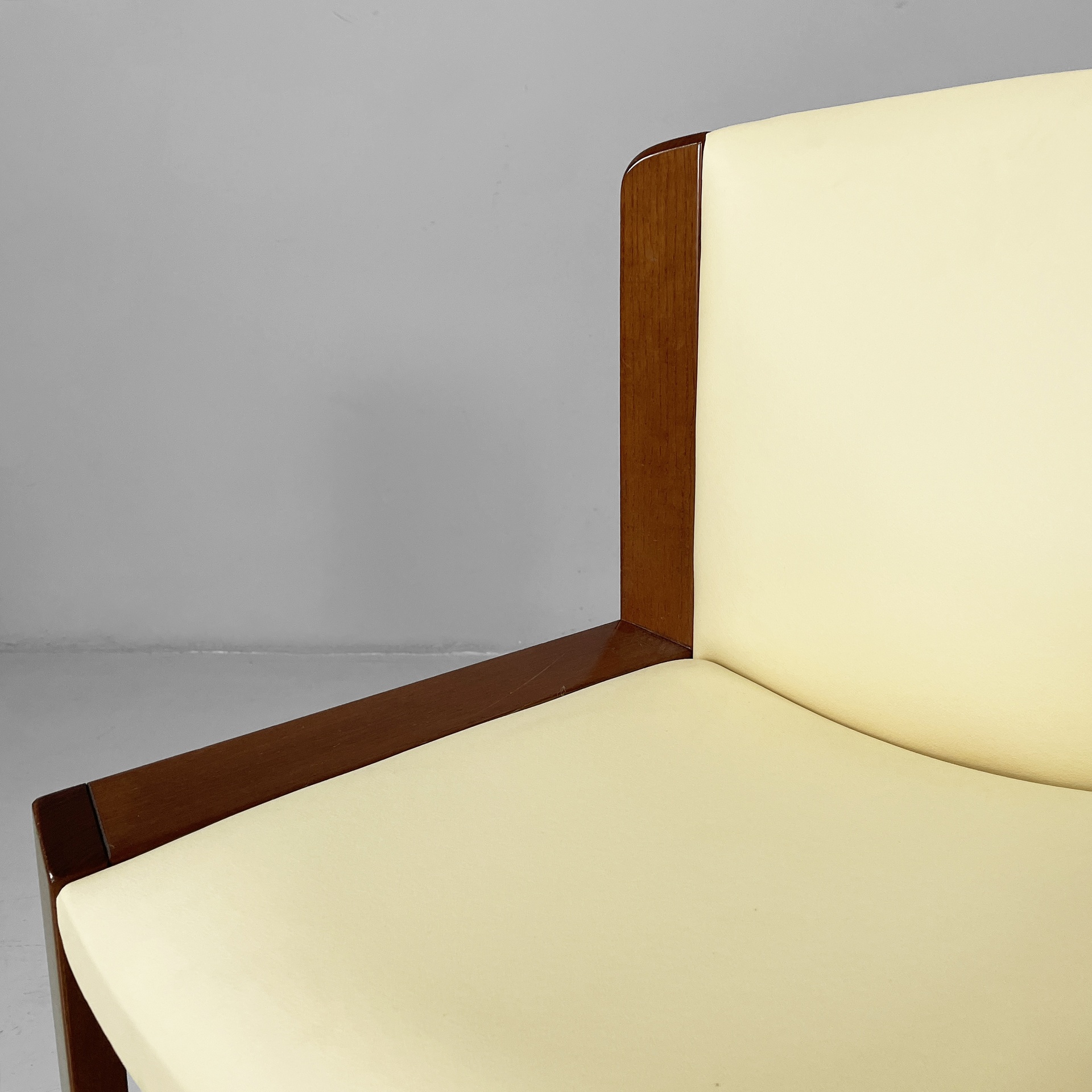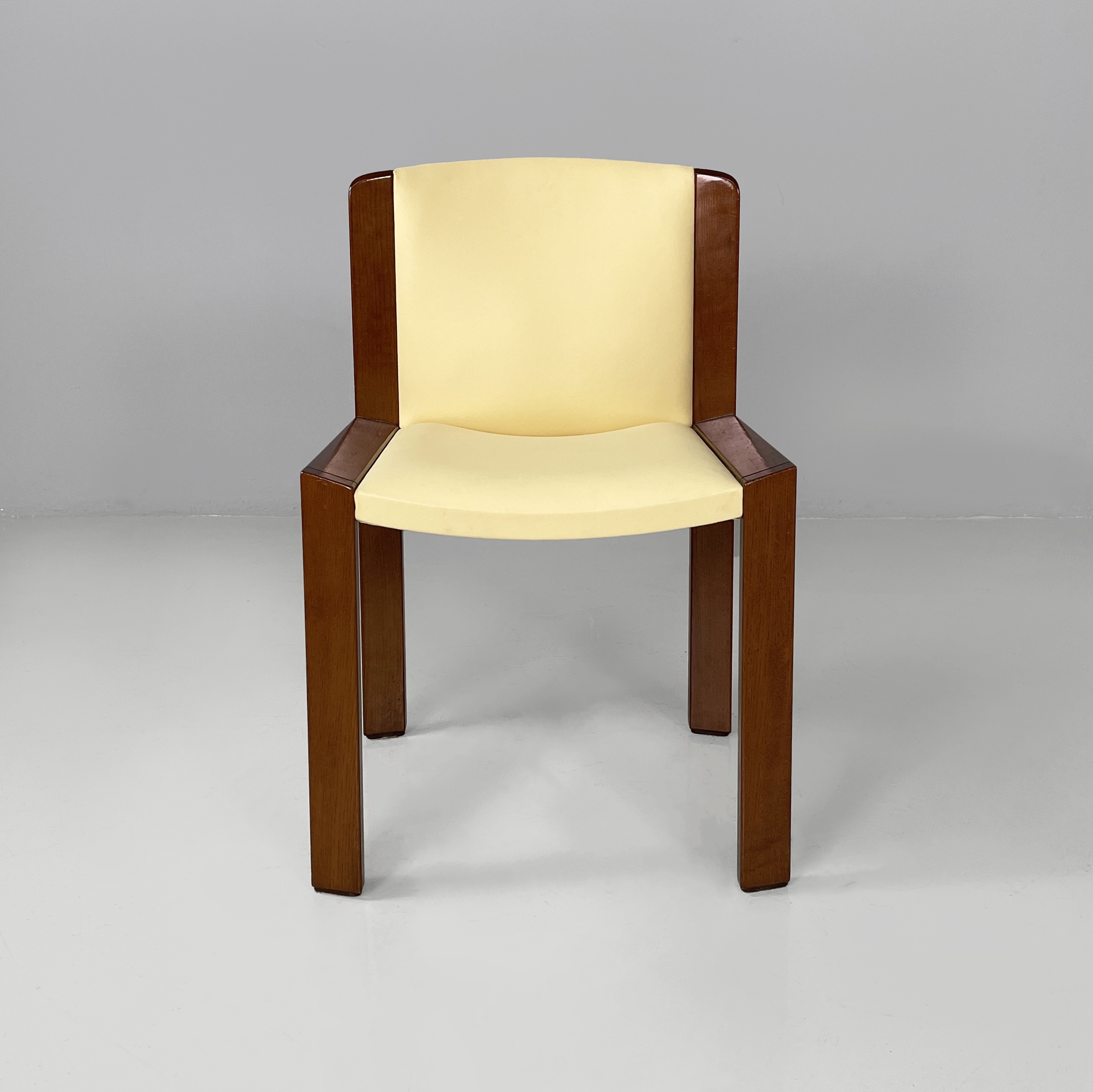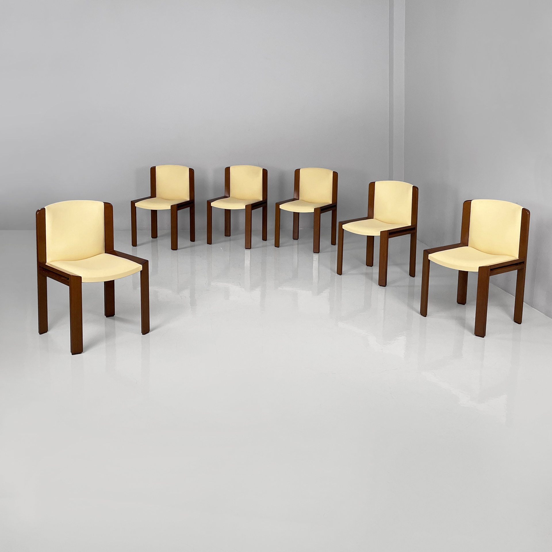 Set di sei sedie modello 300 con seduta e schienale squadrati, imbottiti e rivestiti in sky giallo-beige e profili in legno. Le zampe a listello sono in legno.
