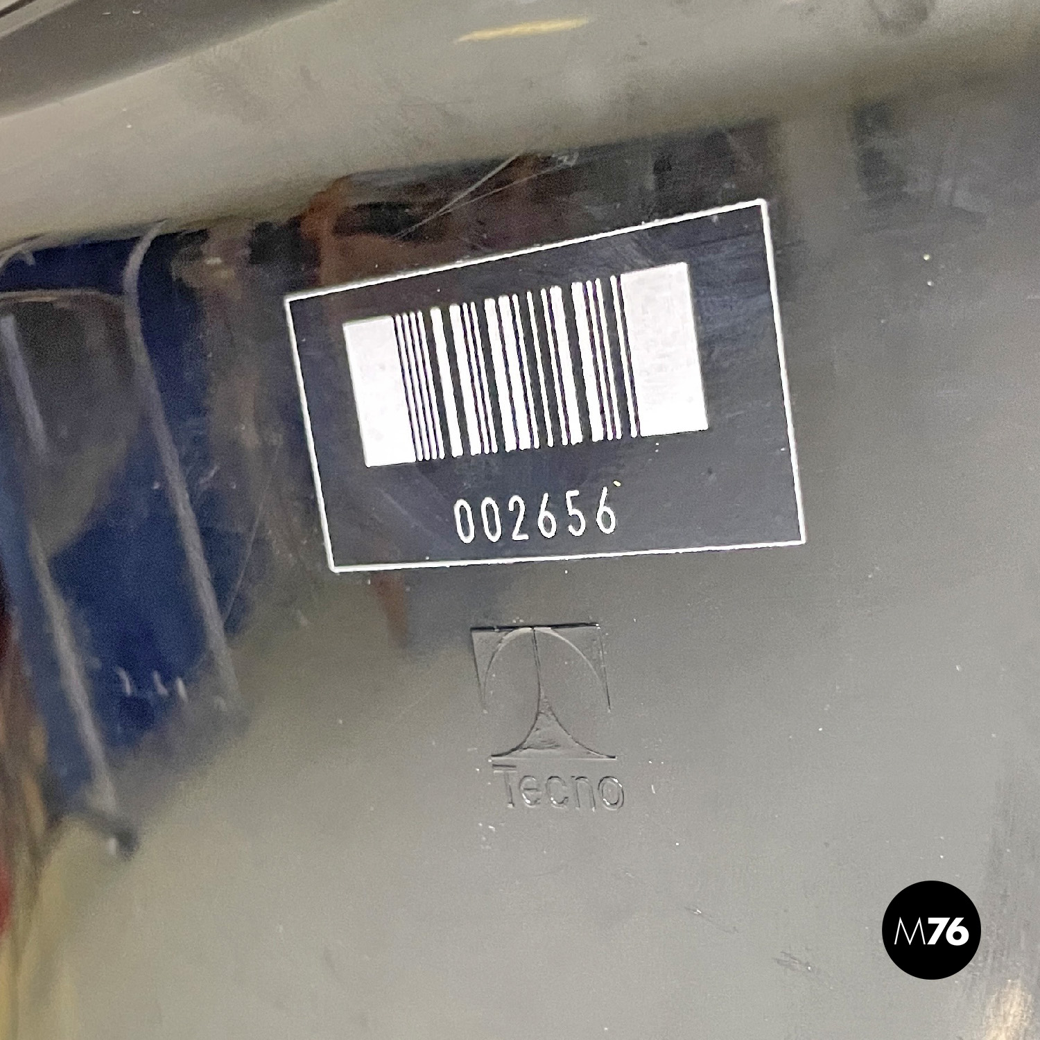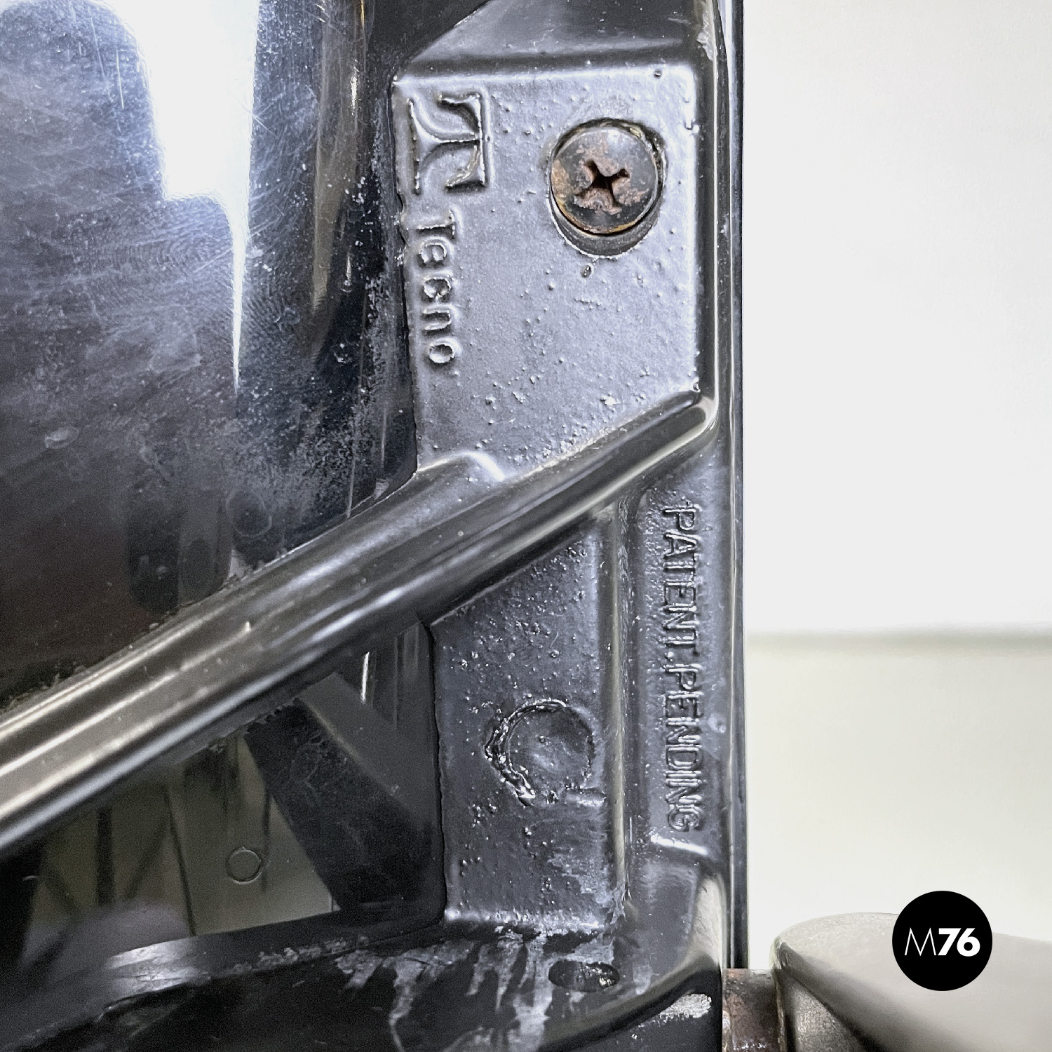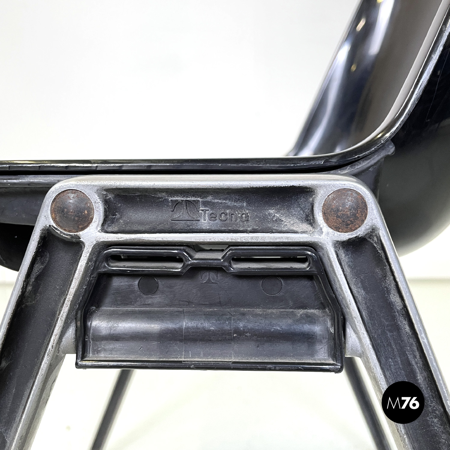 Prodotte da Tecno nel 1980 ca. e disegnate da Osvaldo Borsani nel 1973. Logo dell’azienda impresso su un fianco e sullo schienale dove si trova anche un’etichetta con il numero di serie di ciascuna sedia. Un’ulteriore logo con il nome del modello è presente sotto la seduta.
