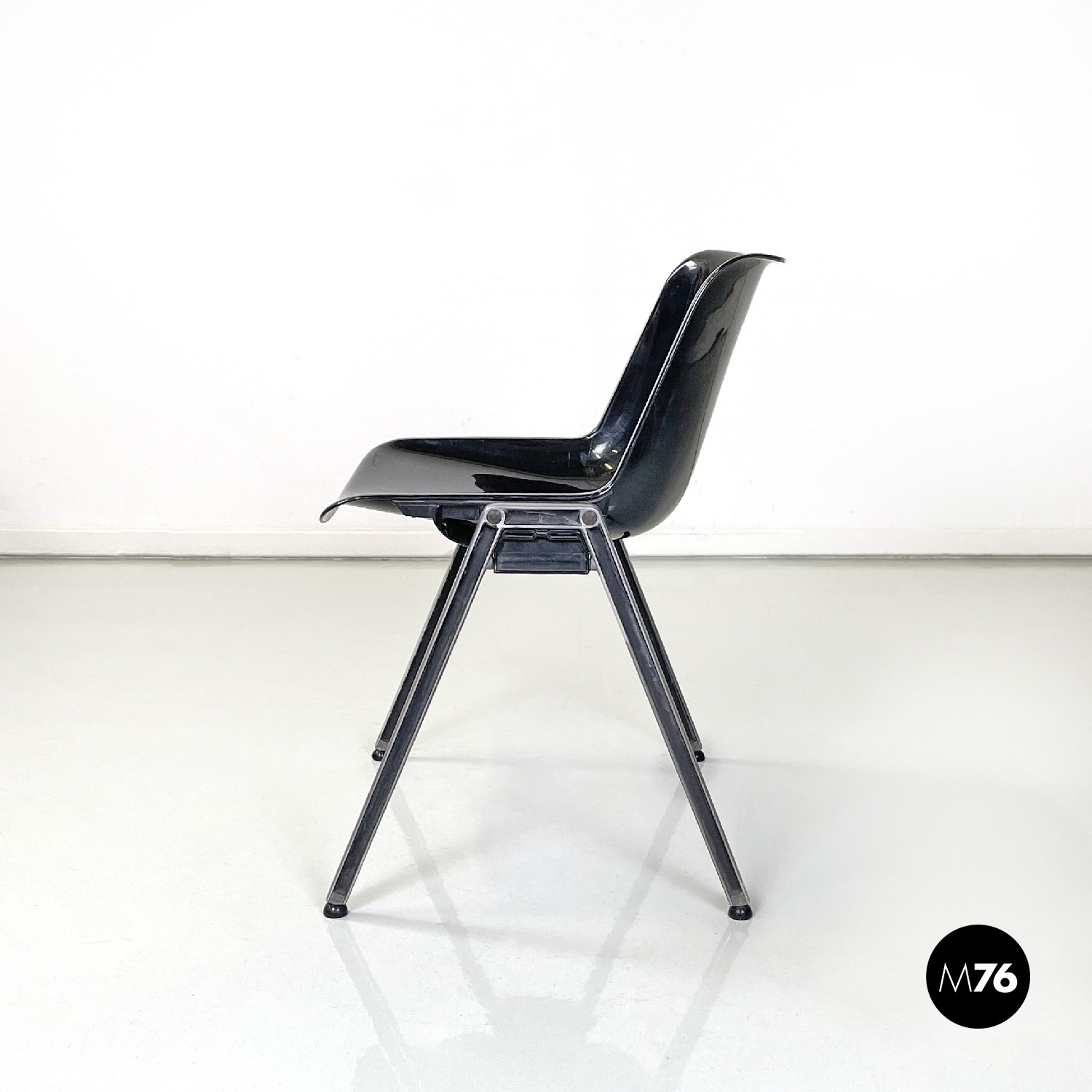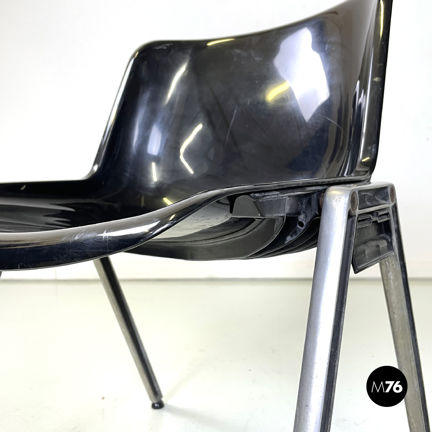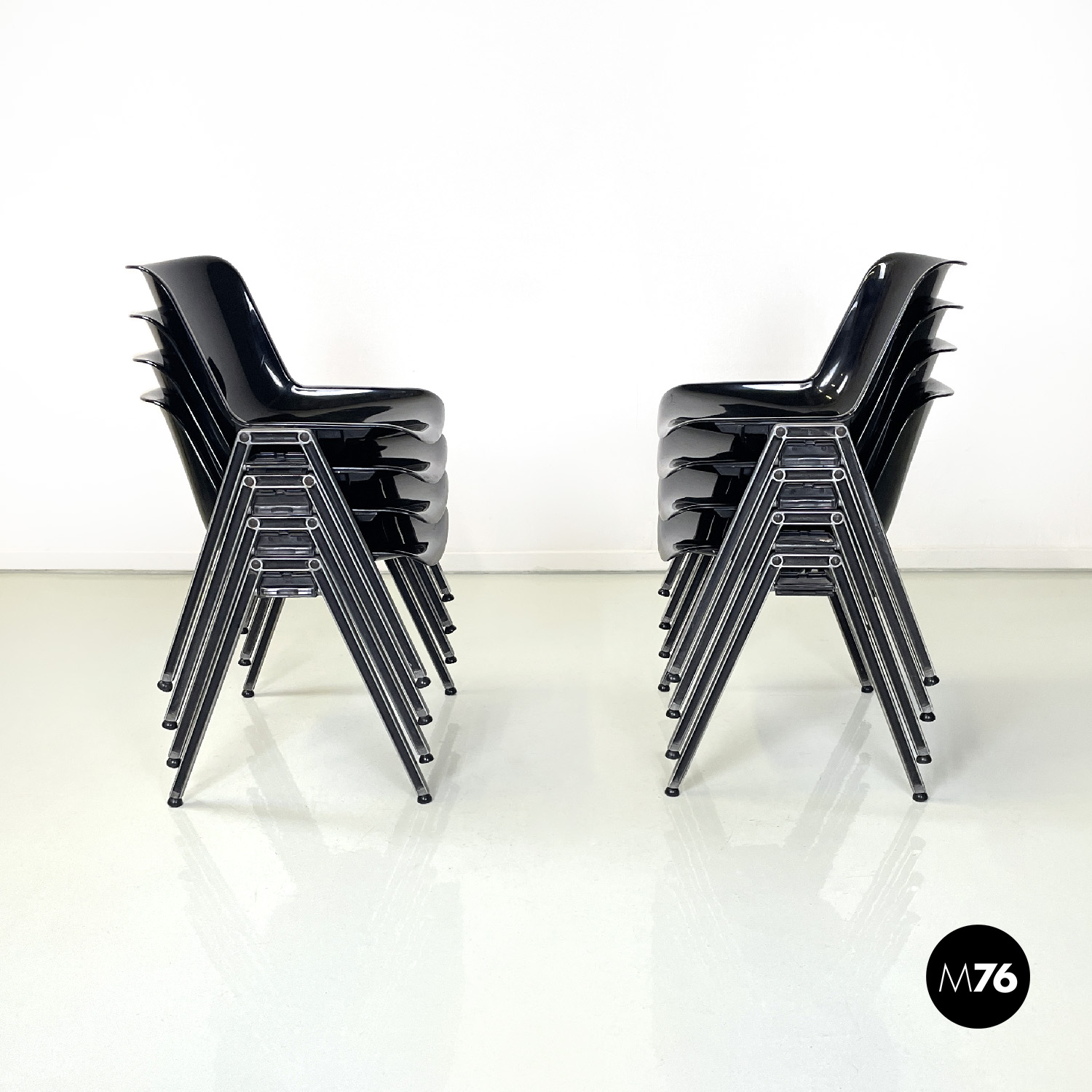 Set di otto sedie modello Modus SM 203 con seduta e schienale composti da una monoscocca curvata in plastica nera. Le zampe in alluminio sono squadrate. Piedini tondi in gomma nera. Impilabili.