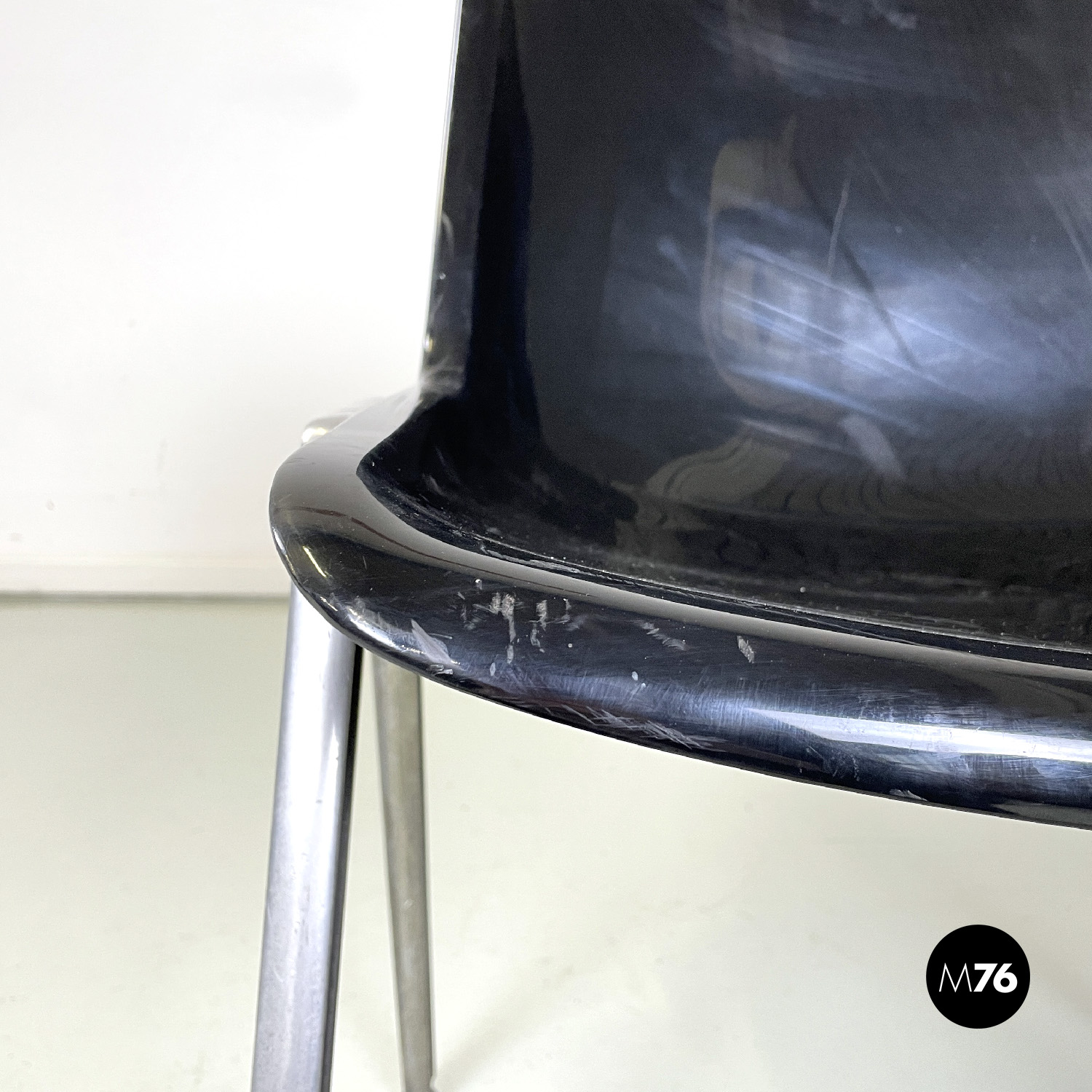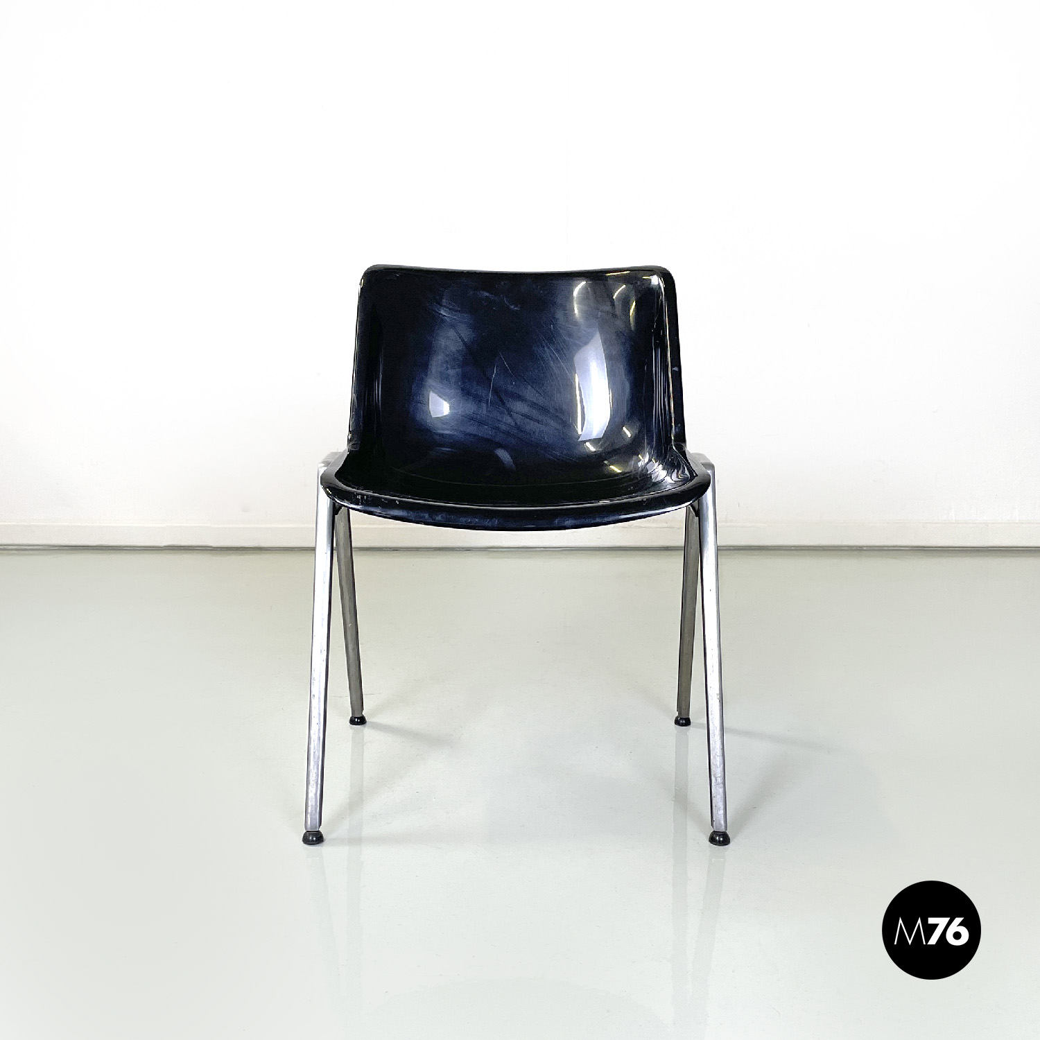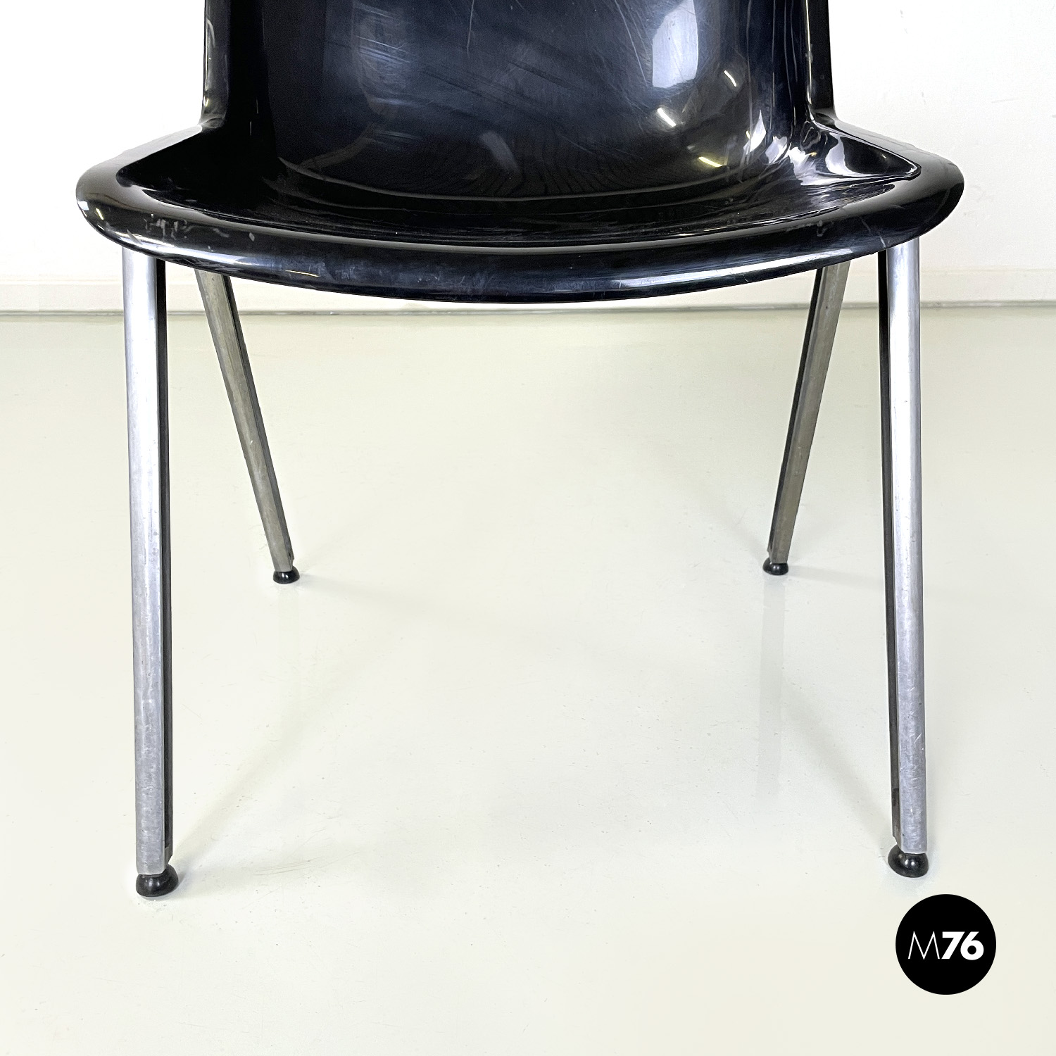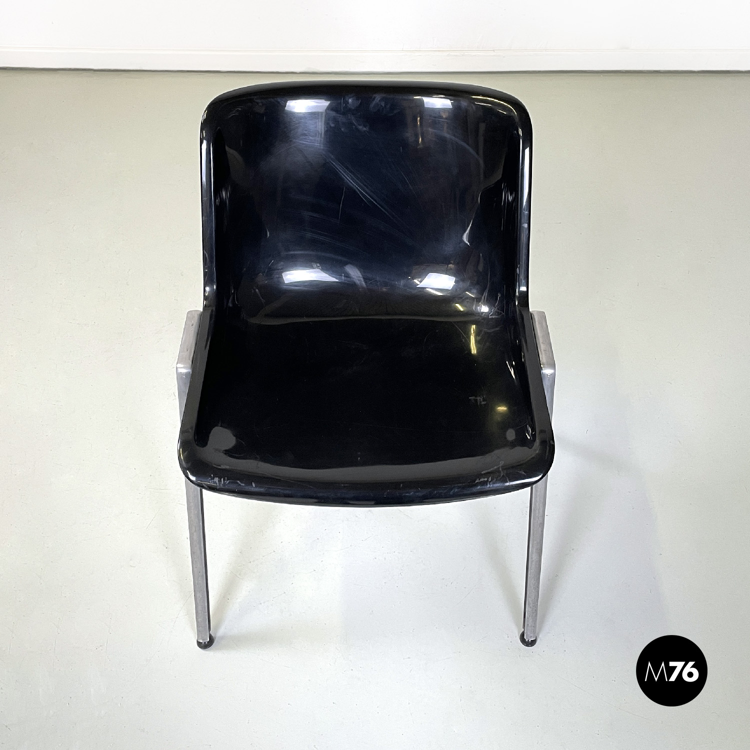 Set di otto sedie modello Modus SM 203 con seduta e schienale composti da una monoscocca curvata in plastica nera. Le zampe in alluminio sono squadrate. Piedini tondi in gomma nera. Impilabili.