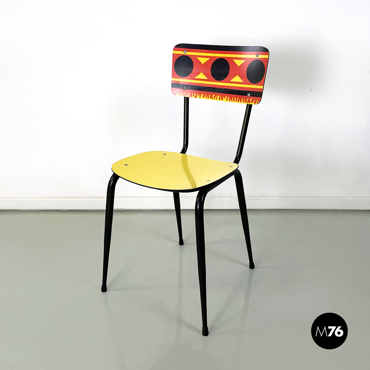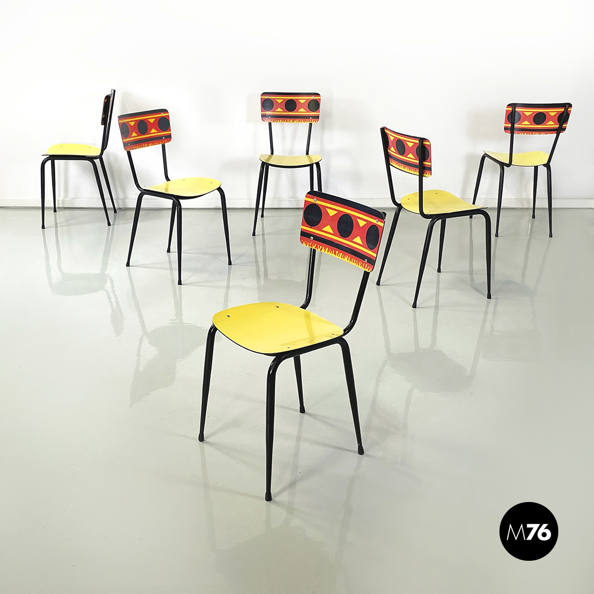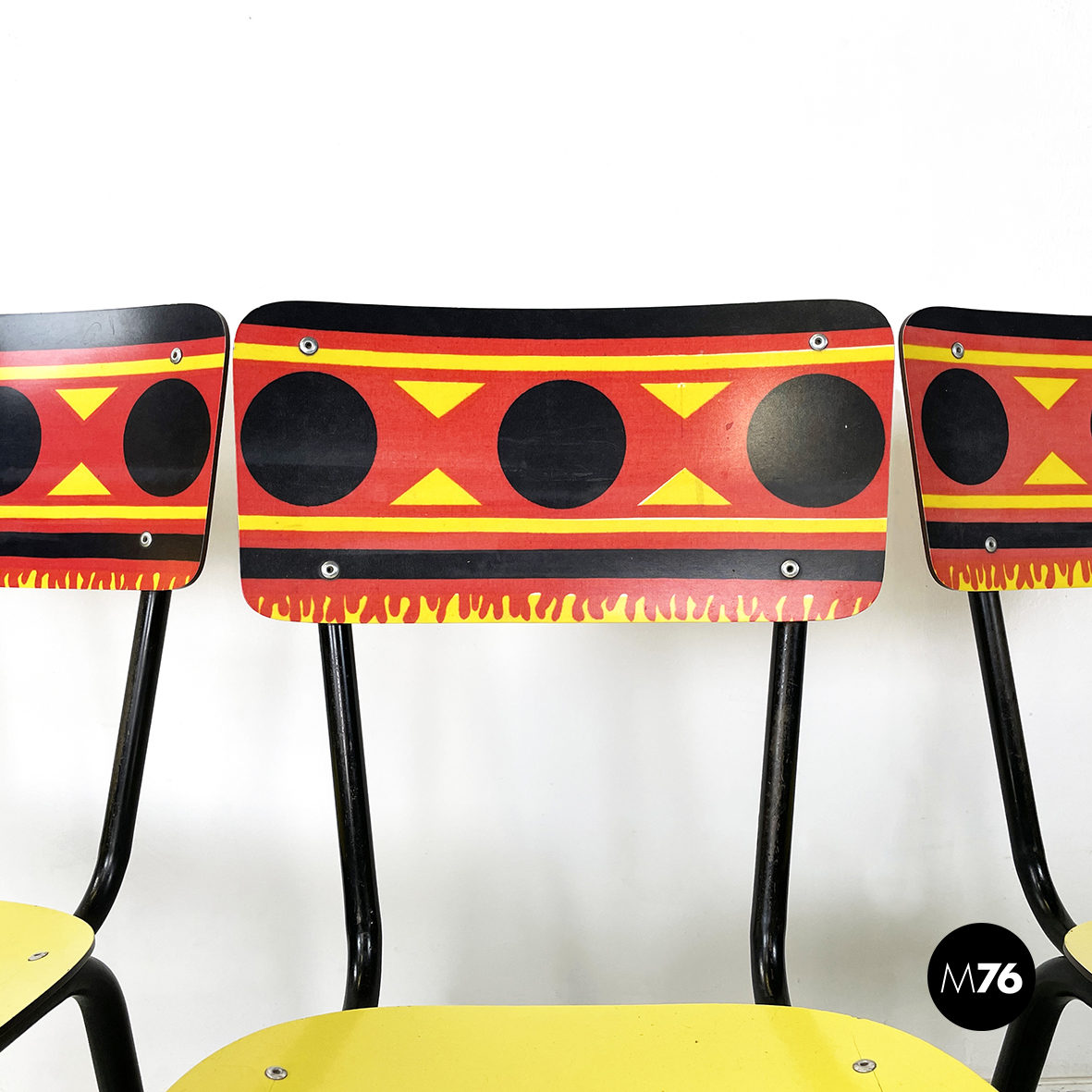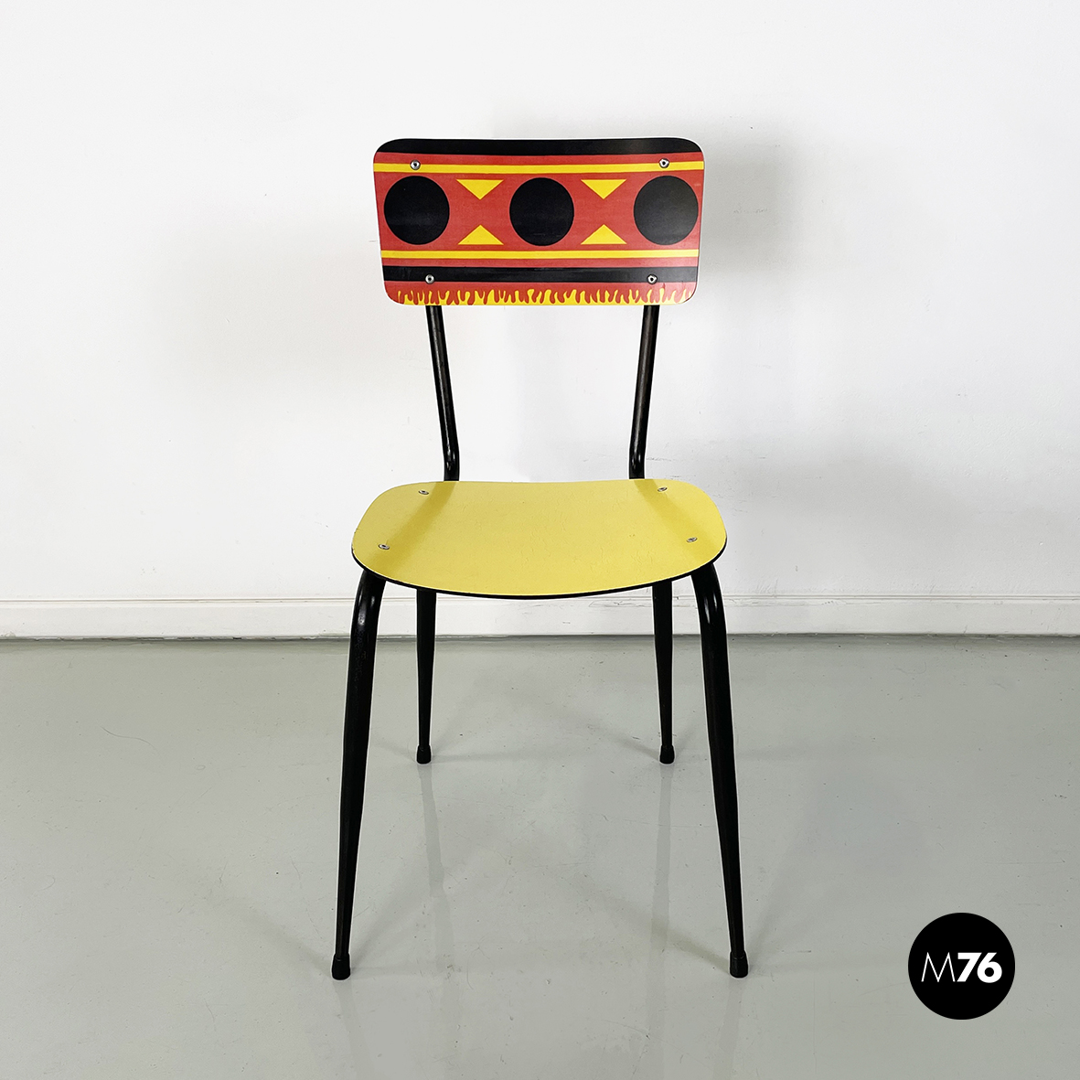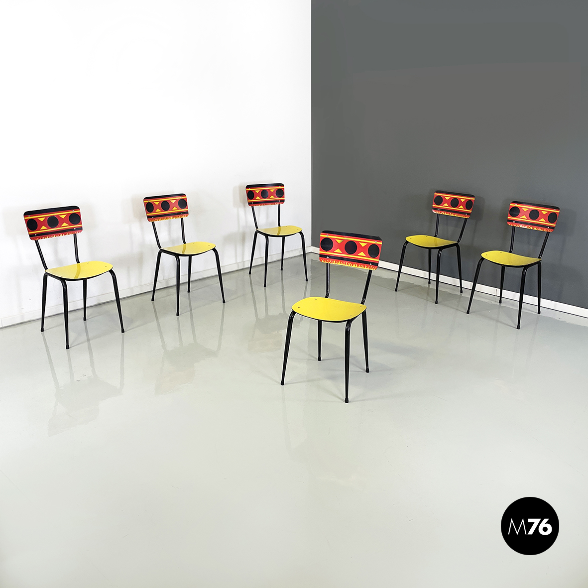 Set di sei sedie appartenente all’edizione limitata del Gran Cafè Paulista di Lavazza. La seduta squadrata ad angoli arrotondati in formica giallo brillante mentre lo schienale rettangolare in formica presenta il pattern geometrico in giallo rosso e nero della marca di caffè. Struttura in tubolare di metallo verniciato nero.