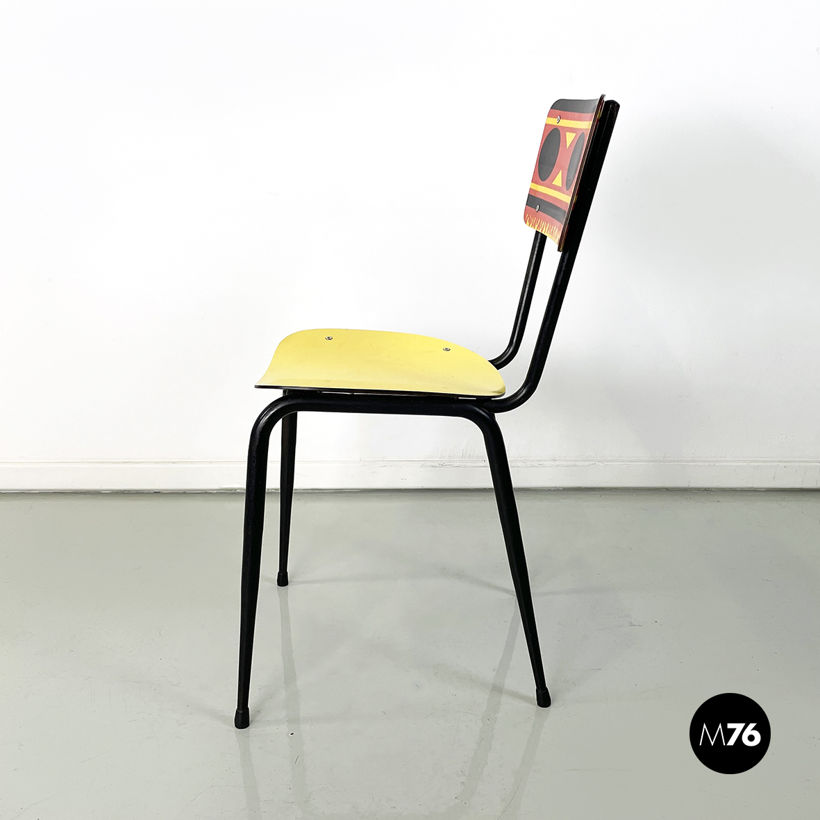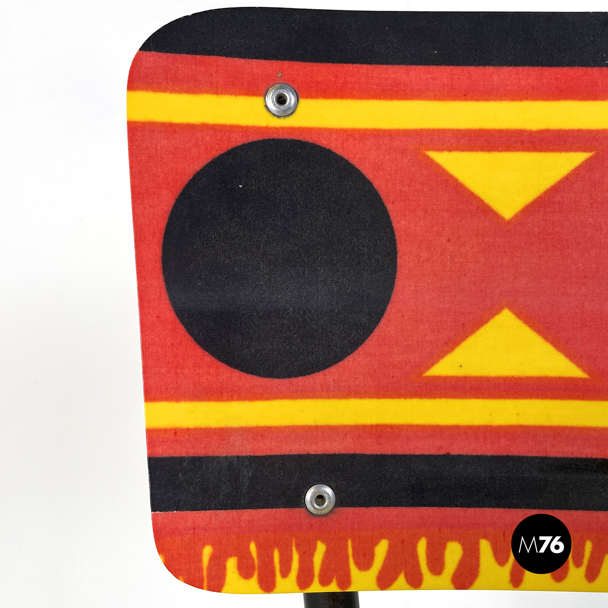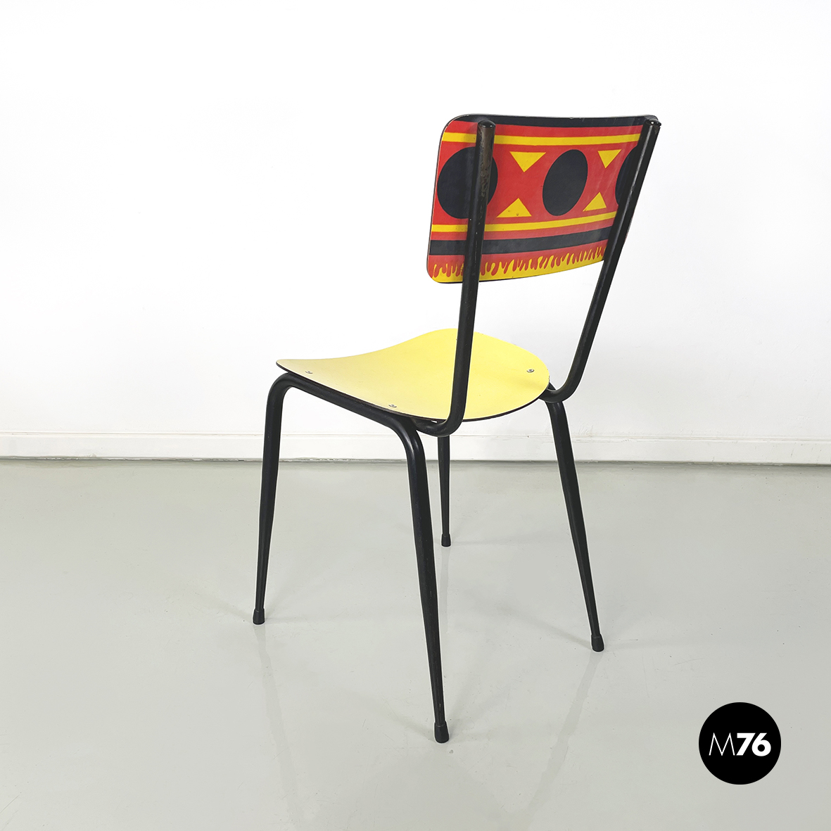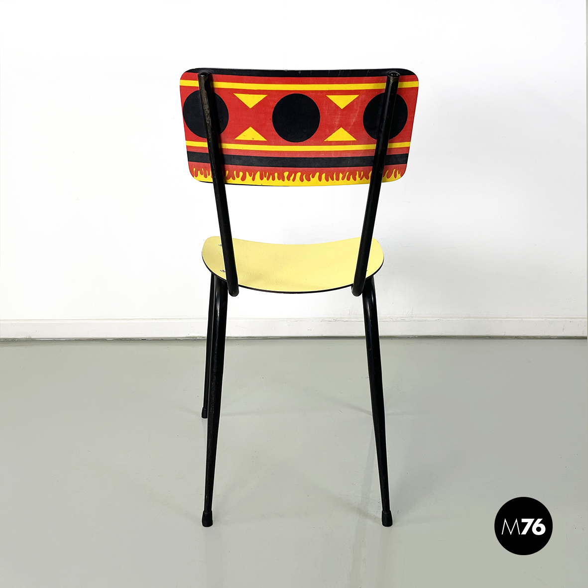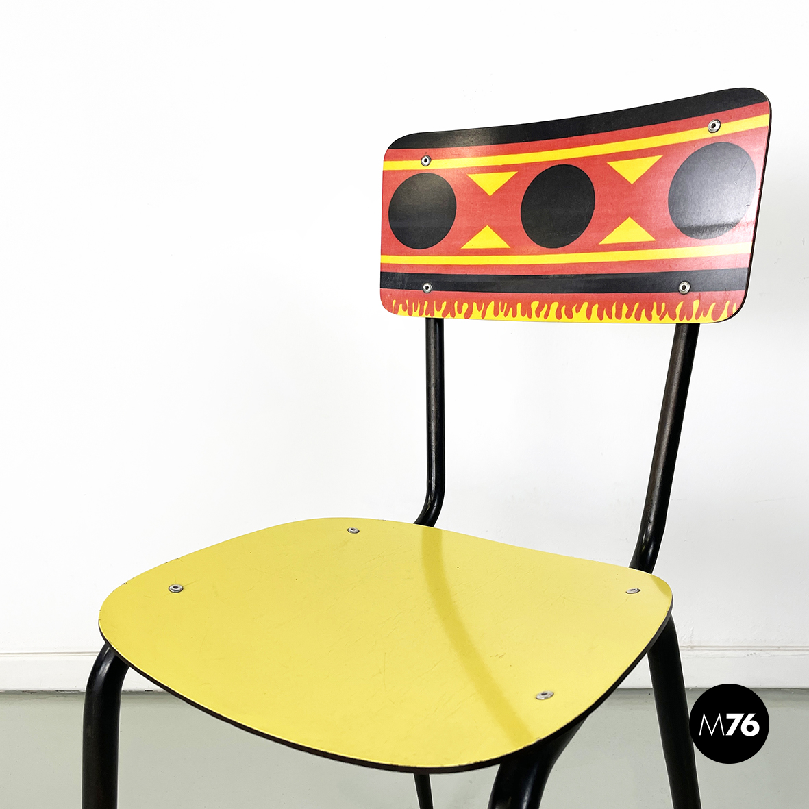 Set di sei sedie appartenente all’edizione limitata del Gran Cafè Paulista di Lavazza. La seduta squadrata ad angoli arrotondati in formica giallo brillante mentre lo schienale rettangolare in formica presenta il pattern geometrico in giallo rosso e nero della marca di caffè. Struttura in tubolare di metallo verniciato nero.