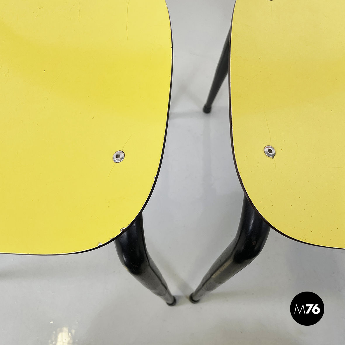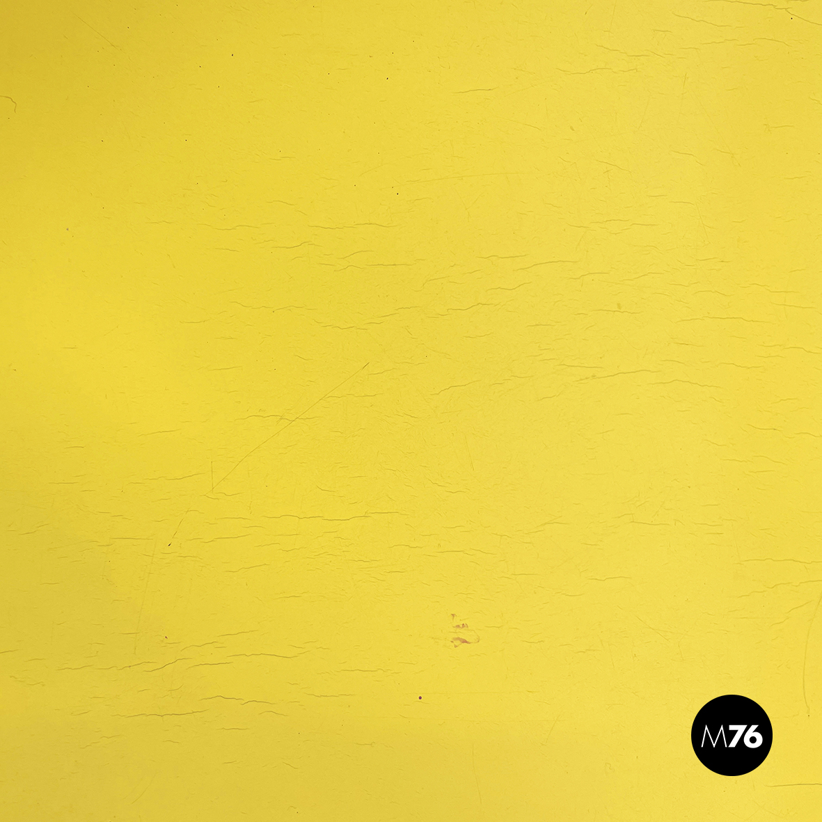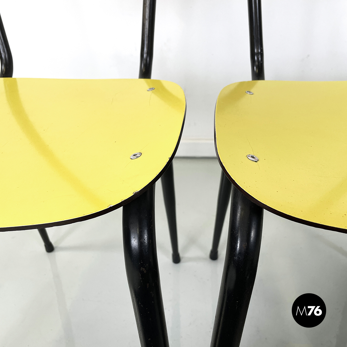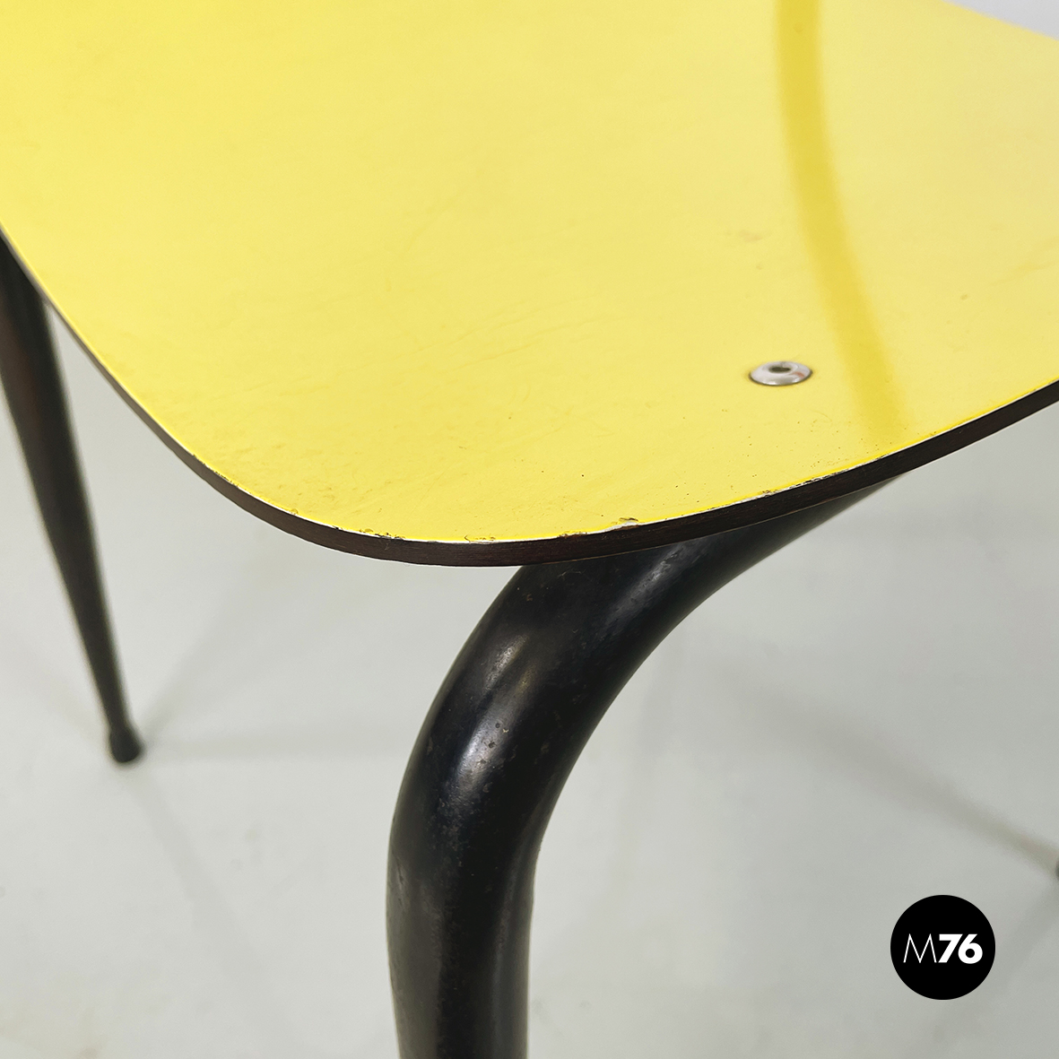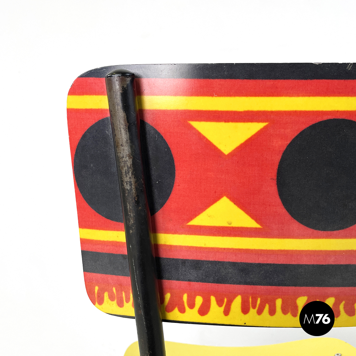 Set di sei sedie appartenente all’edizione limitata del Gran Cafè Paulista di Lavazza. La seduta squadrata ad angoli arrotondati in formica giallo brillante mentre lo schienale rettangolare in formica presenta il pattern geometrico in giallo rosso e nero della marca di caffè. Struttura in tubolare di metallo verniciato nero.