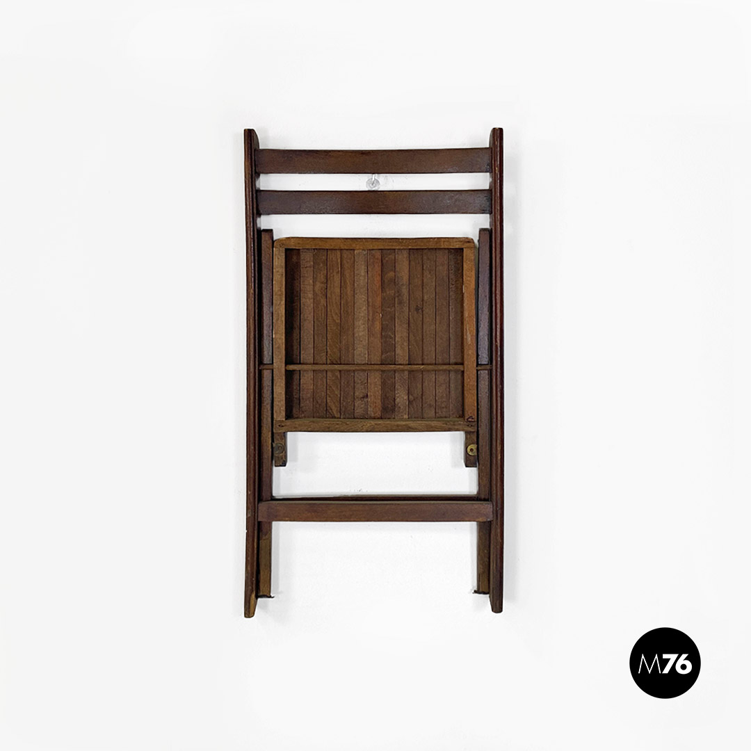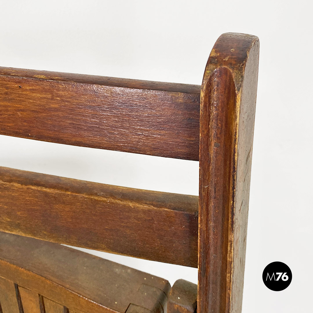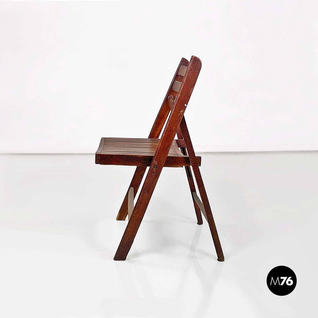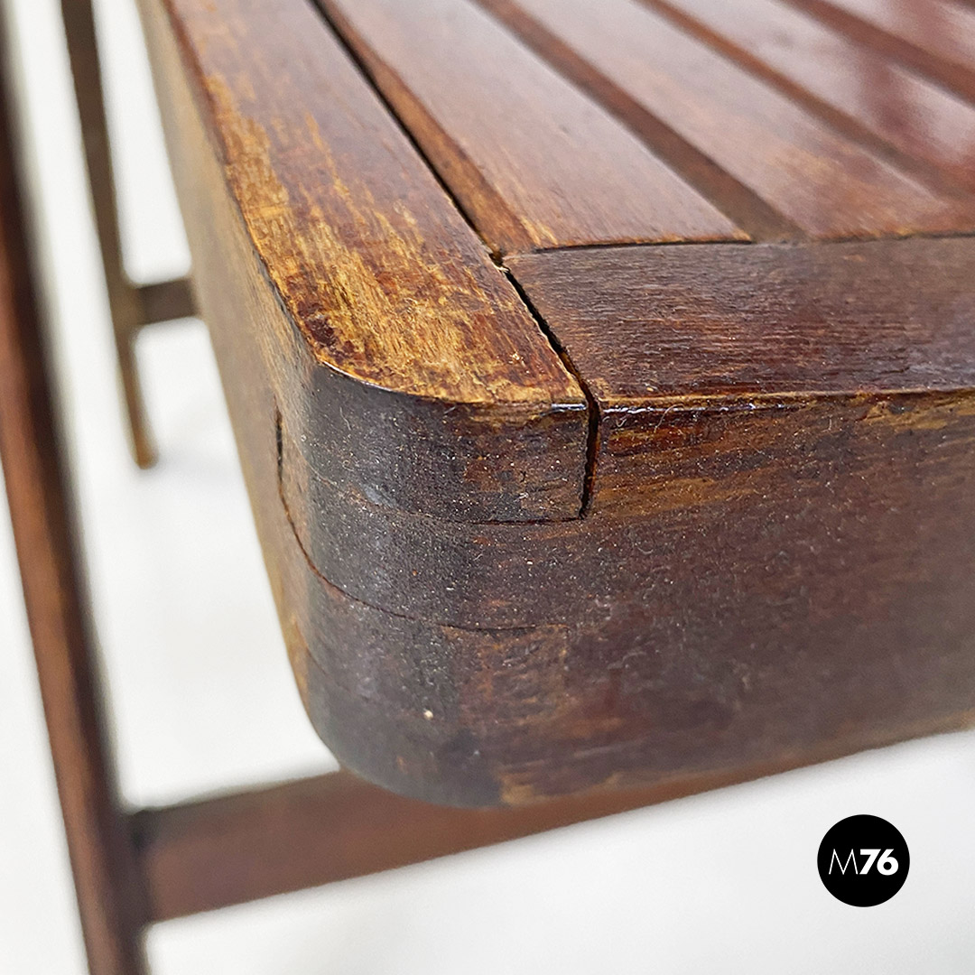 Set di tre sedie pieghevoli con struttura in legno massello di teak con seduta a listelli e doppio listello leggermente curvo sullo schienale.