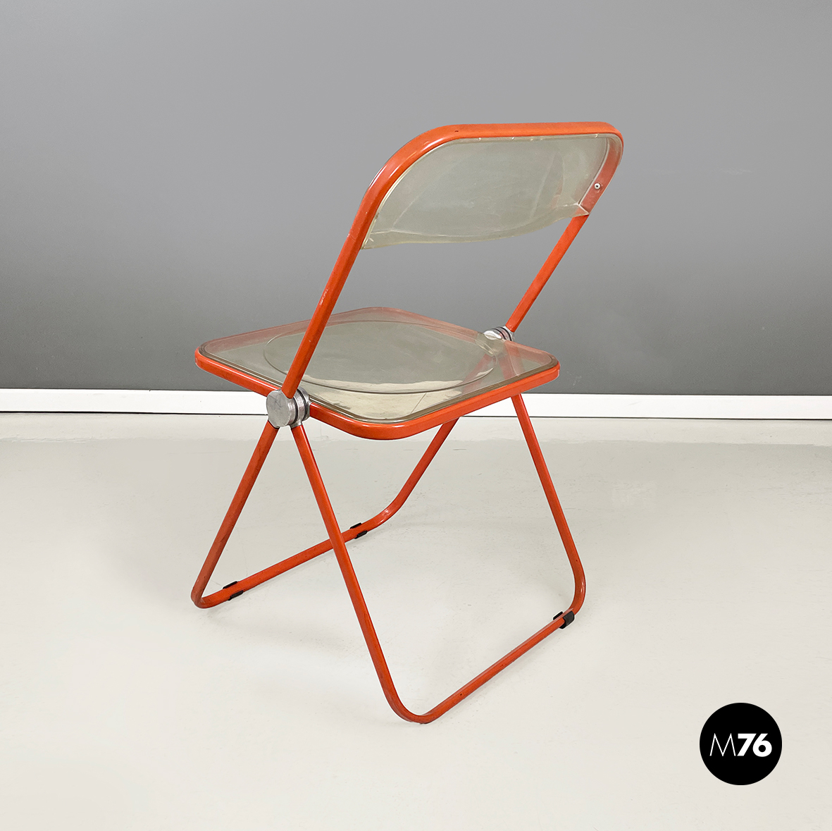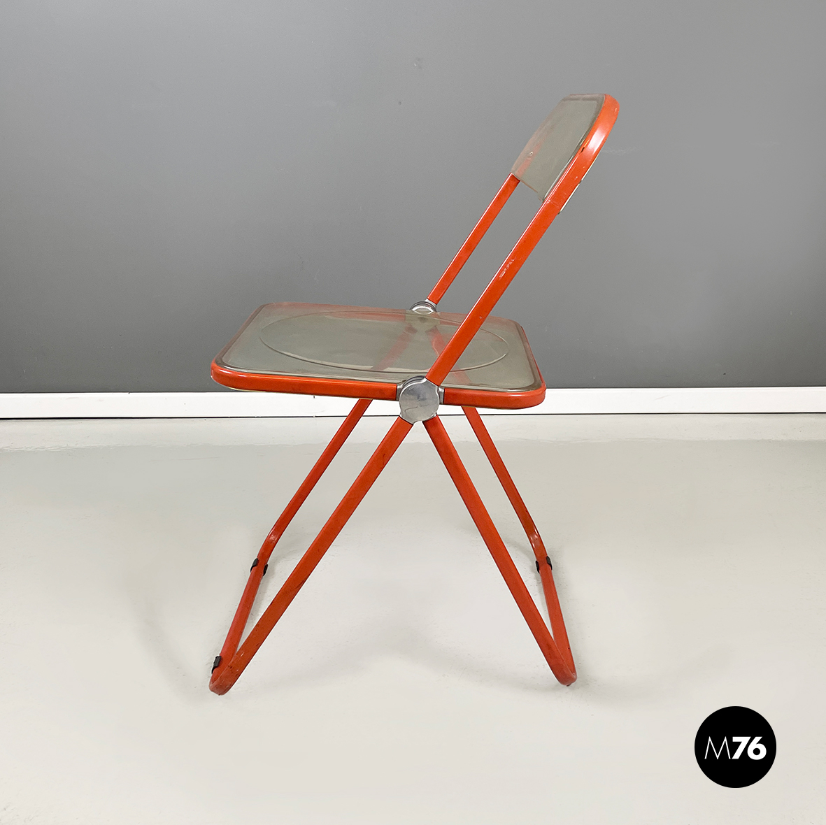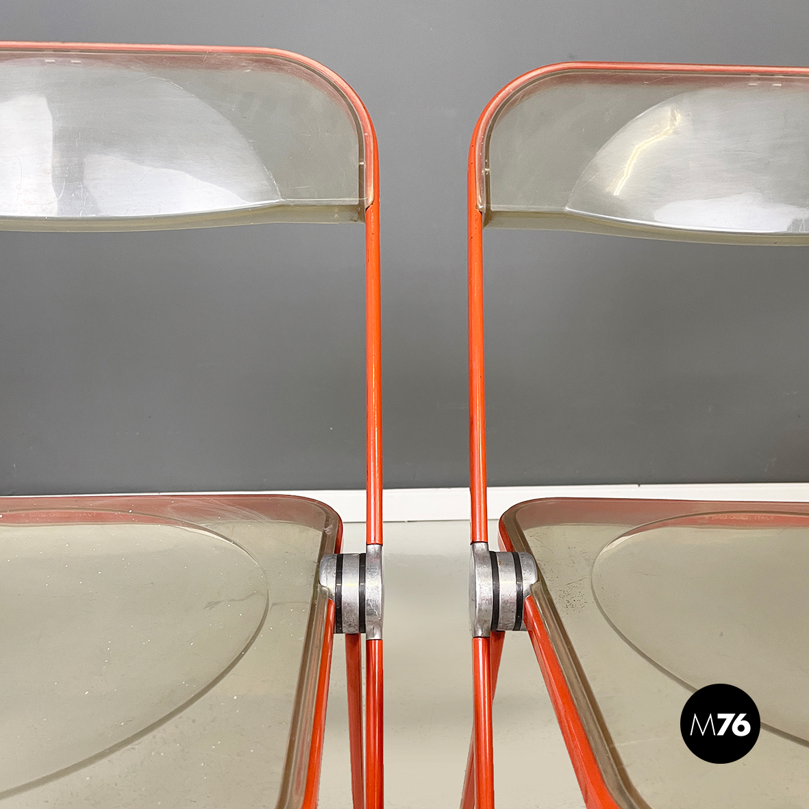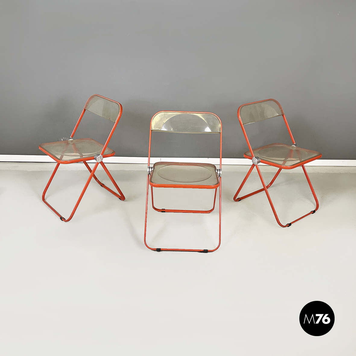 Set di tre sedie pieghevoli modello Plia con seduta e schienale squadrati in plastica abs trasparente ingiallita. La struttura è in acciaio verniciato rosso-arancio.