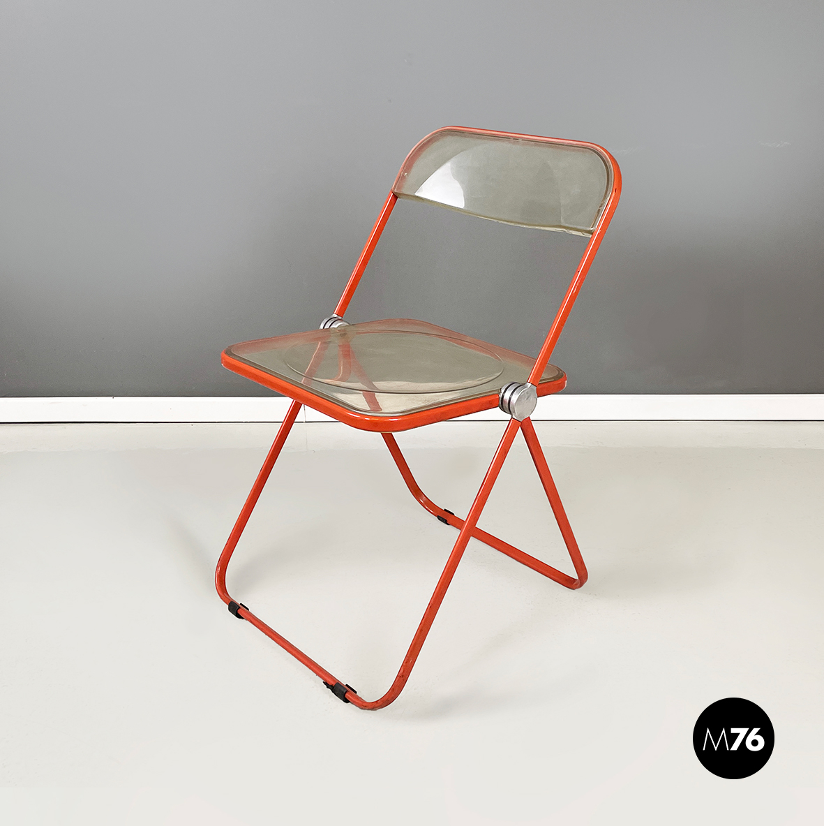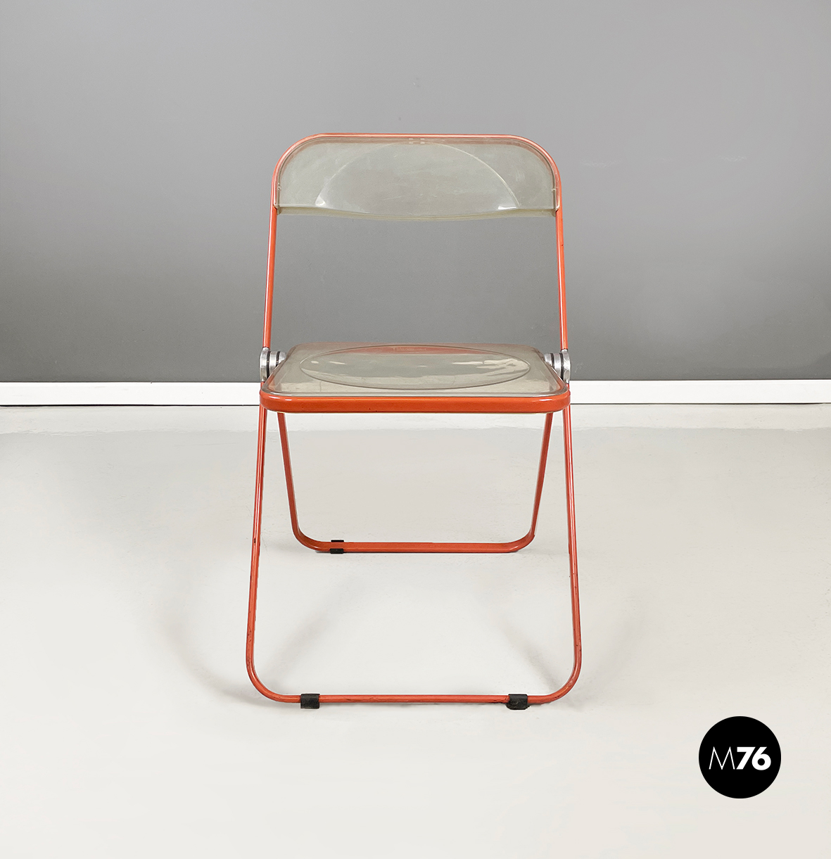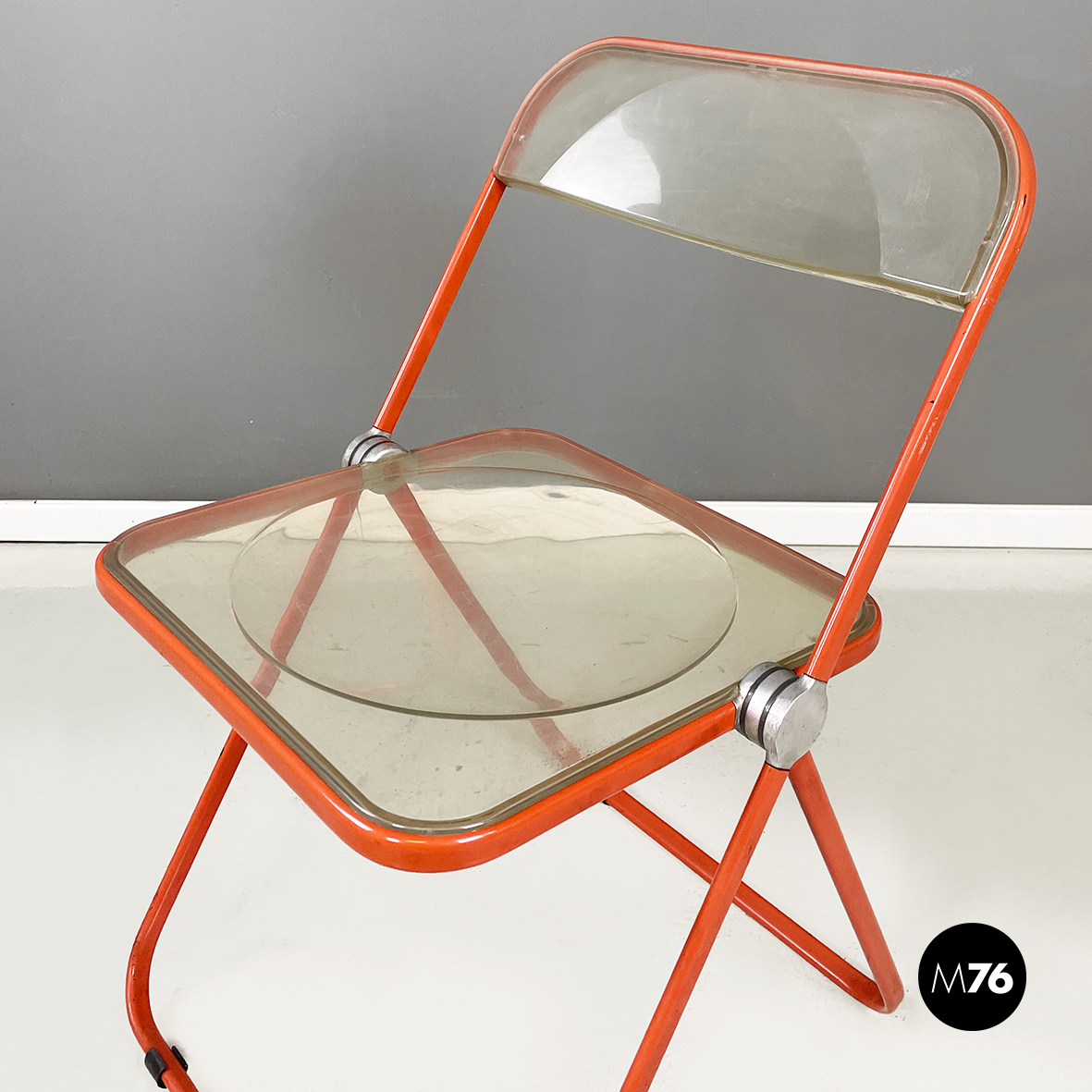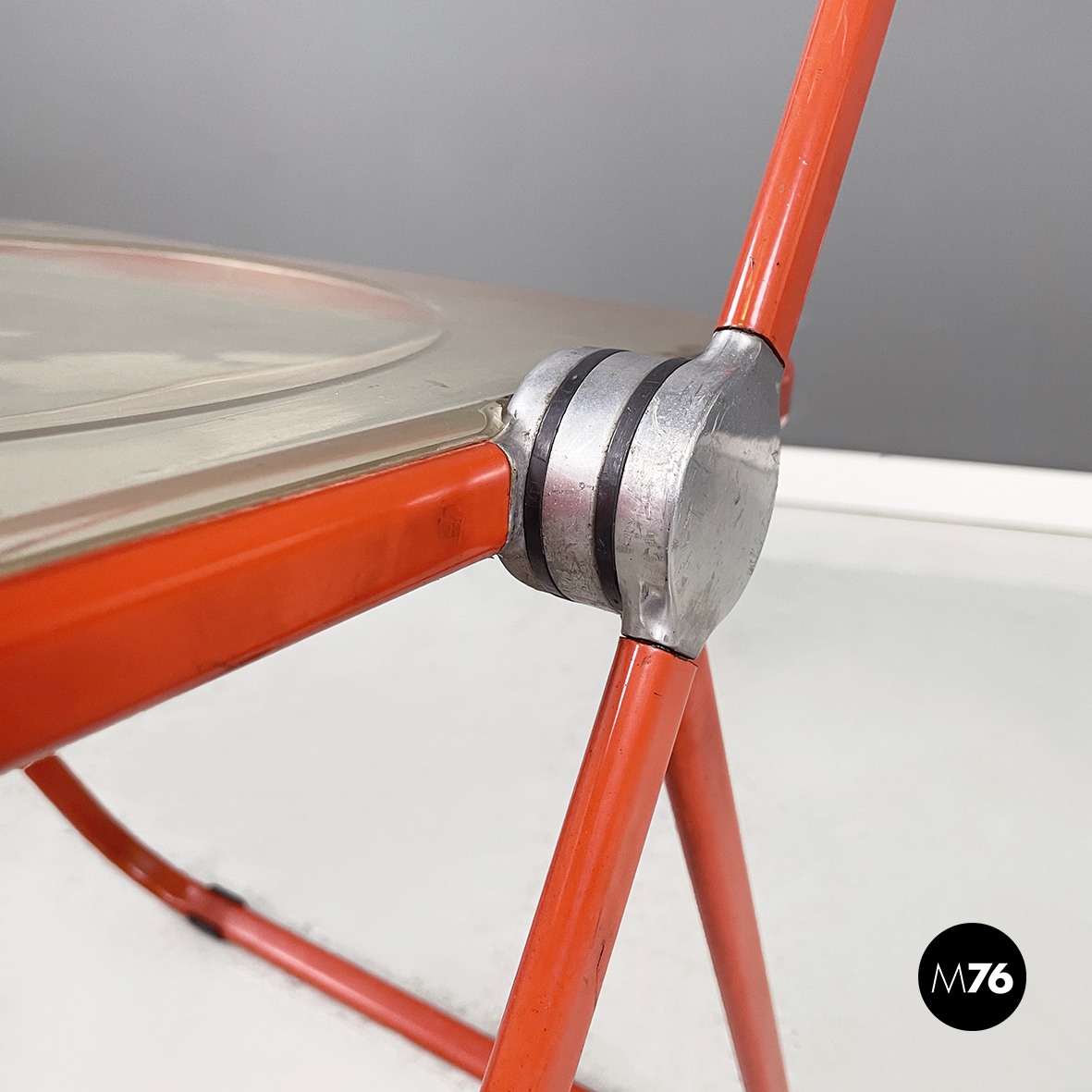 Set di tre sedie pieghevoli modello Plia con seduta e schienale squadrati in plastica abs trasparente ingiallita. La struttura è in acciaio verniciato rosso-arancio.