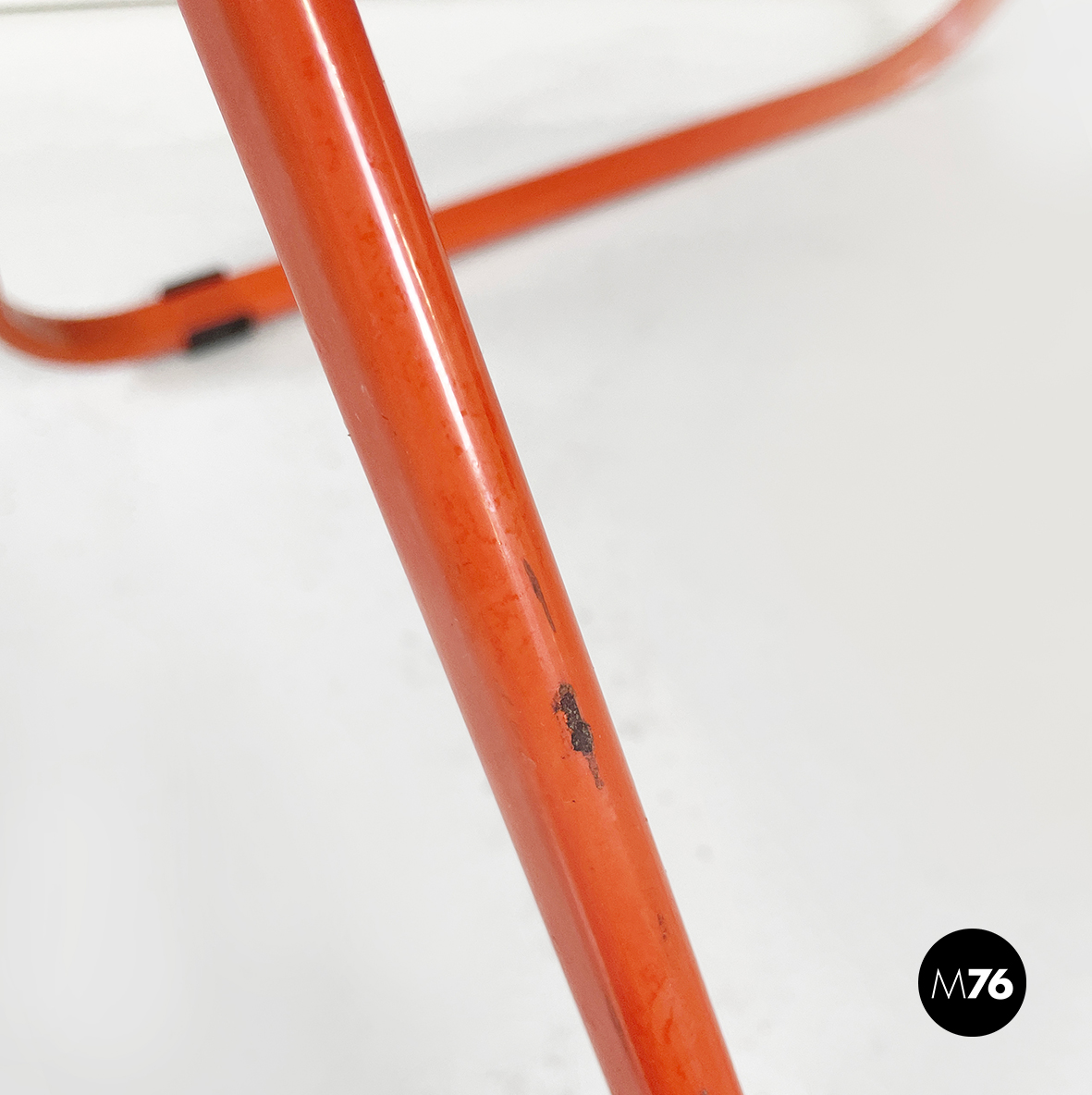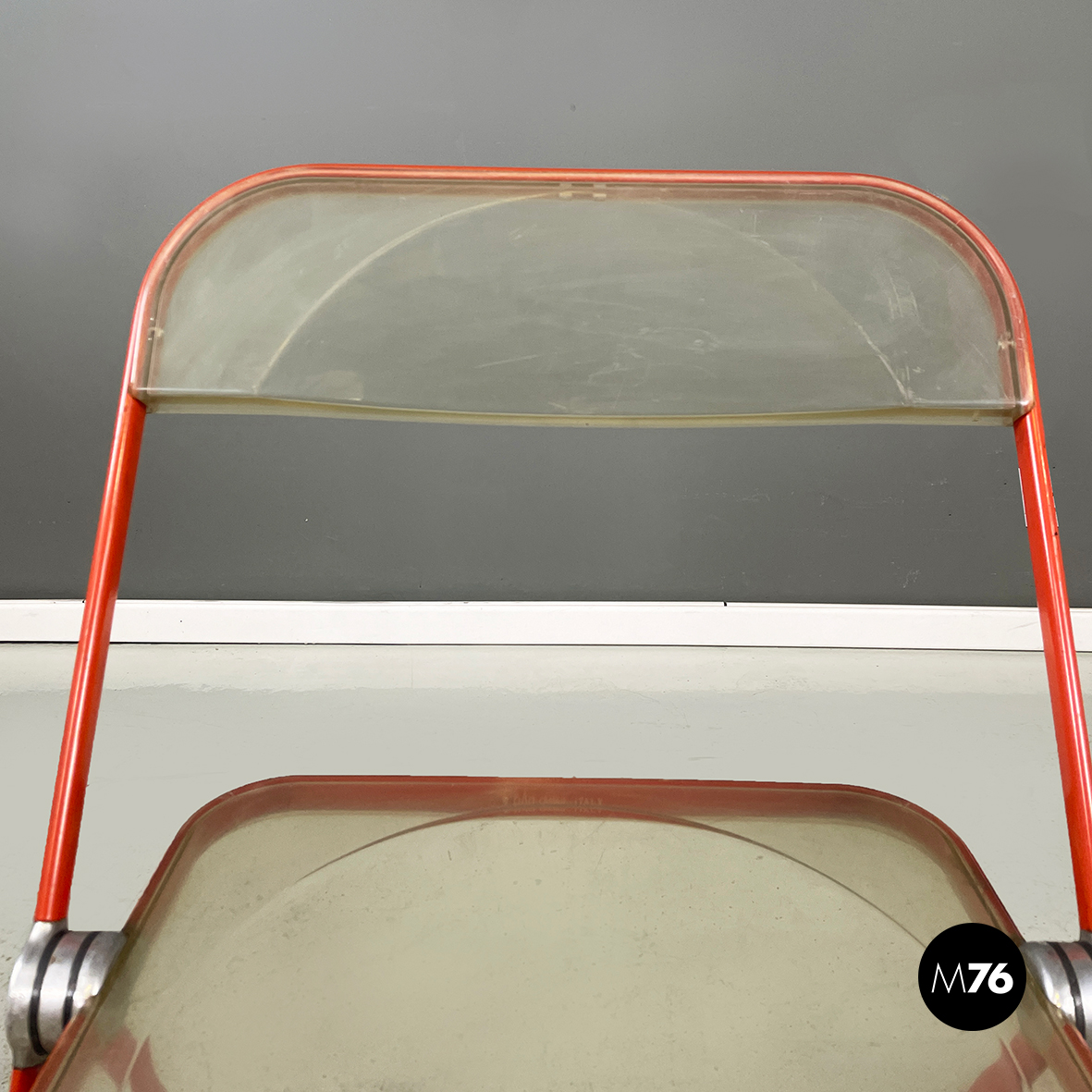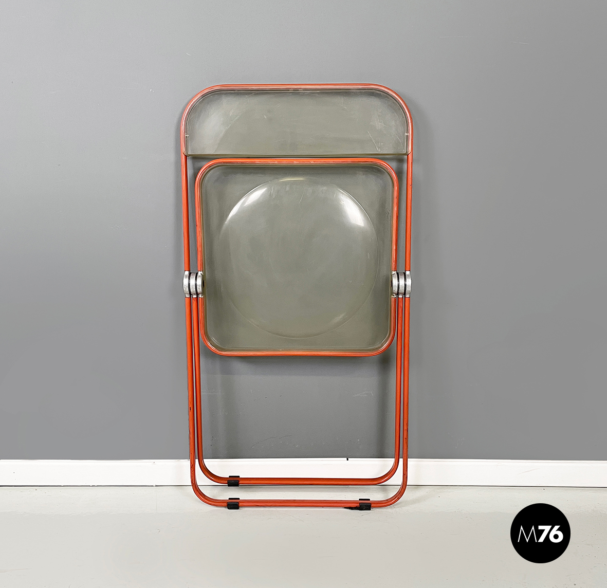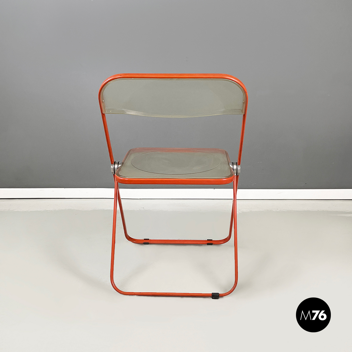 Set di tre sedie pieghevoli modello Plia con seduta e schienale squadrati in plastica abs trasparente ingiallita. La struttura è in acciaio verniciato rosso-arancio.