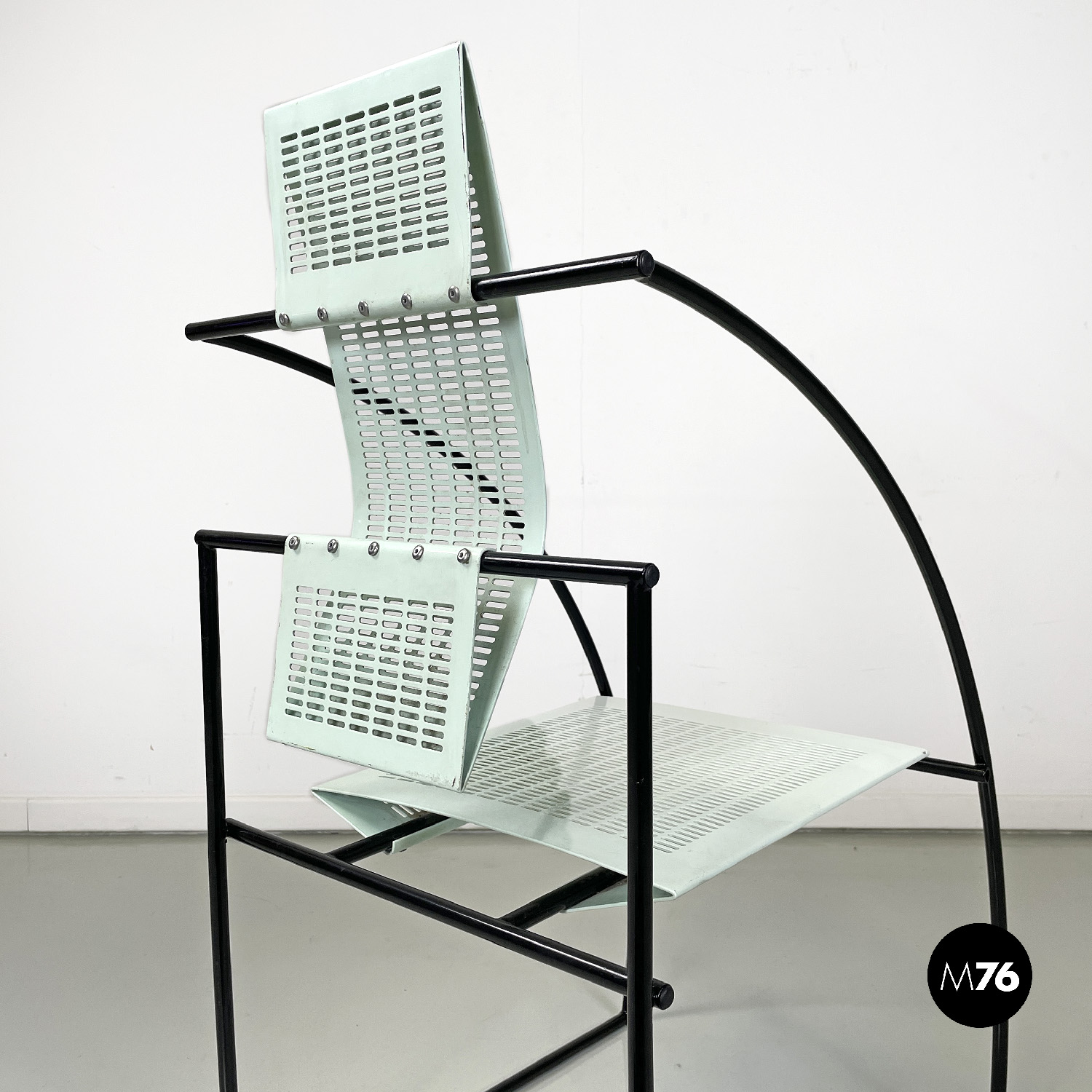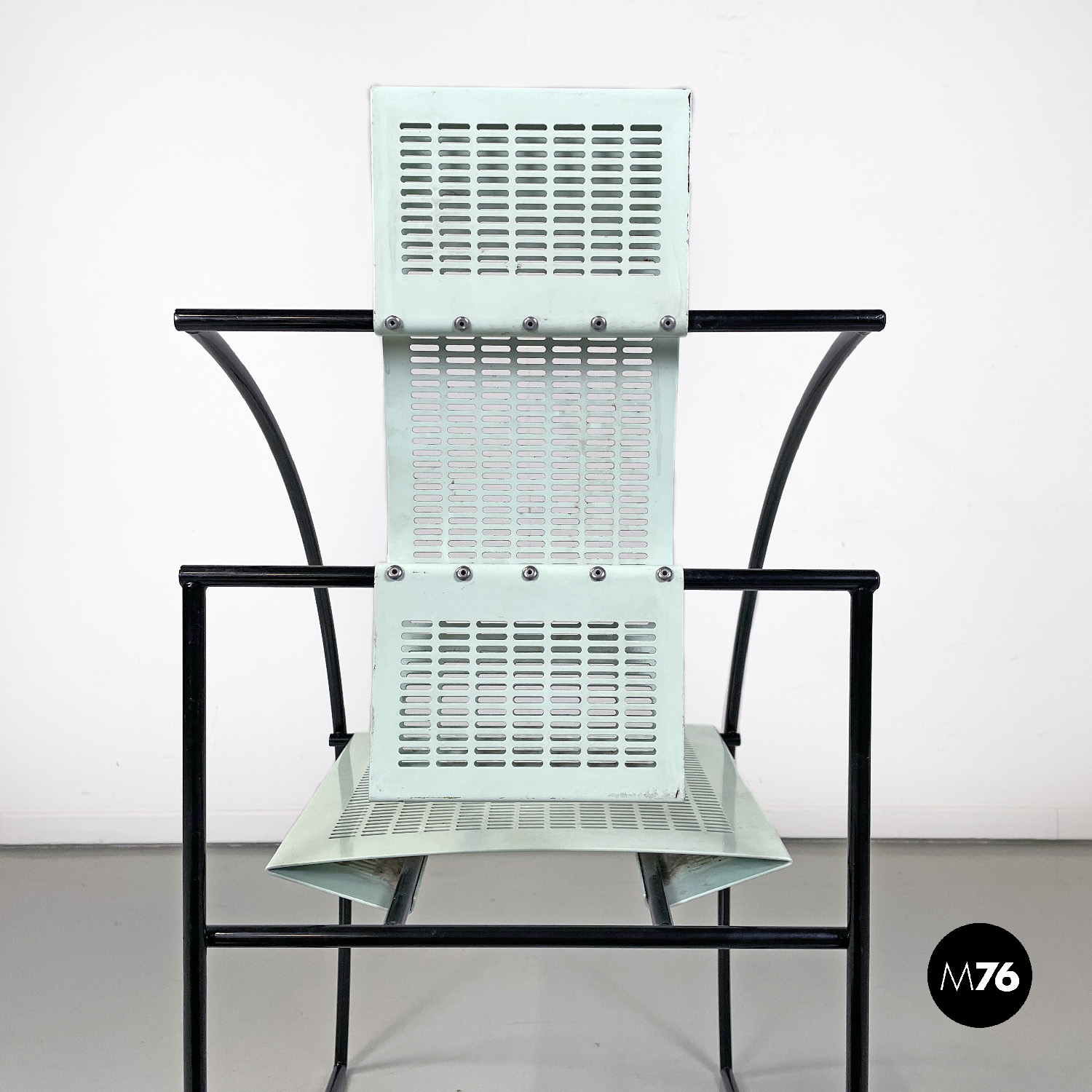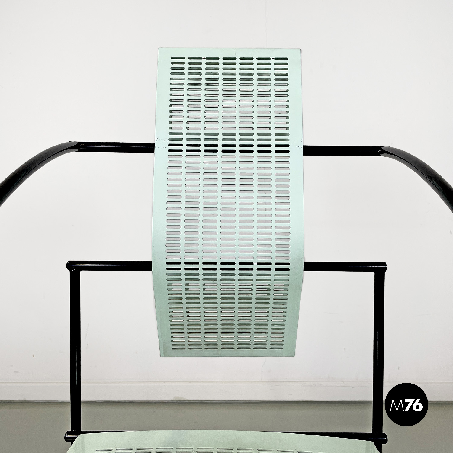Coppia di sedie modello Quinta 605 in metallo. La seduta e lo schienale sono composte da una lastra di metallo microforato laccato verde acqua con finitura lucida. La struttura geometrica che compone i braccioli e le gambe è data da un tondino di metallo laccato nero con finitura lucida.