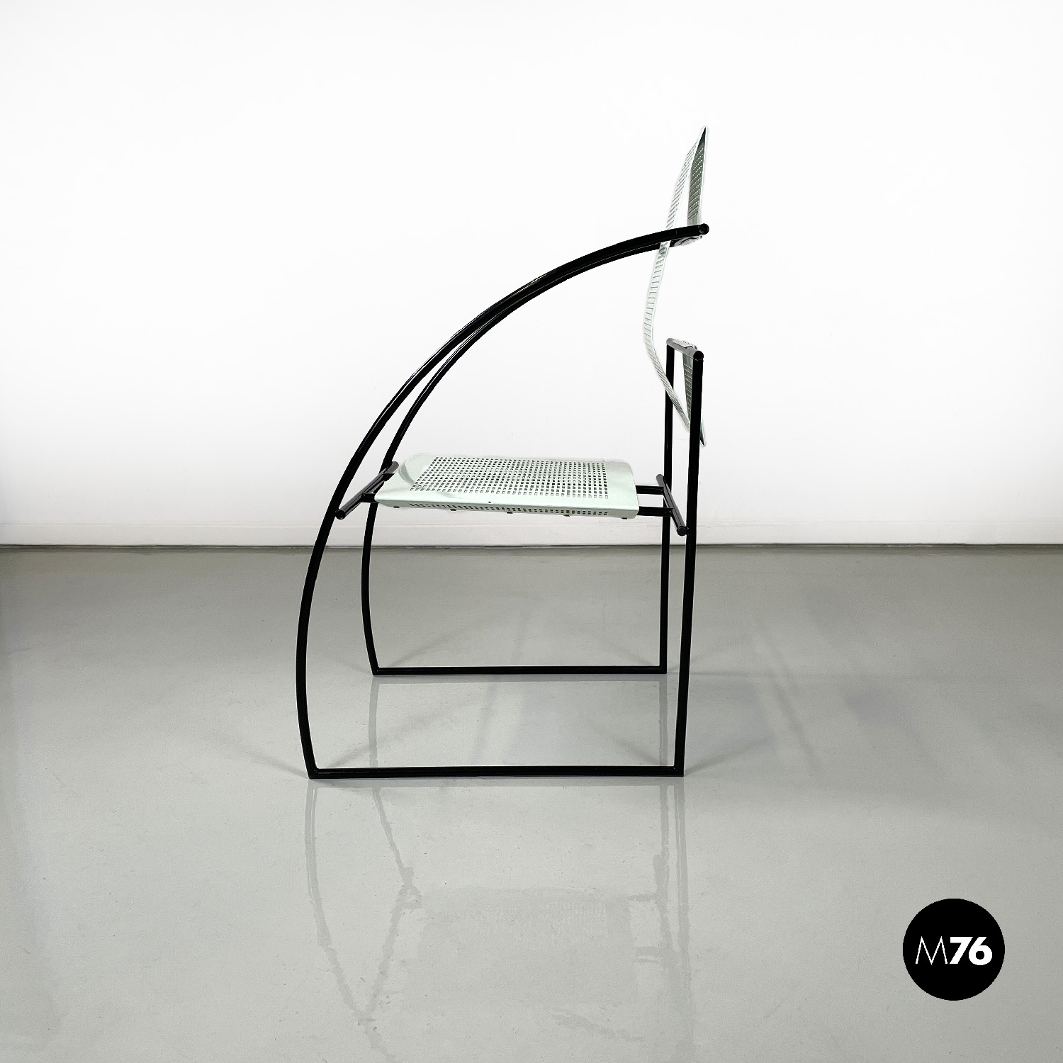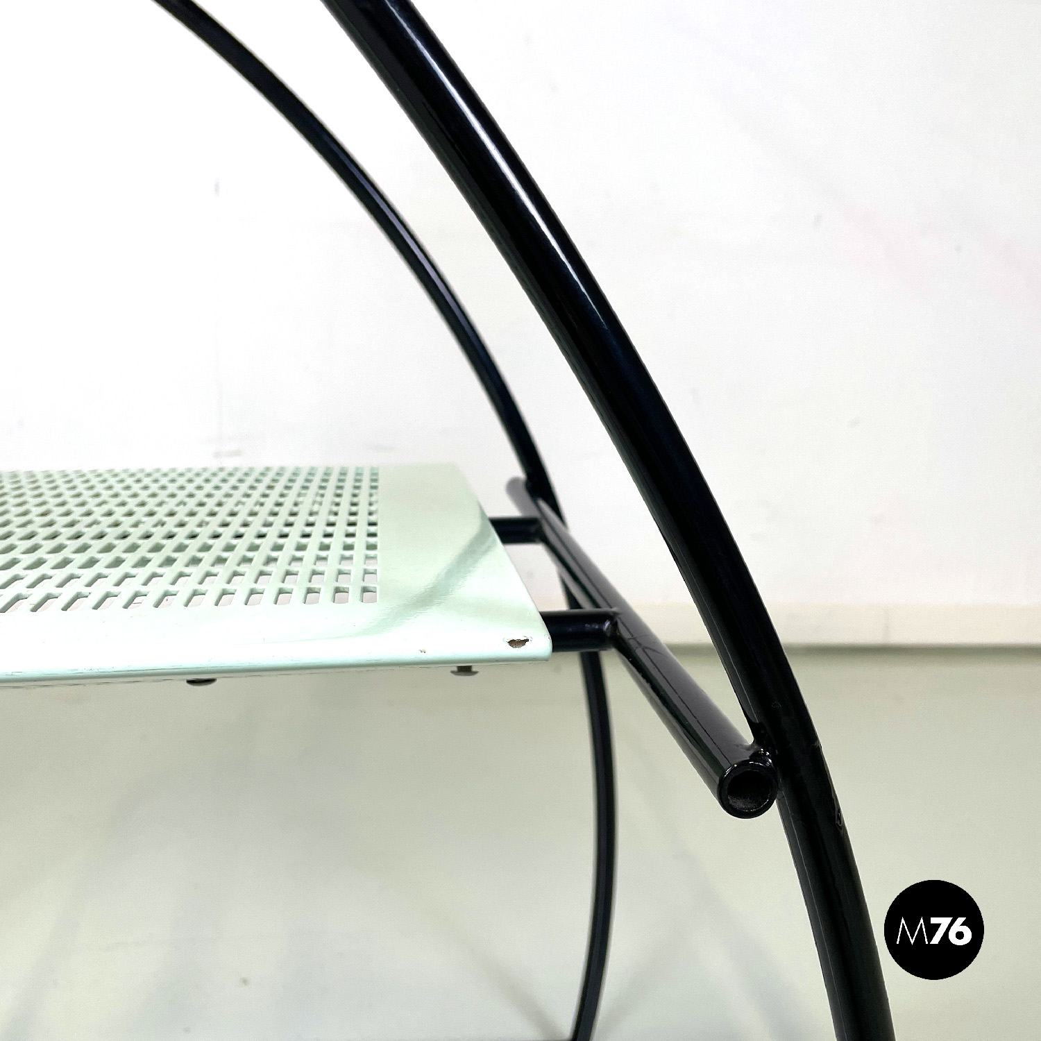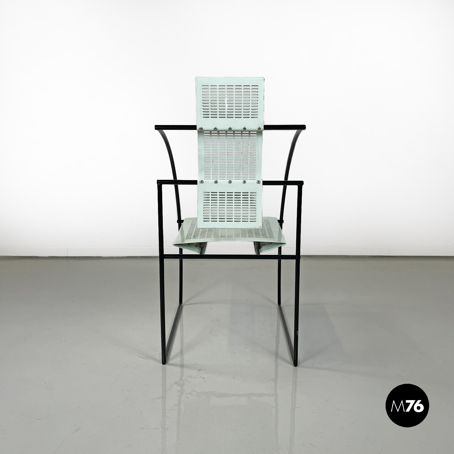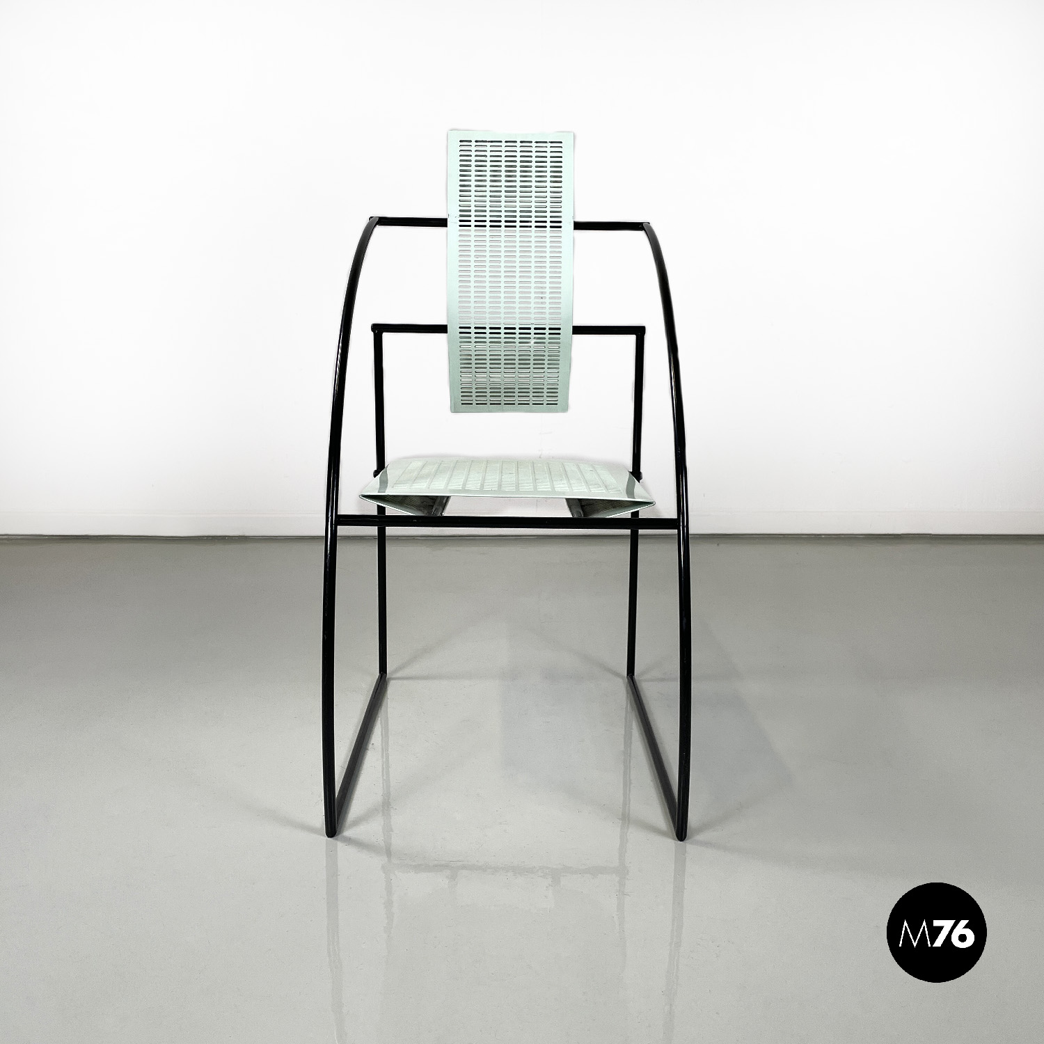 Coppia di sedie modello Quinta 605 in metallo. La seduta e lo schienale sono composte da una lastra di metallo microforato laccato verde acqua con finitura lucida. La struttura geometrica che compone i braccioli e le gambe è data da un tondino di metallo laccato nero con finitura lucida.