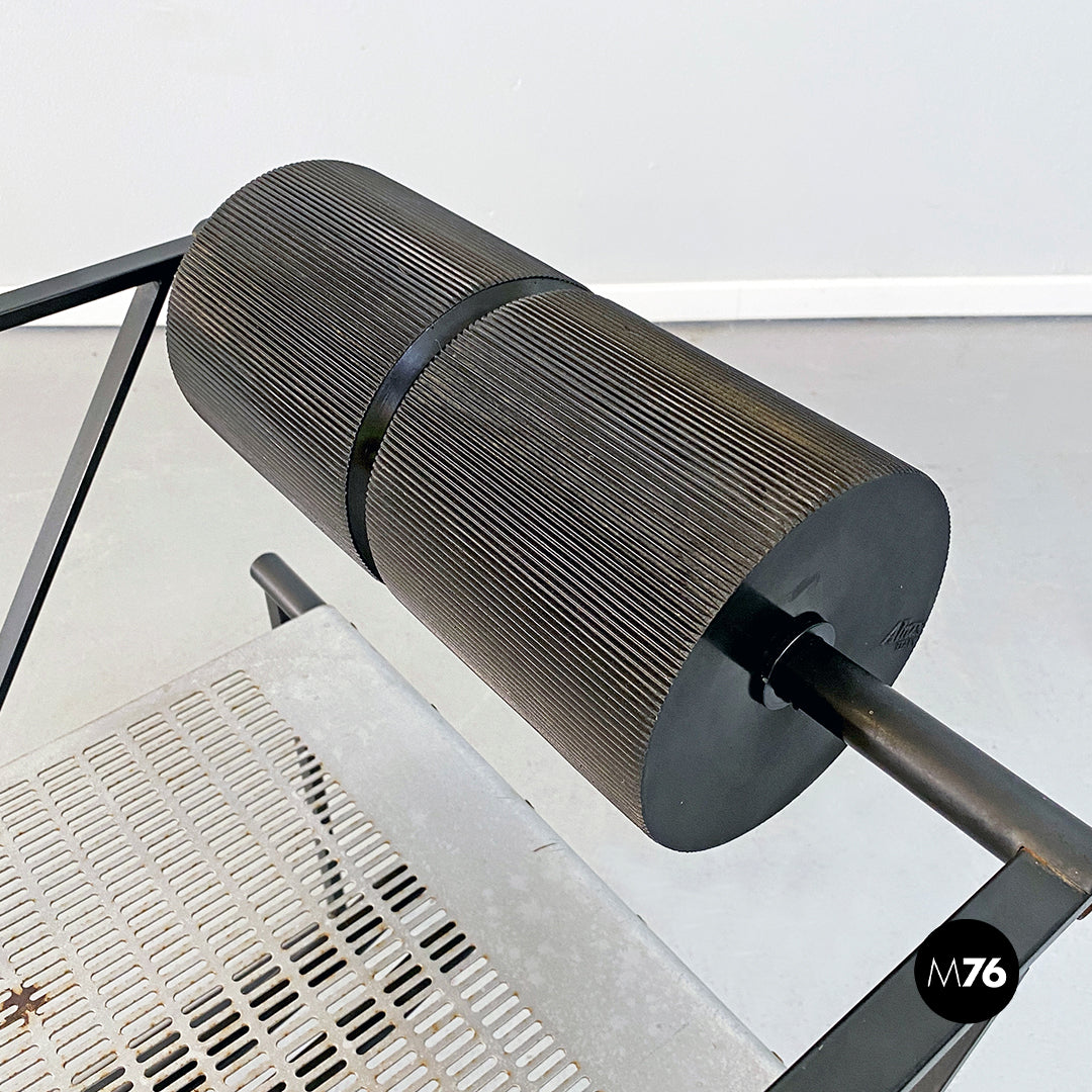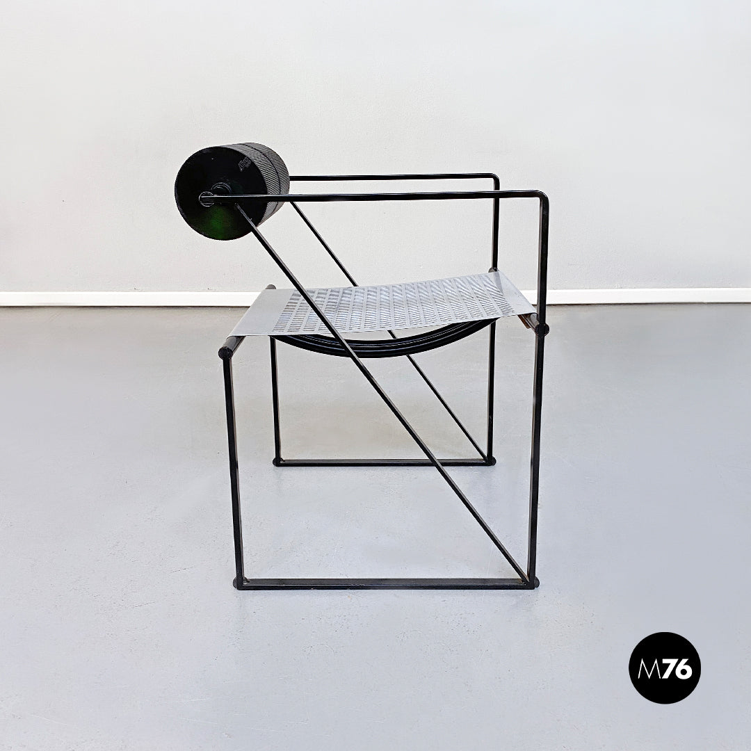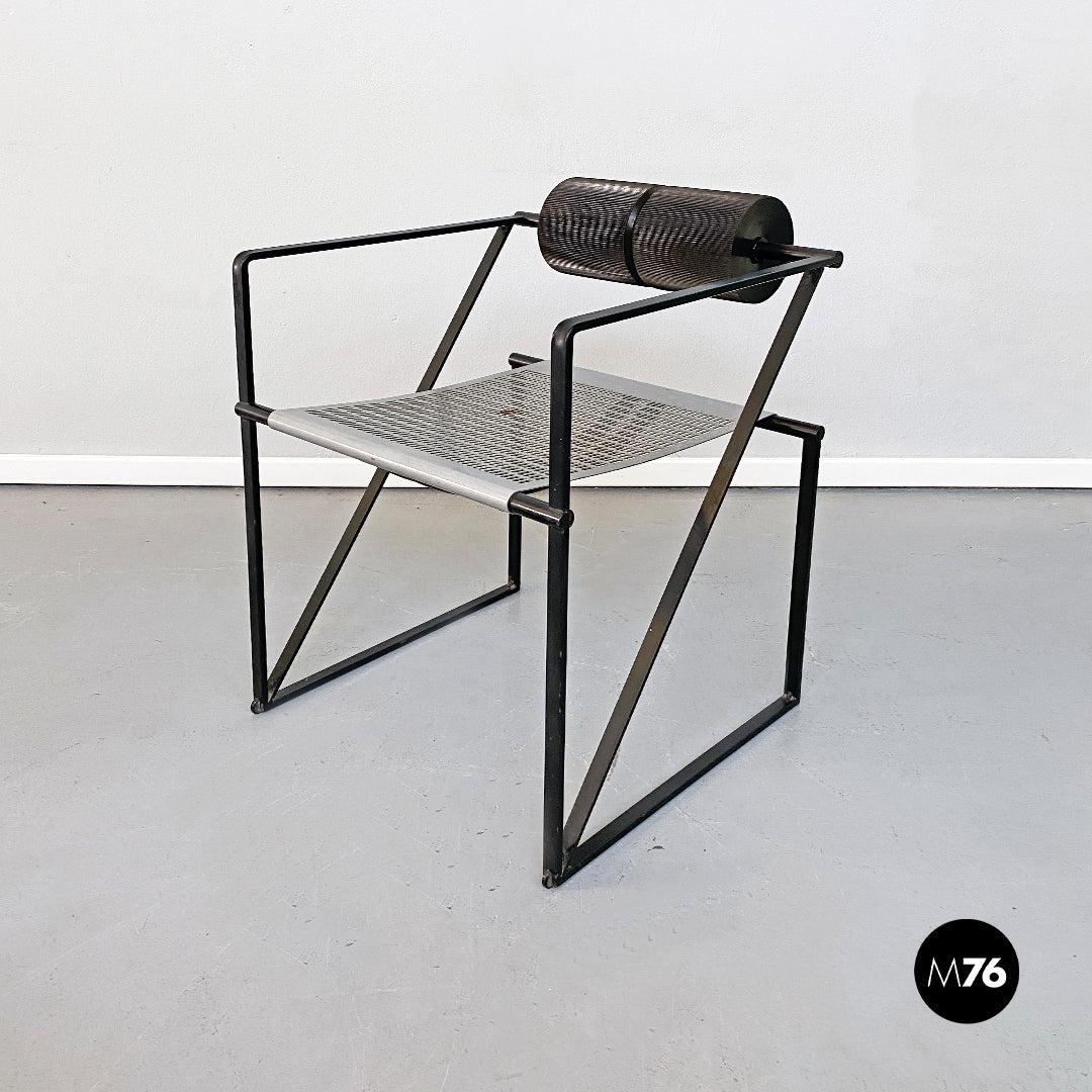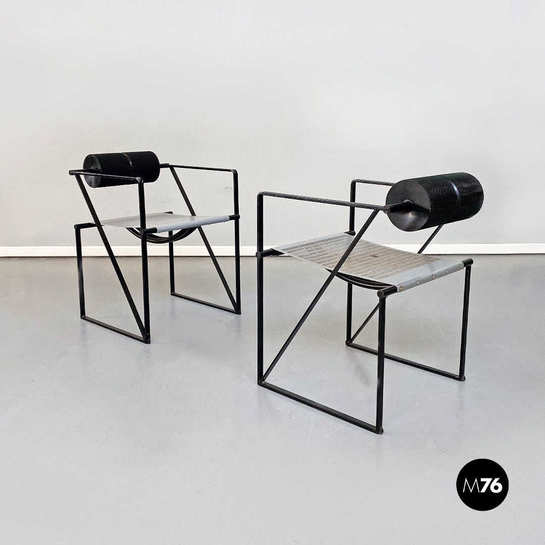 Coppia di sedie modello Seconda realizzate con una struttura in acciaio verniciato nero lucido seduta in lamiera d’acciaio forato e verniciato color grigio chiaro metallizzato e schienale costituito da un semplice elemento cilindrico imbottito in poliuretano nero.