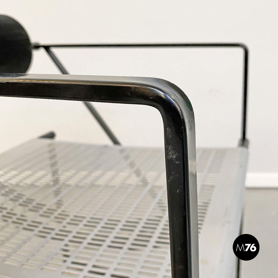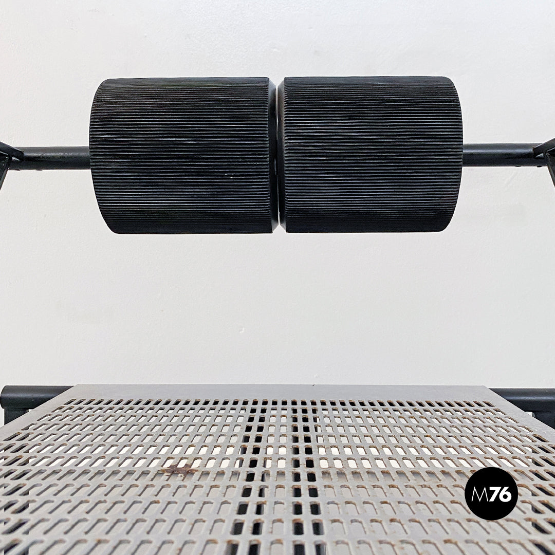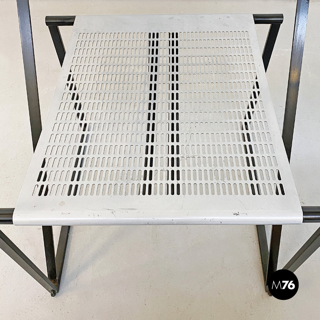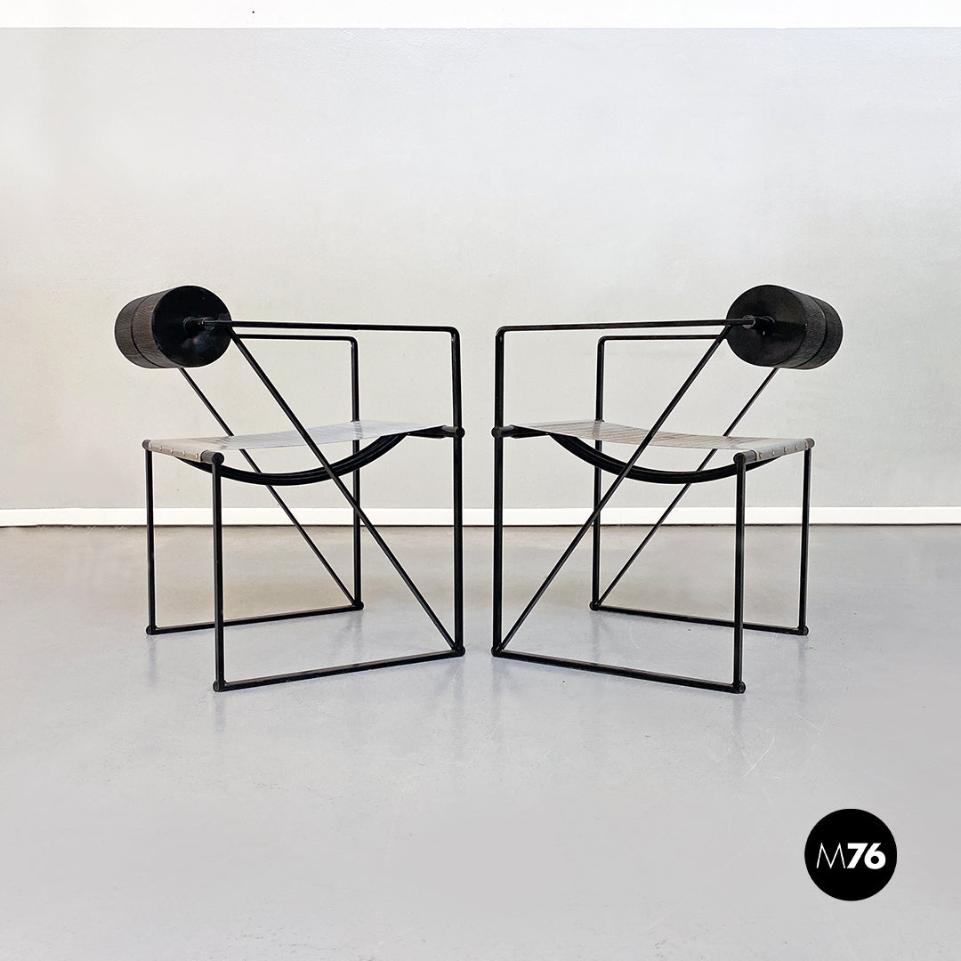Coppia di sedie modello Seconda realizzate con una struttura in acciaio verniciato nero lucido seduta in lamiera d’acciaio forato e verniciato color grigio chiaro metallizzato e schienale costituito da un semplice elemento cilindrico imbottito in poliuretano nero.