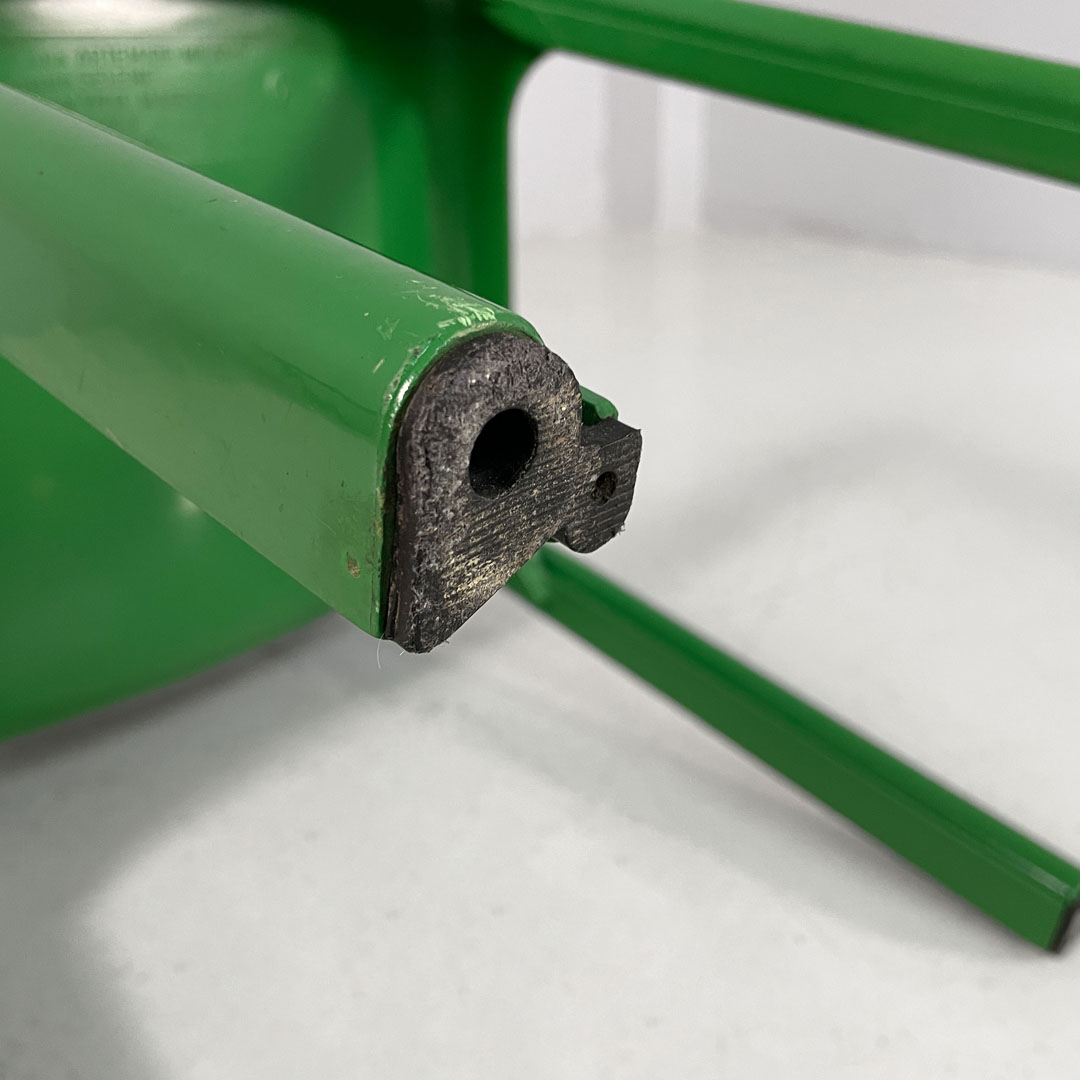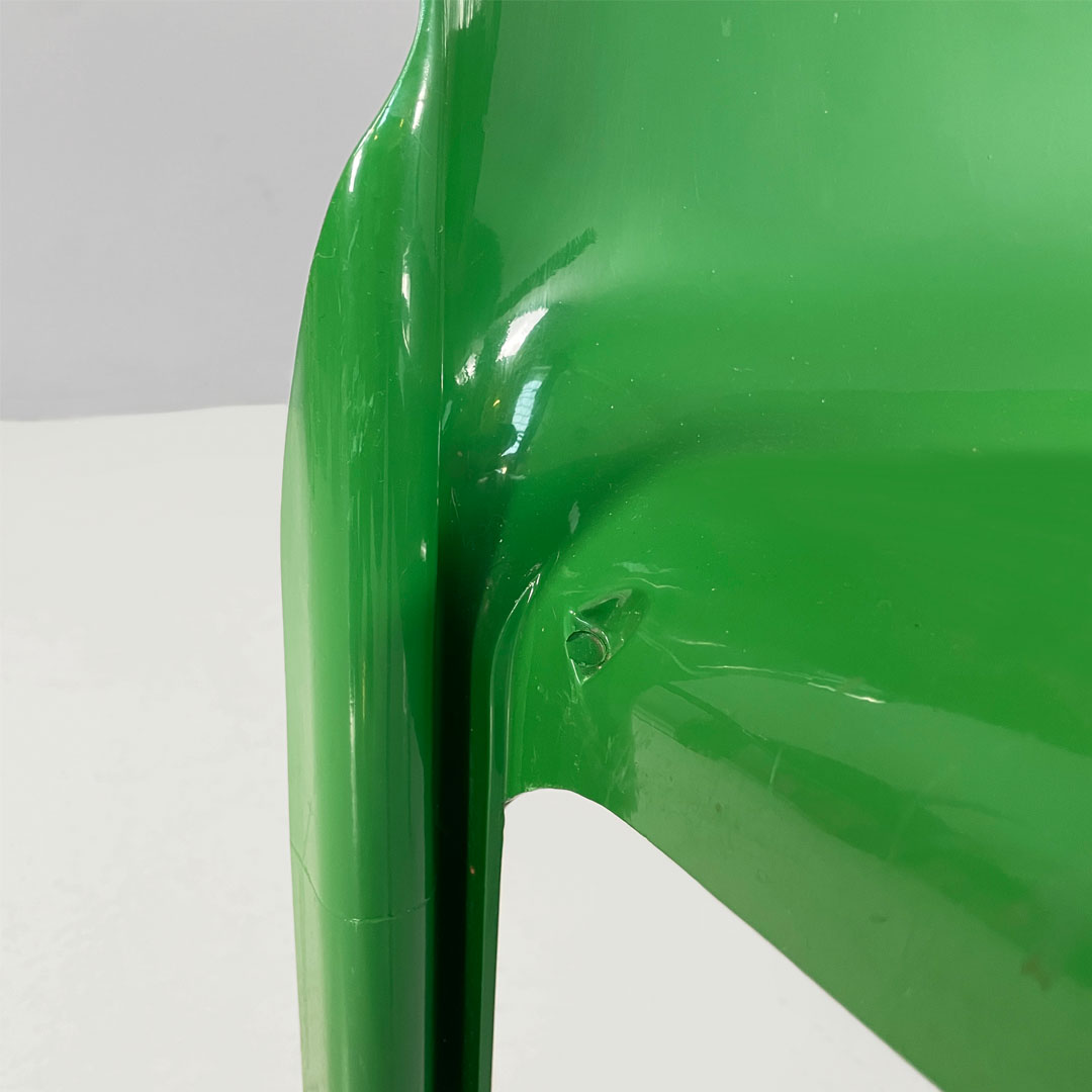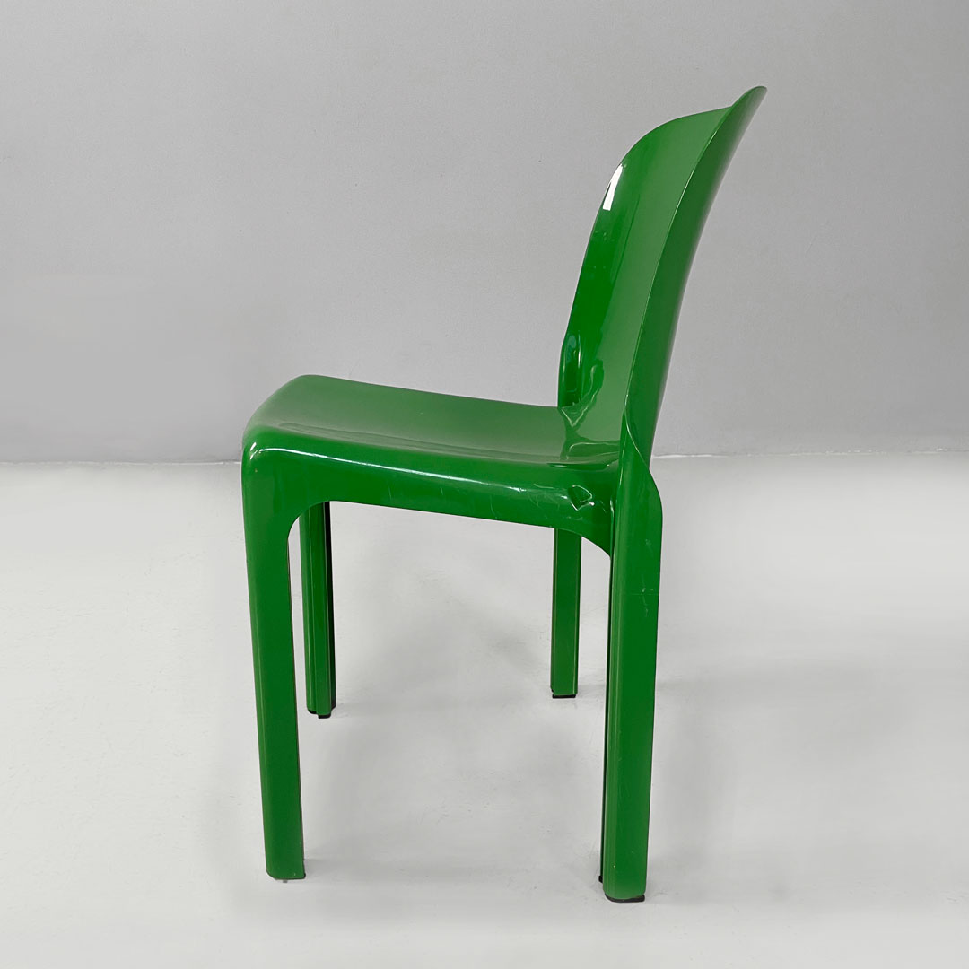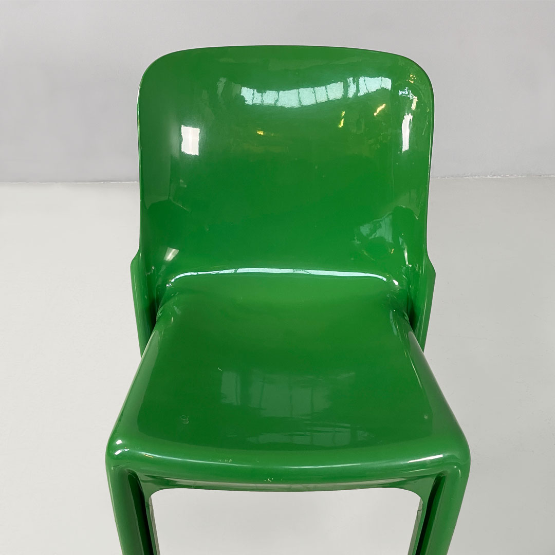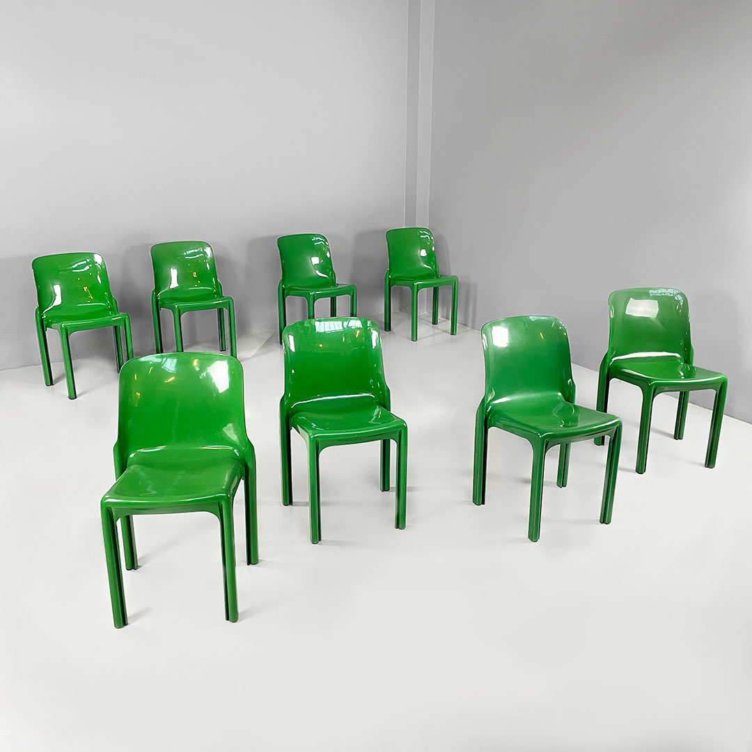 Set di otto sedie modello Selene in plastica verde con seduta quadrata. La struttura è a monoscocca con scanalature ad S lungo le zampe. Impilabili.