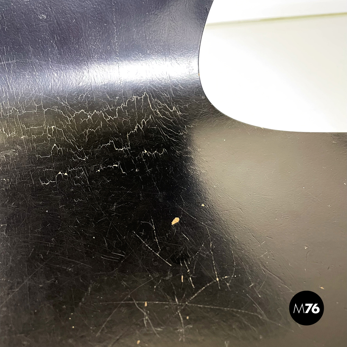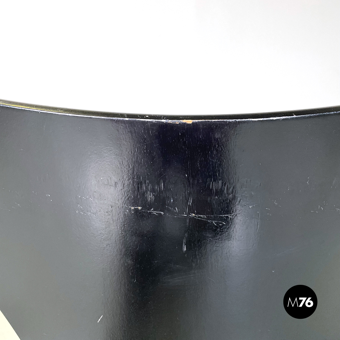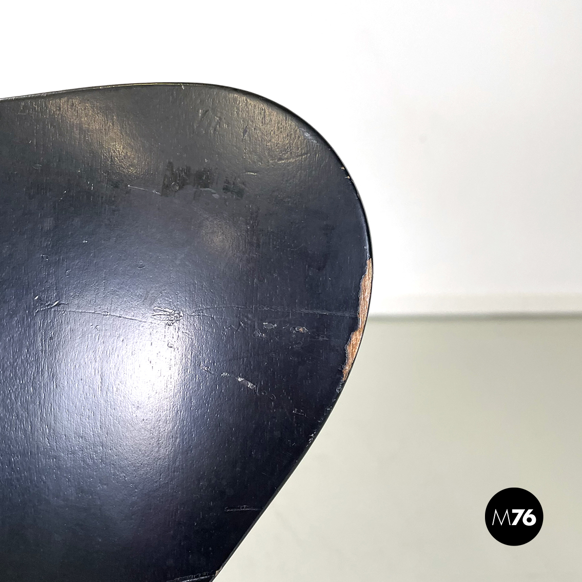 Set di quattro sedie modello 0465 o Serie 7 in legno verniciato nero. Le gambe sono in acciaio con piedini in gomma nera.