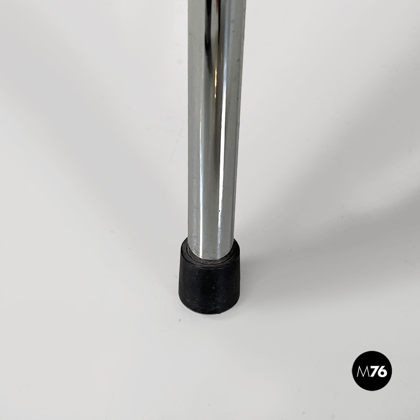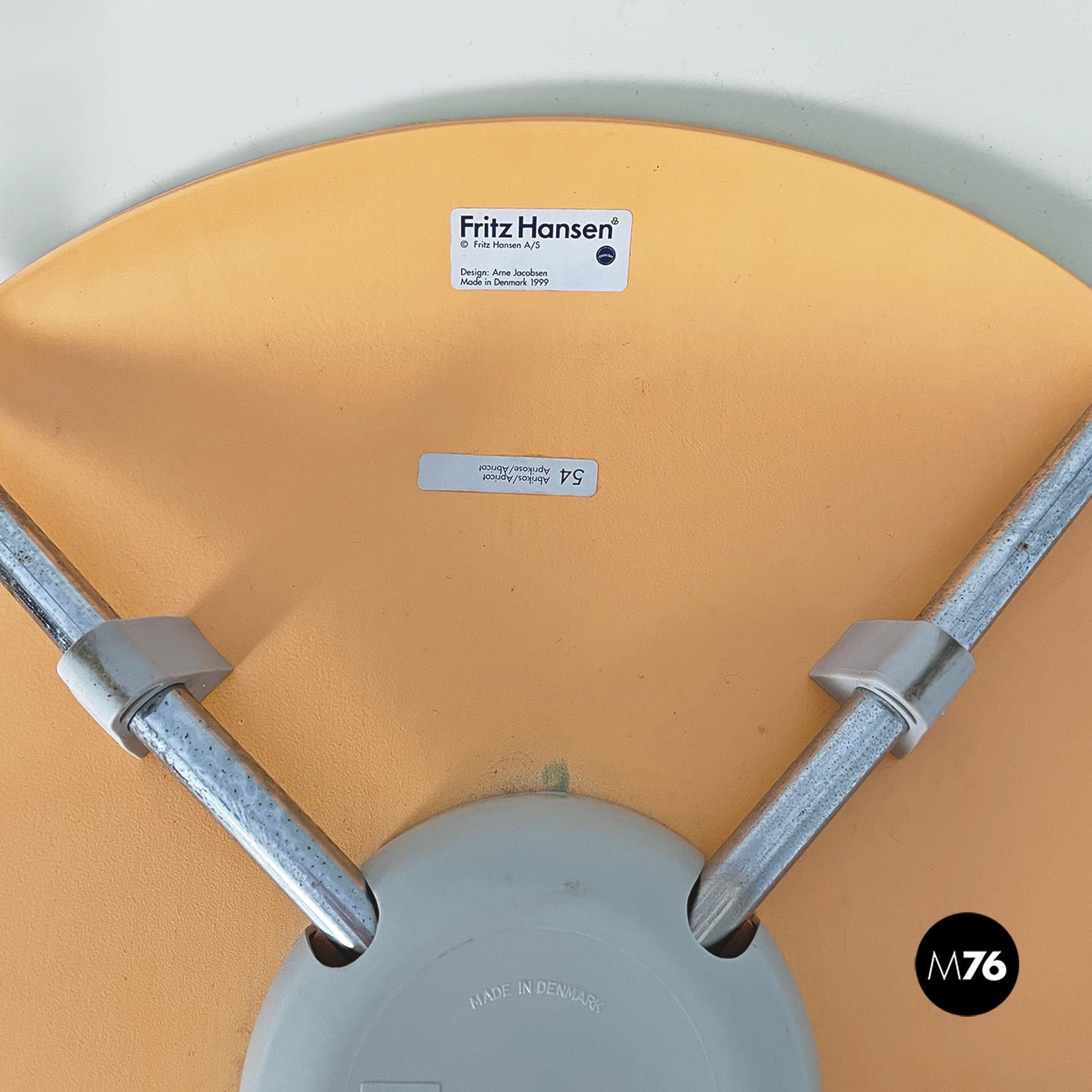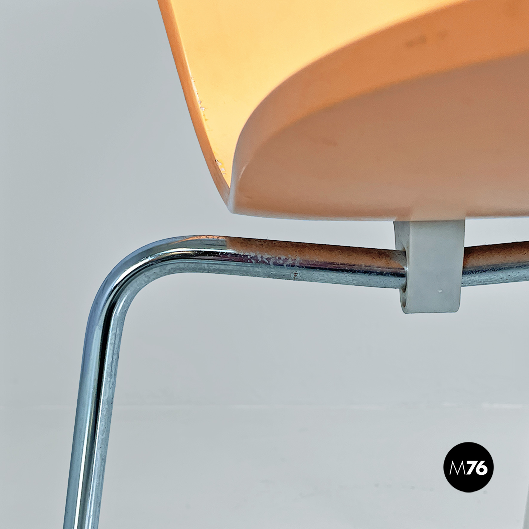 Sei sedie serie 7 danesi in legno verniciato arancione albicocca con gambe in accaiaio e piedini in gomma nera.
