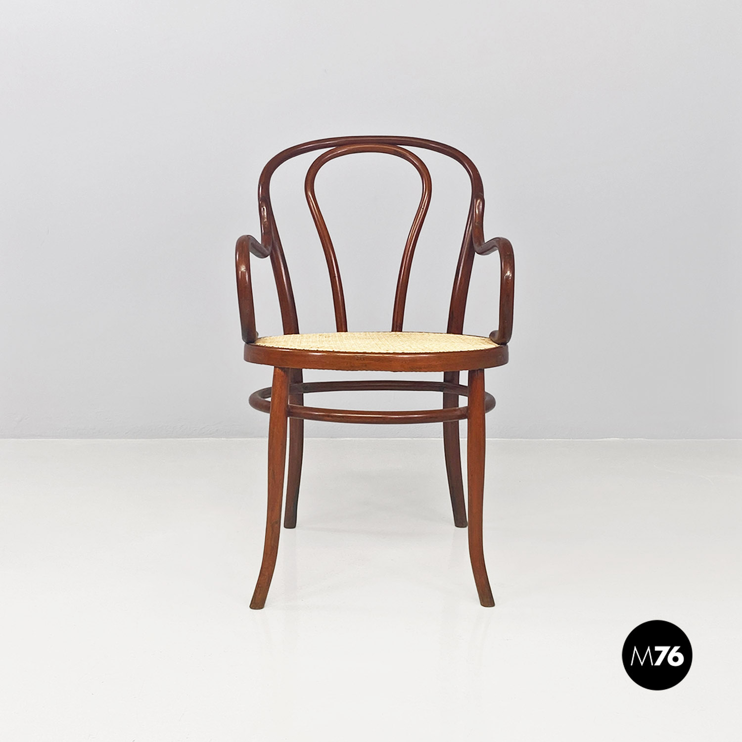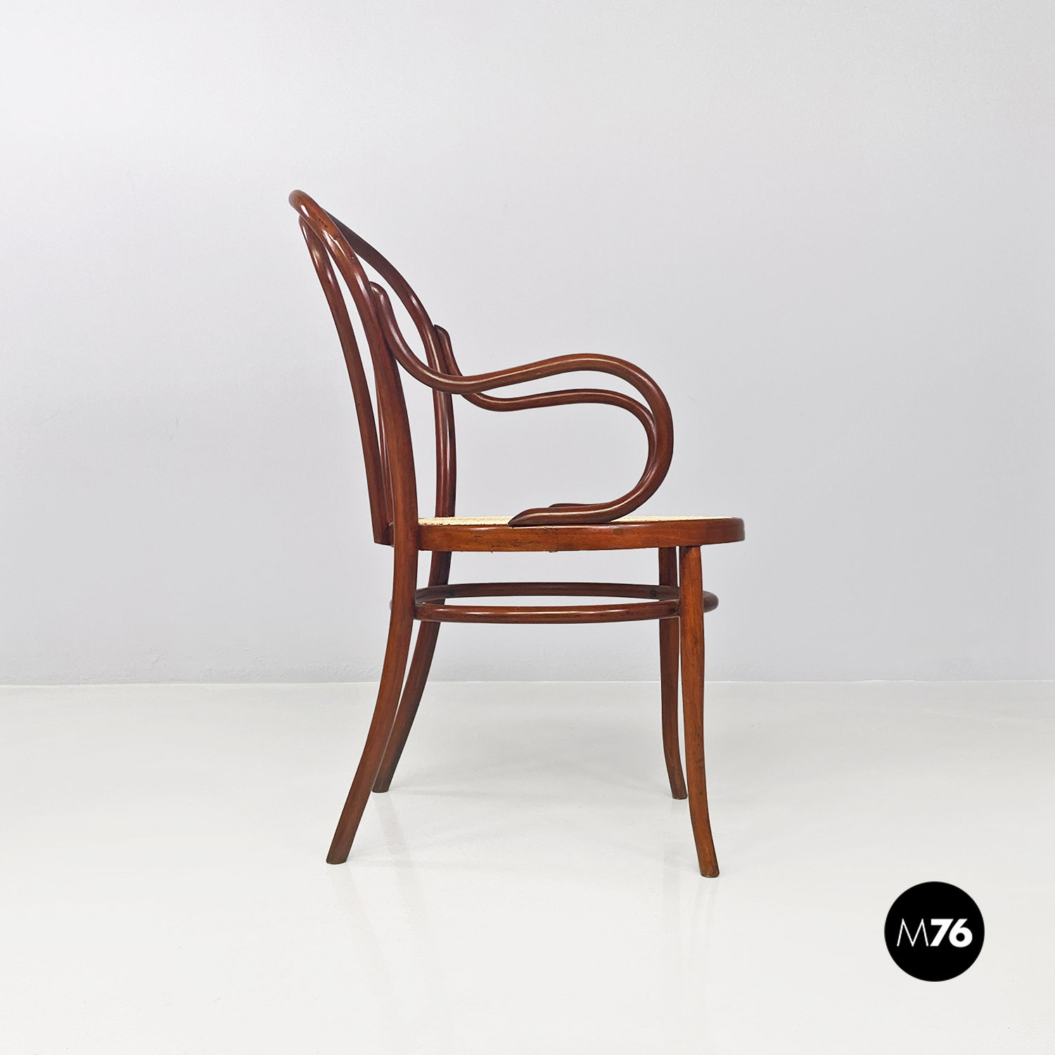 Sedie o poltroncine con braccioli con seduta in paglia di Vienna e braccioli curvati e con struttura in legno di faggio tinto noce.