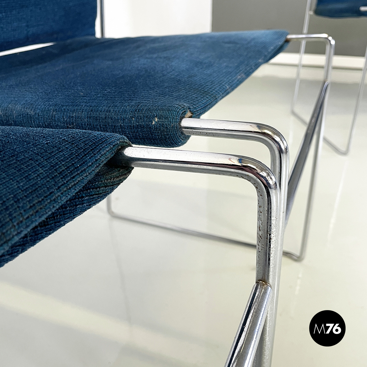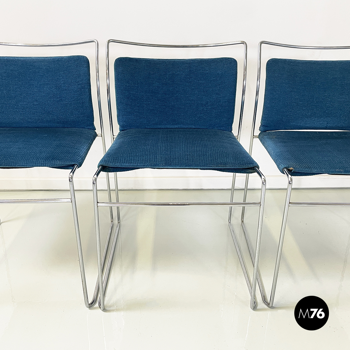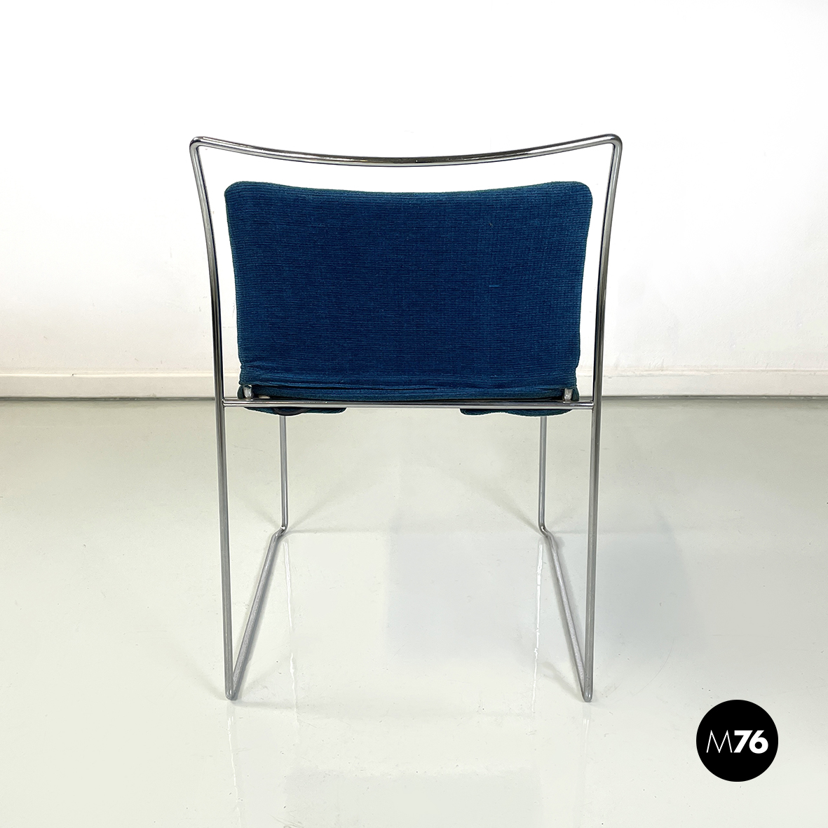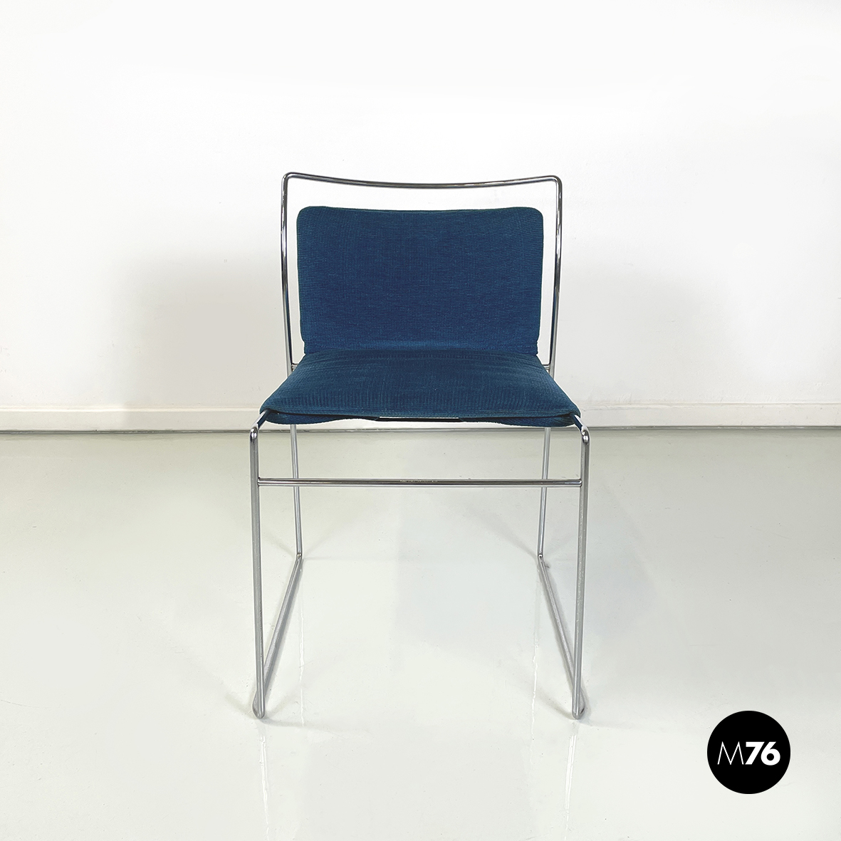 Set di sei sedie modello Tulu con seduta  e schienale rettangolari imbottiti e rivestiti in tessuto di velluto tramato blu originale. La struttura tondino di acciaio Il tessuto della seduta è sostenuta da sotto attraverso delle cinghie elastiche nere. Sedie impilabili.
