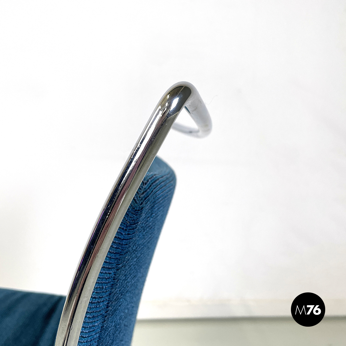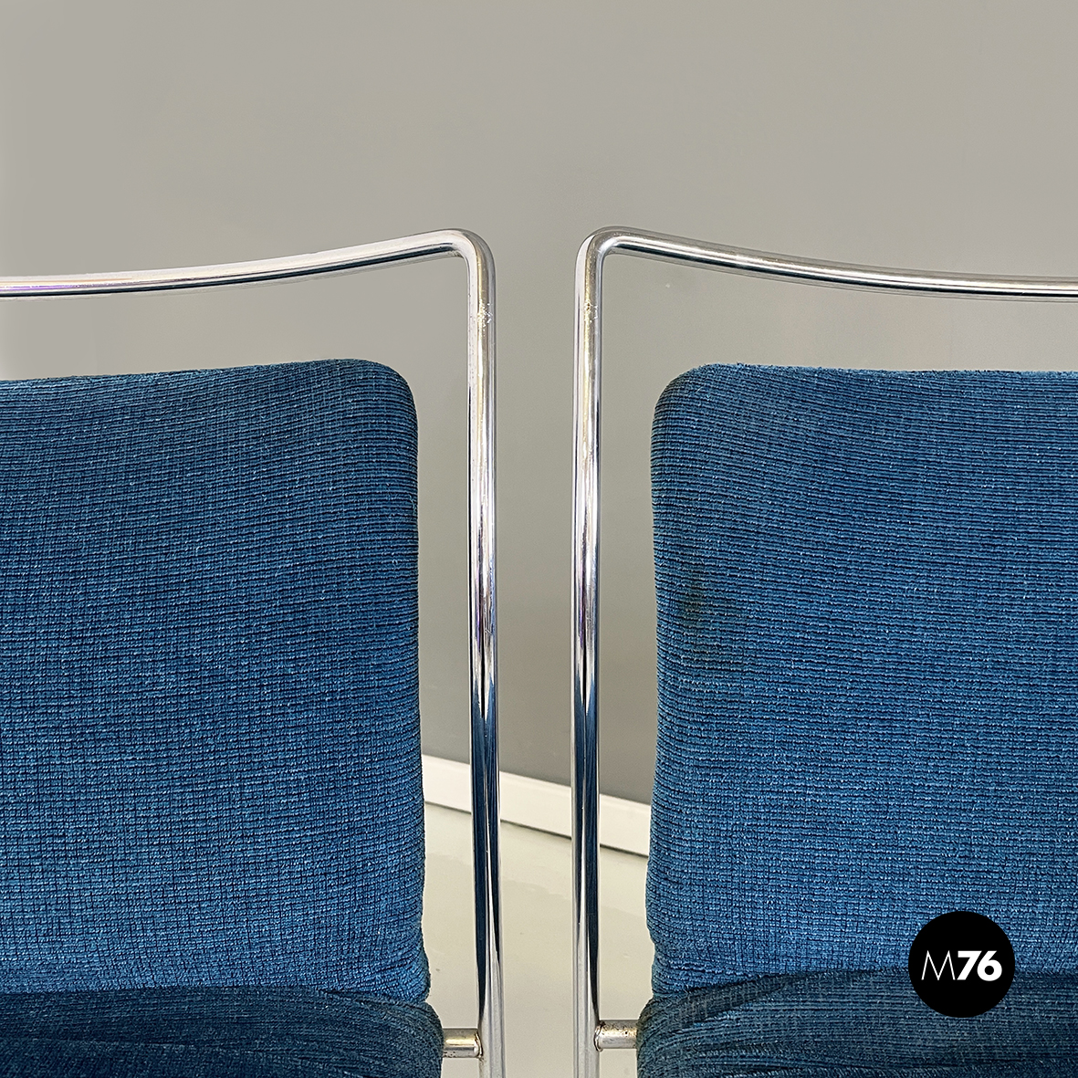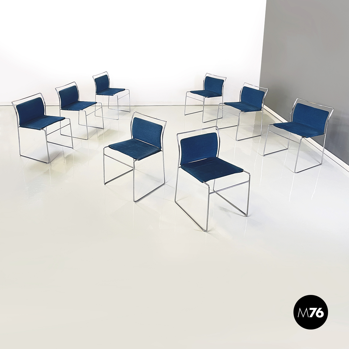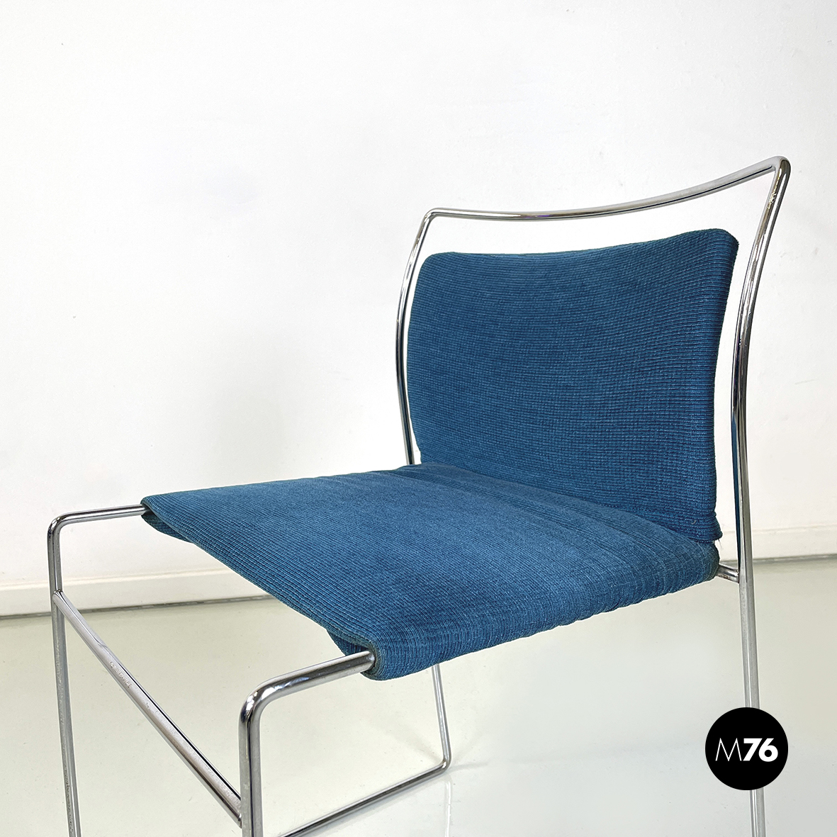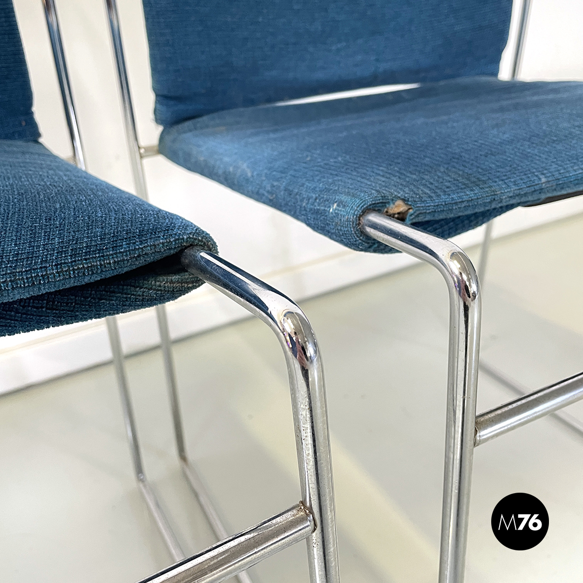 Set di sei sedie modello Tulu con seduta  e schienale rettangolari imbottiti e rivestiti in tessuto di velluto tramato blu originale. La struttura tondino di acciaio Il tessuto della seduta è sostenuta da sotto attraverso delle cinghie elastiche nere. Sedie impilabili.