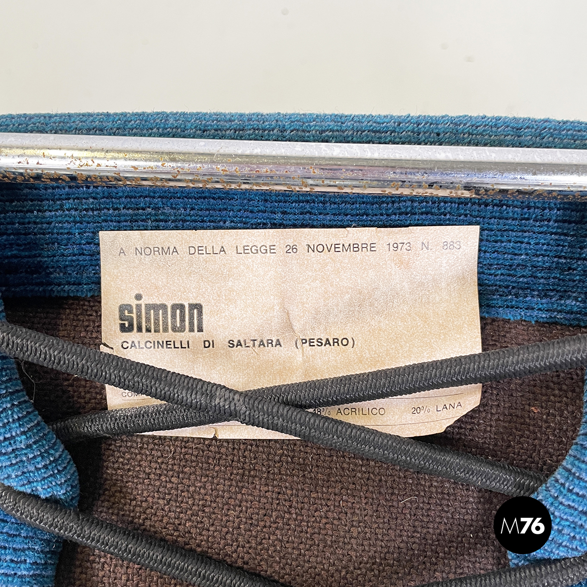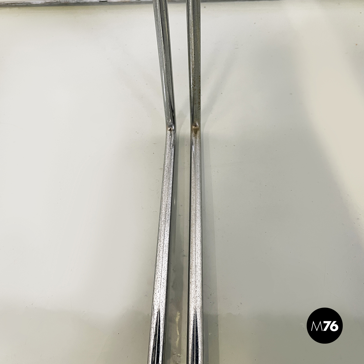 Condizioni vintage presentano diversi segni sparsi sia su tessuto che sul metallo dati dal tempo e dall’utilizzo. Due sedie presentano un difetto sul tessuto e una sedia presenta una macchia.