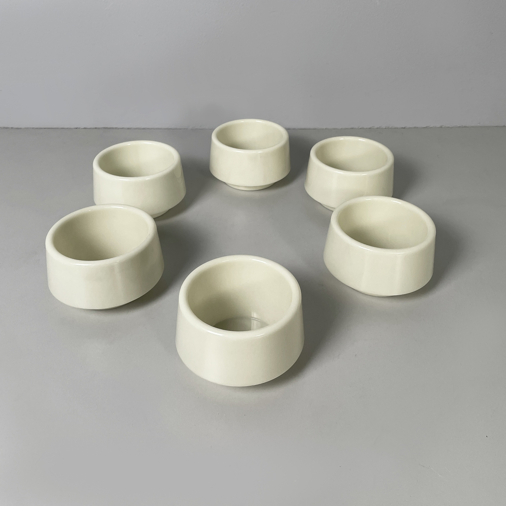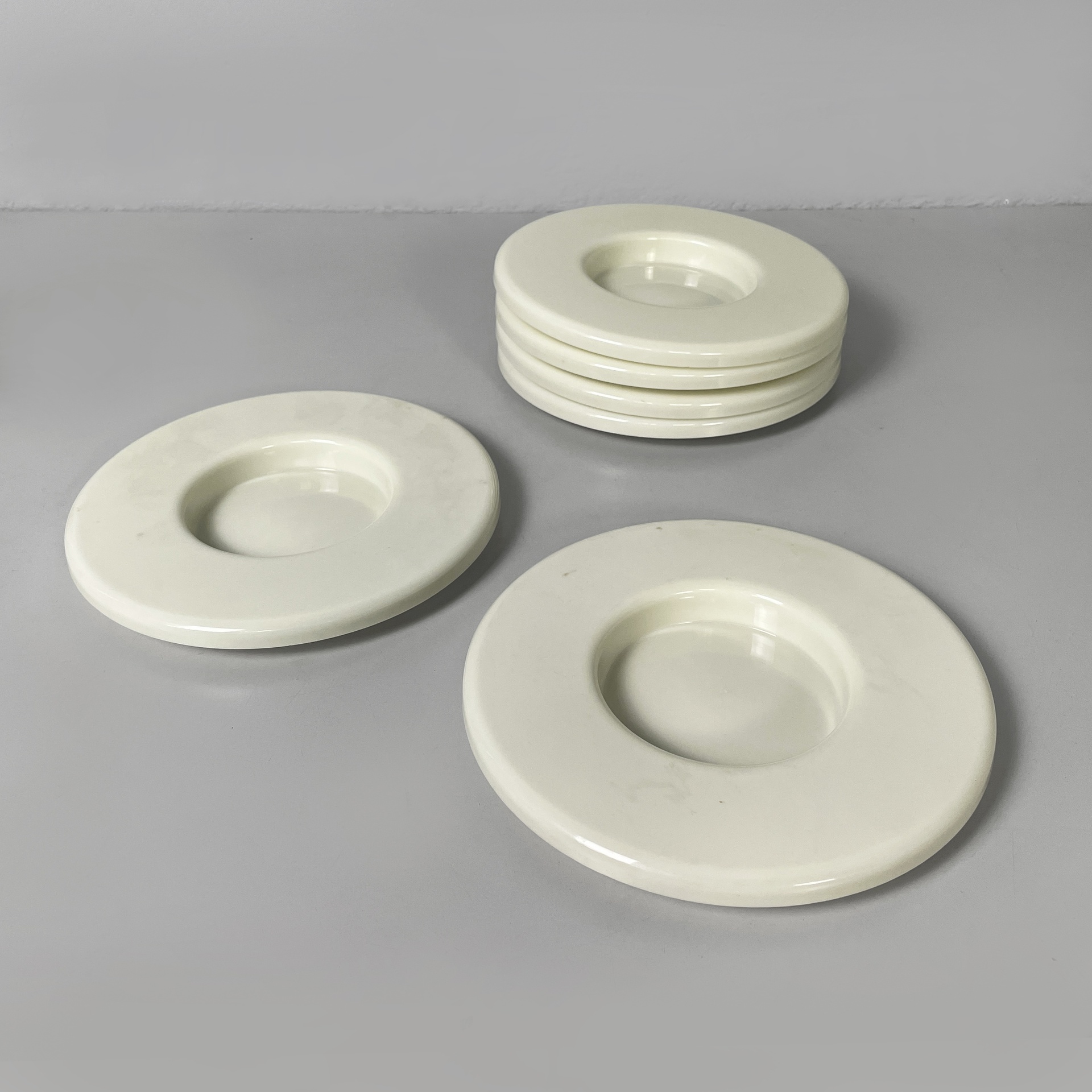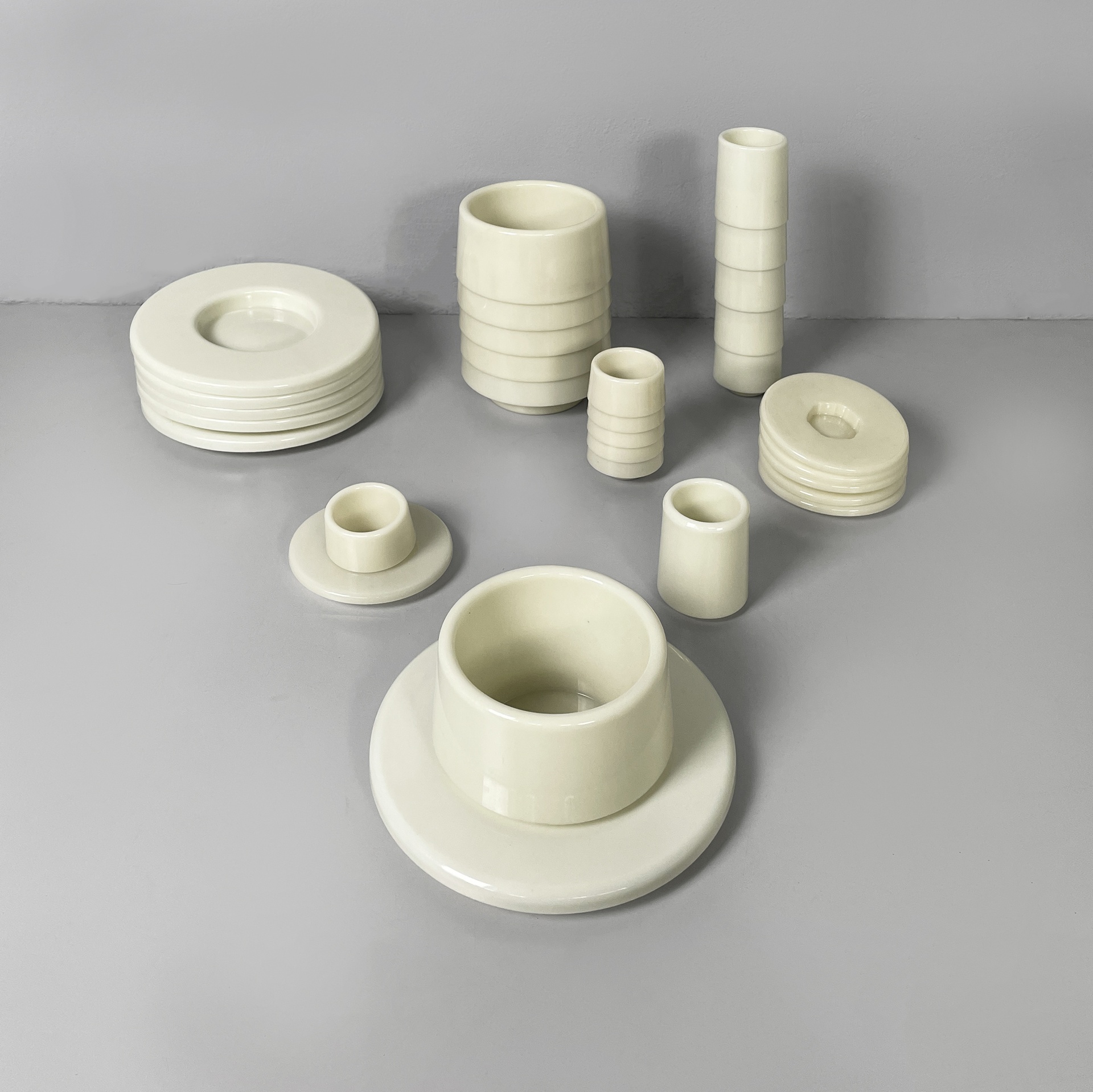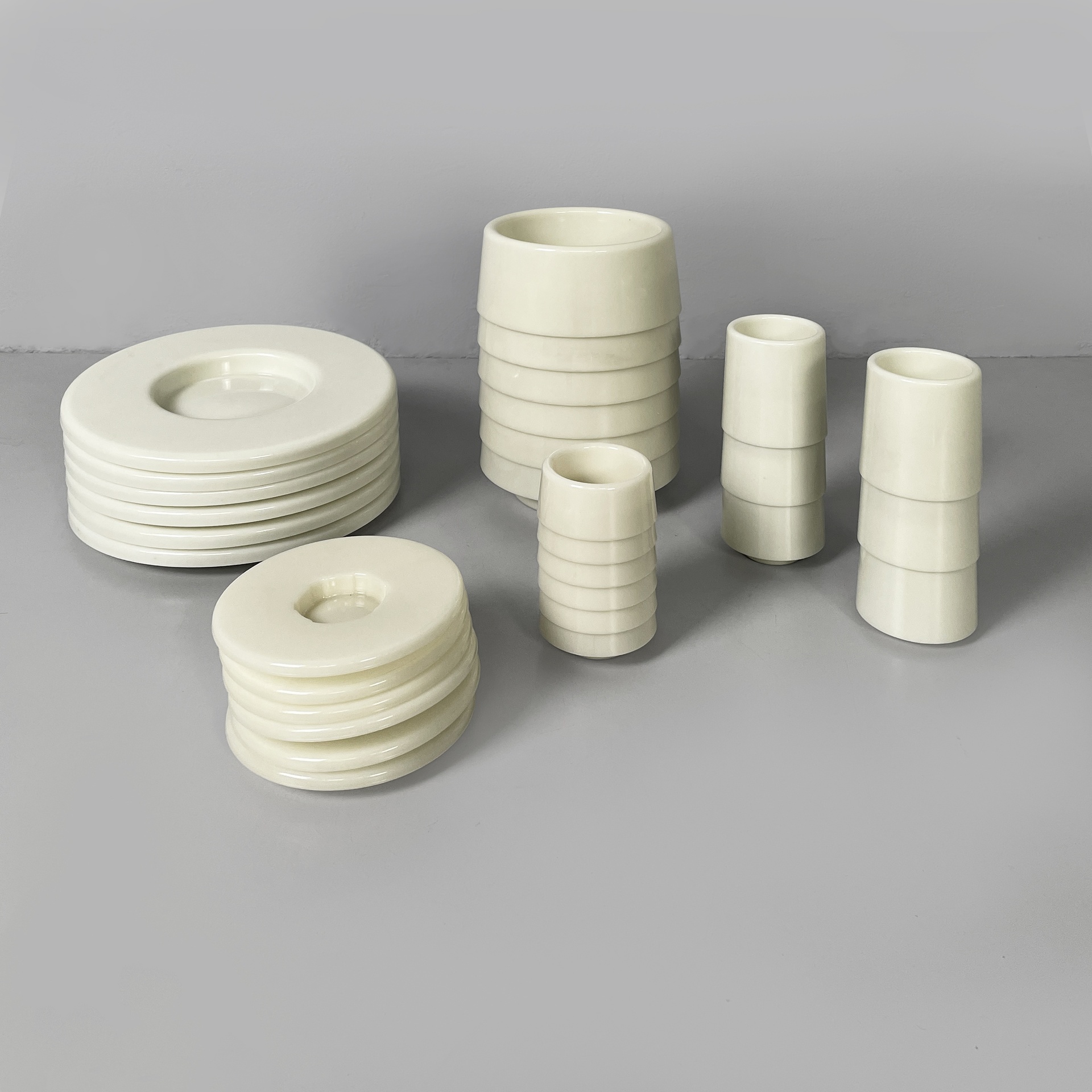 Servizio da tavolo in plastica bianca composto da sei piatti, sei ciotole, sei bicchieri, sei tazzine con relativi piatti. I set di piatti, ciotole e bicchieri sono a base tonda e sono impilabili.