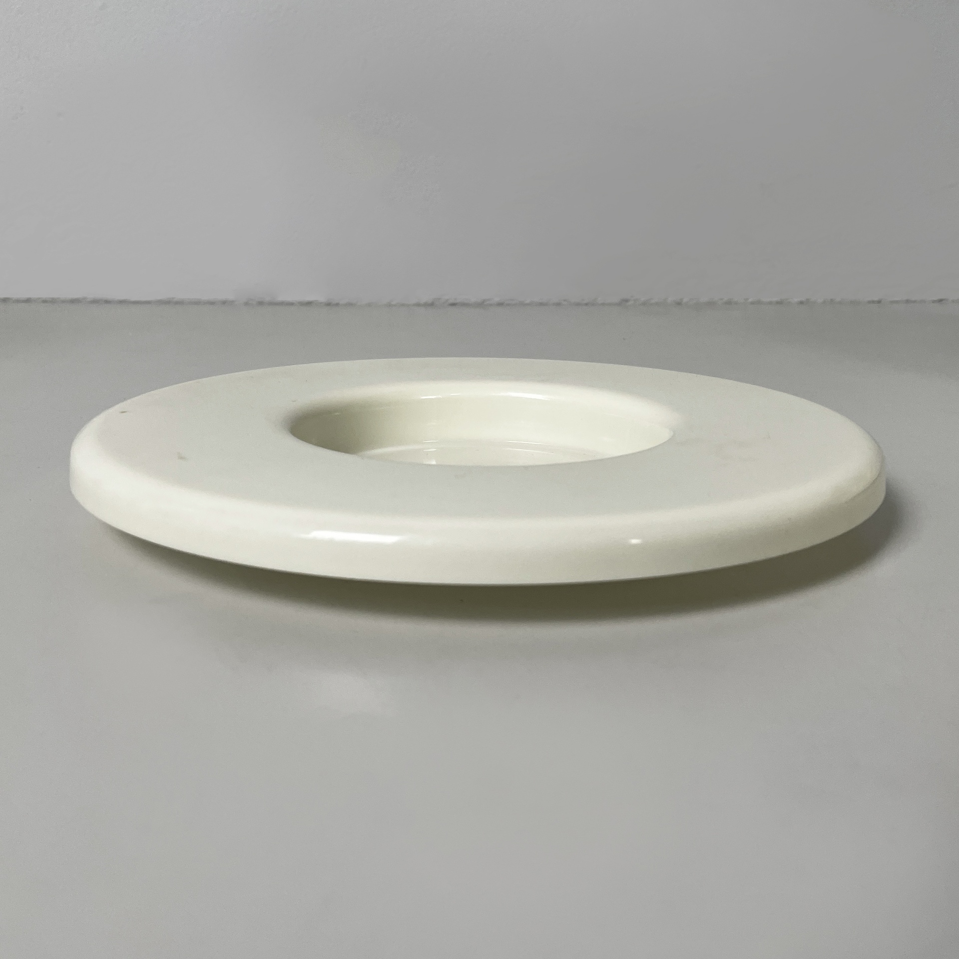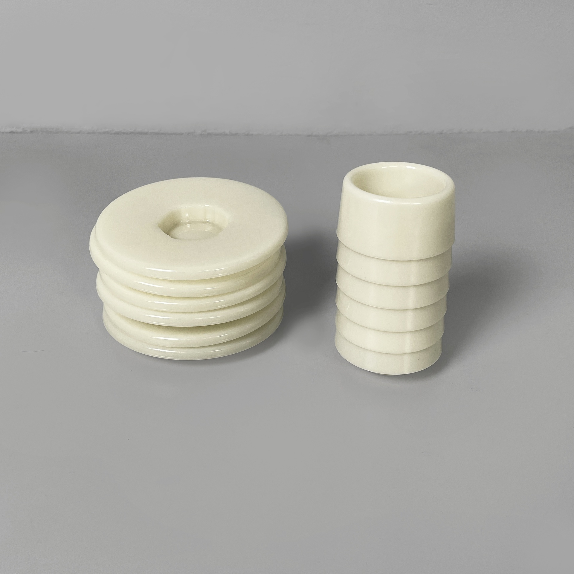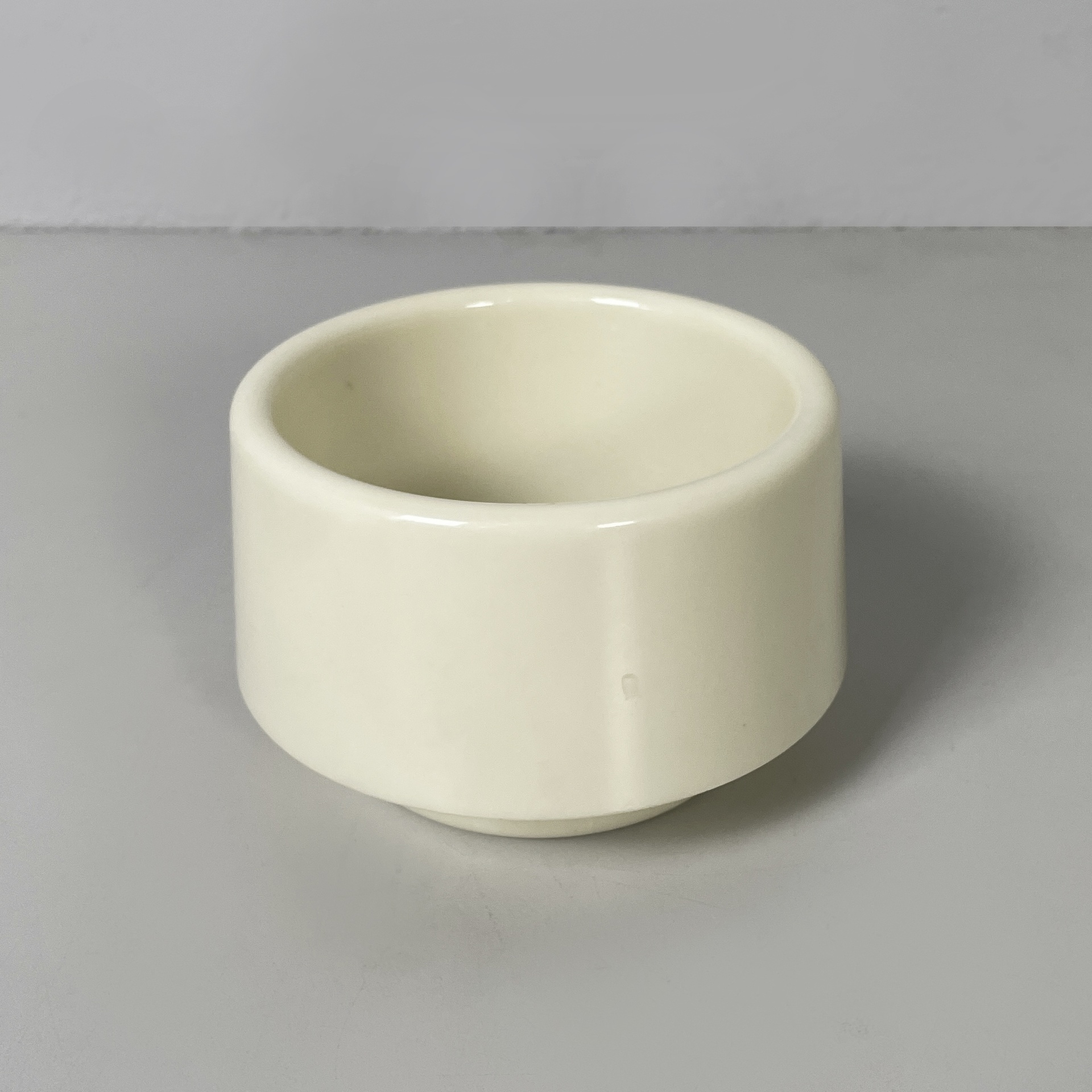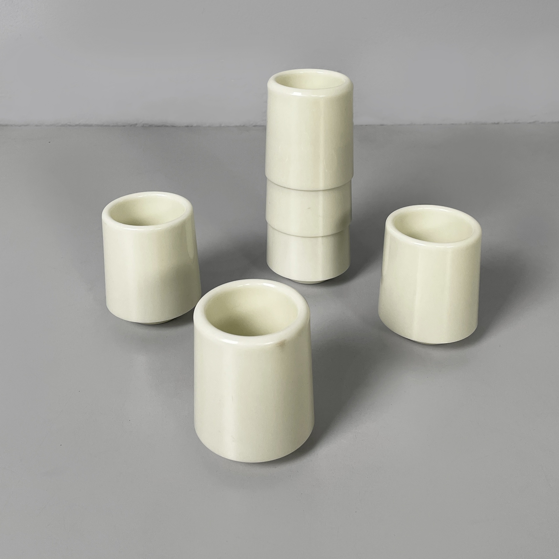 Servizio da tavolo in plastica bianca composto da sei piatti, sei ciotole, sei bicchieri, sei tazzine con relativi piatti. I set di piatti, ciotole e bicchieri sono a base tonda e sono impilabili.