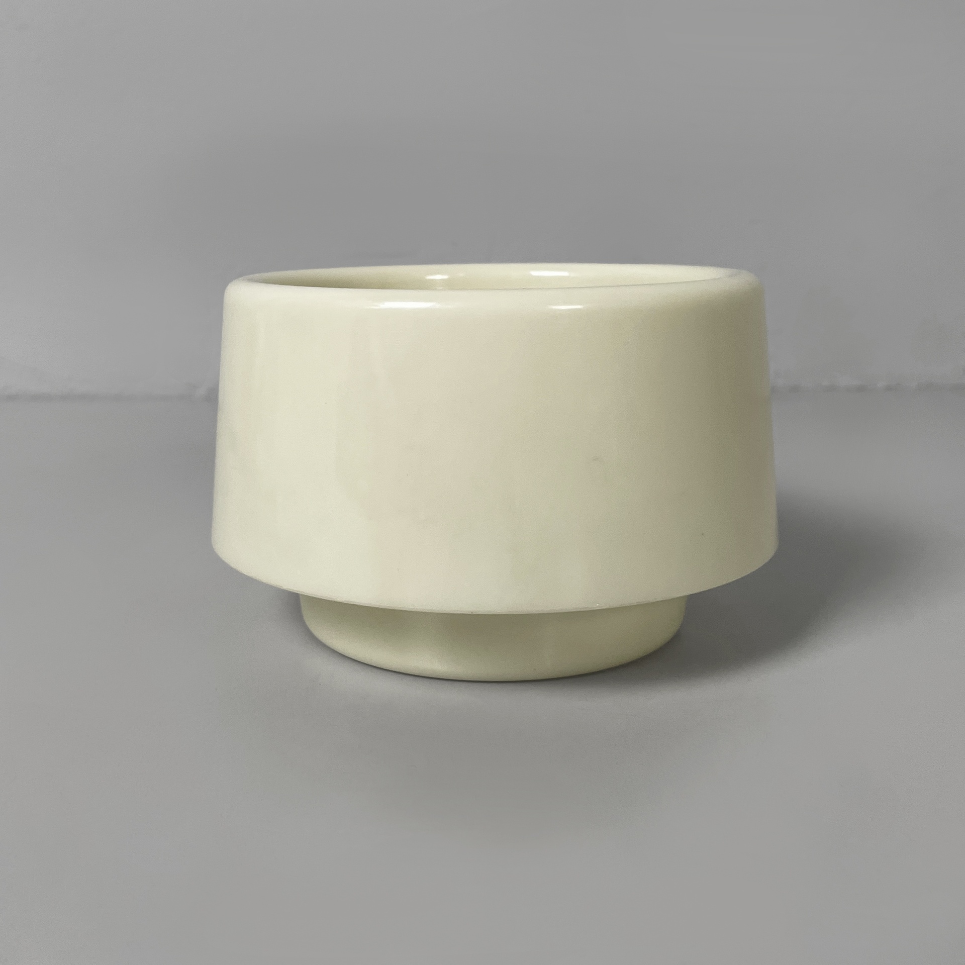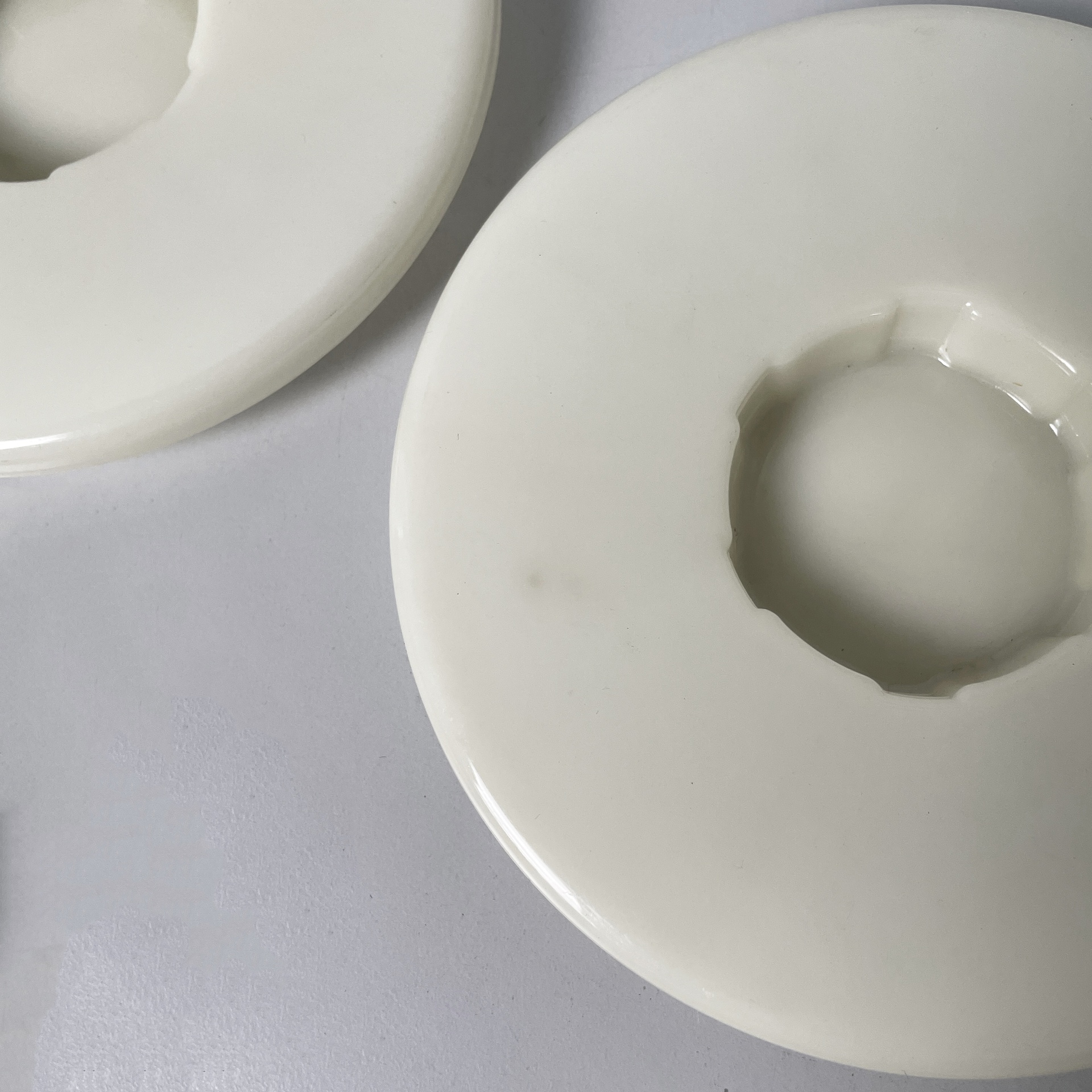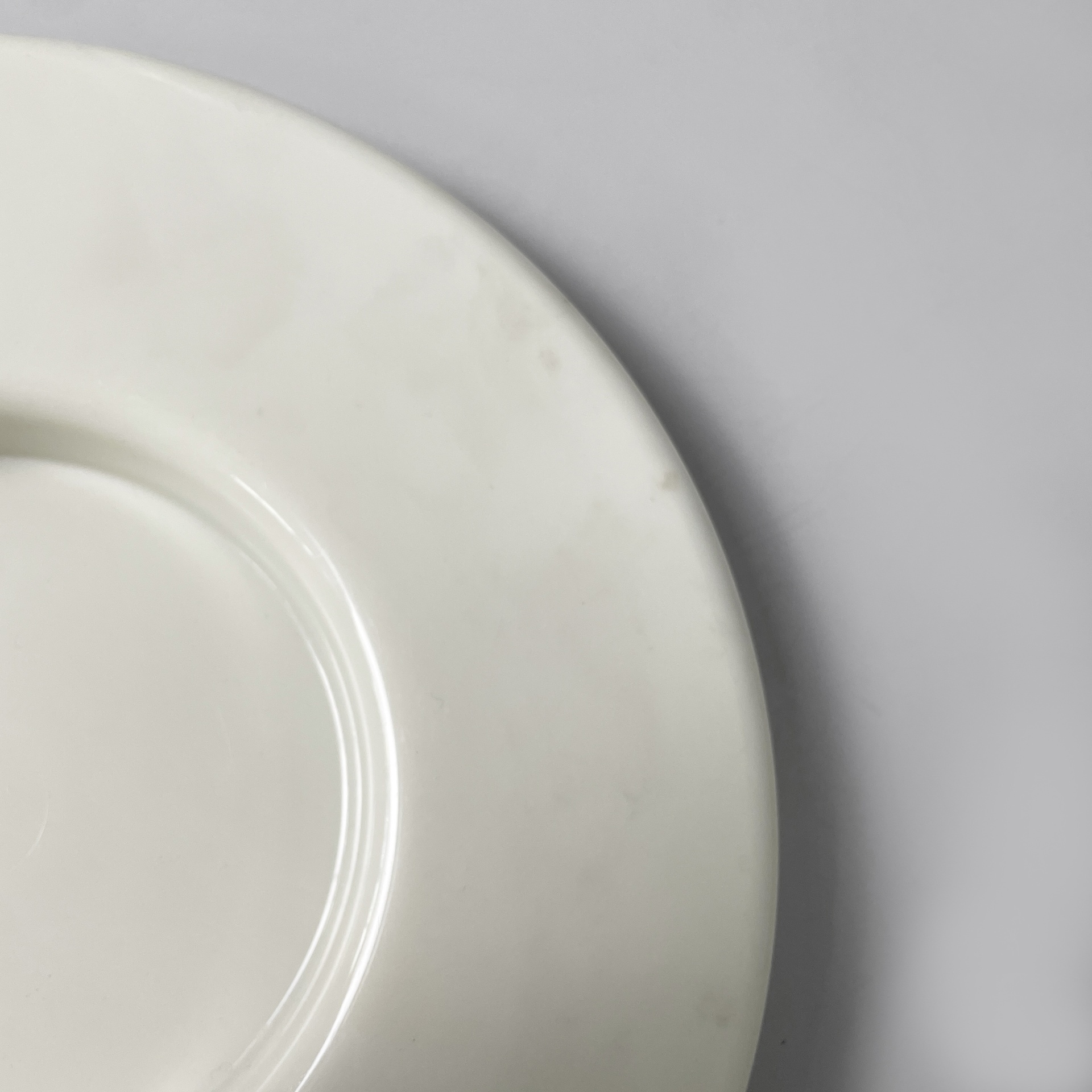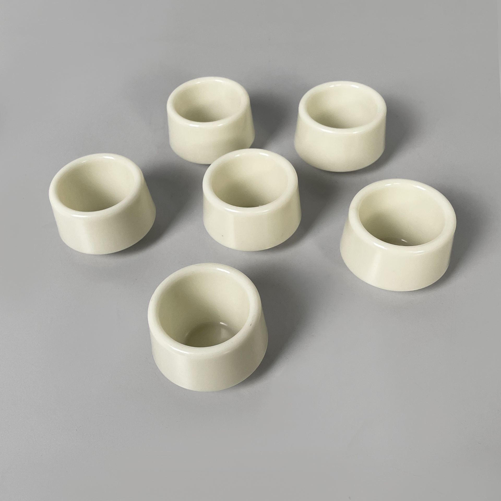 Servizio da tavolo in plastica bianca composto da sei piatti, sei ciotole, sei bicchieri, sei tazzine con relativi piatti. I set di piatti, ciotole e bicchieri sono a base tonda e sono impilabili.