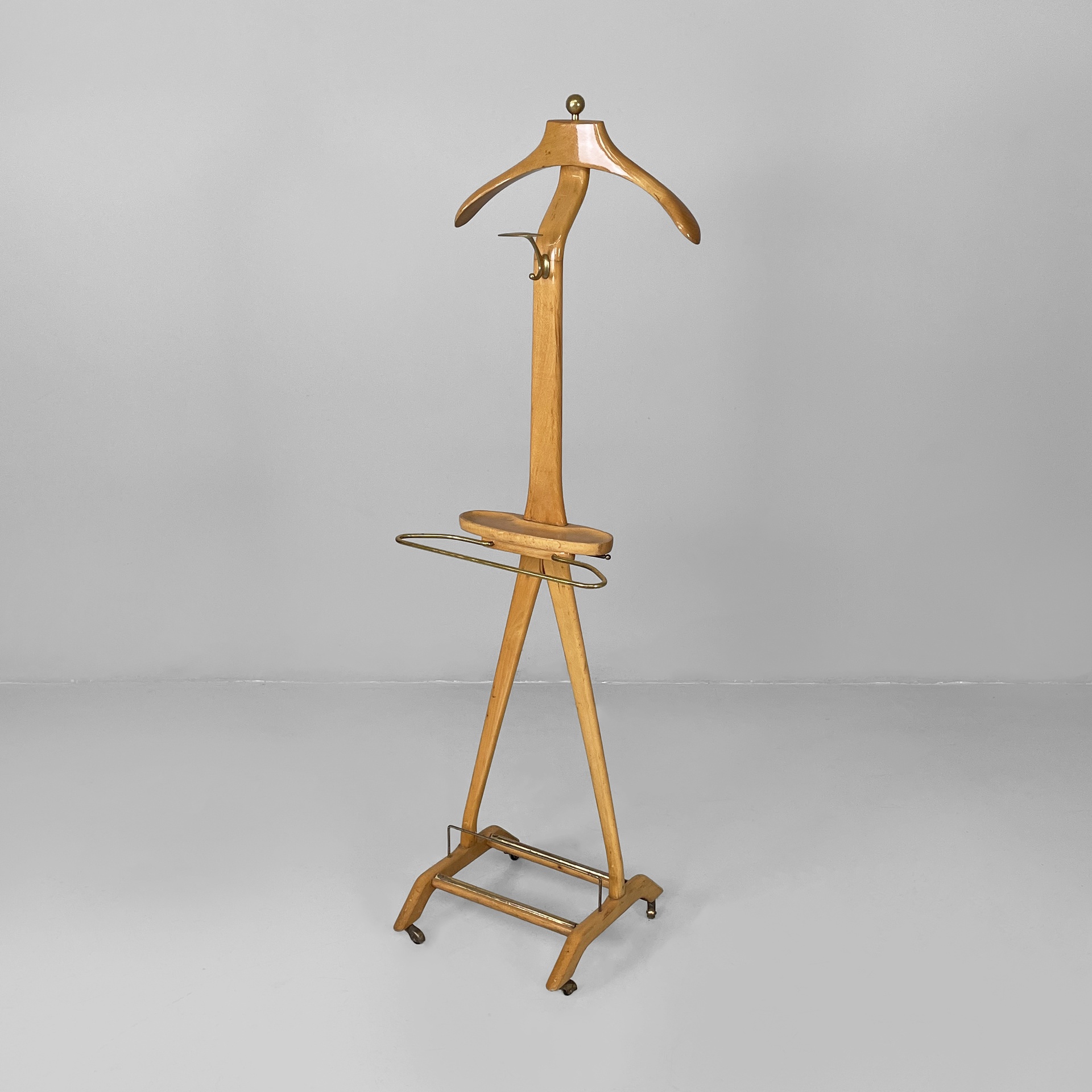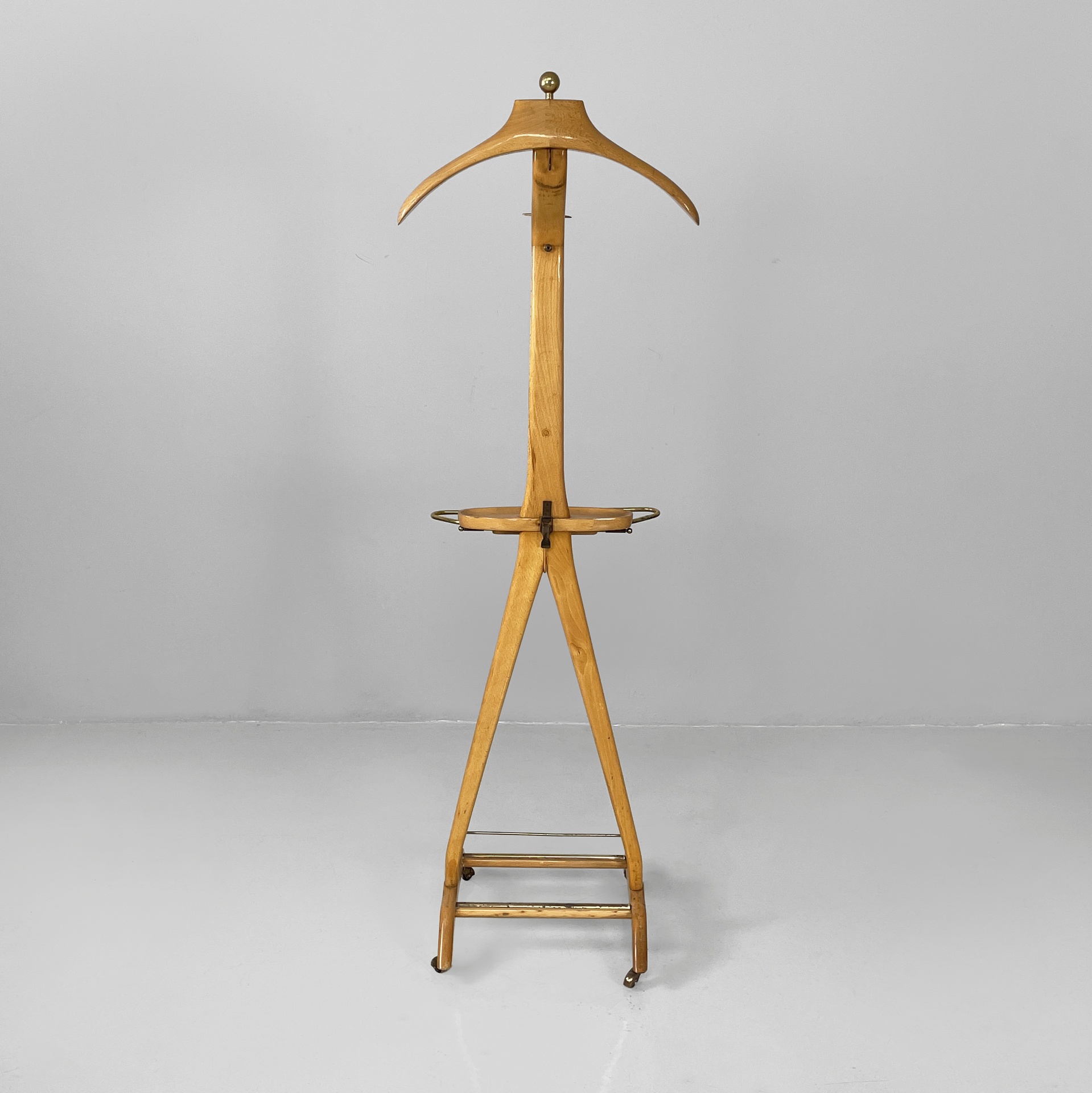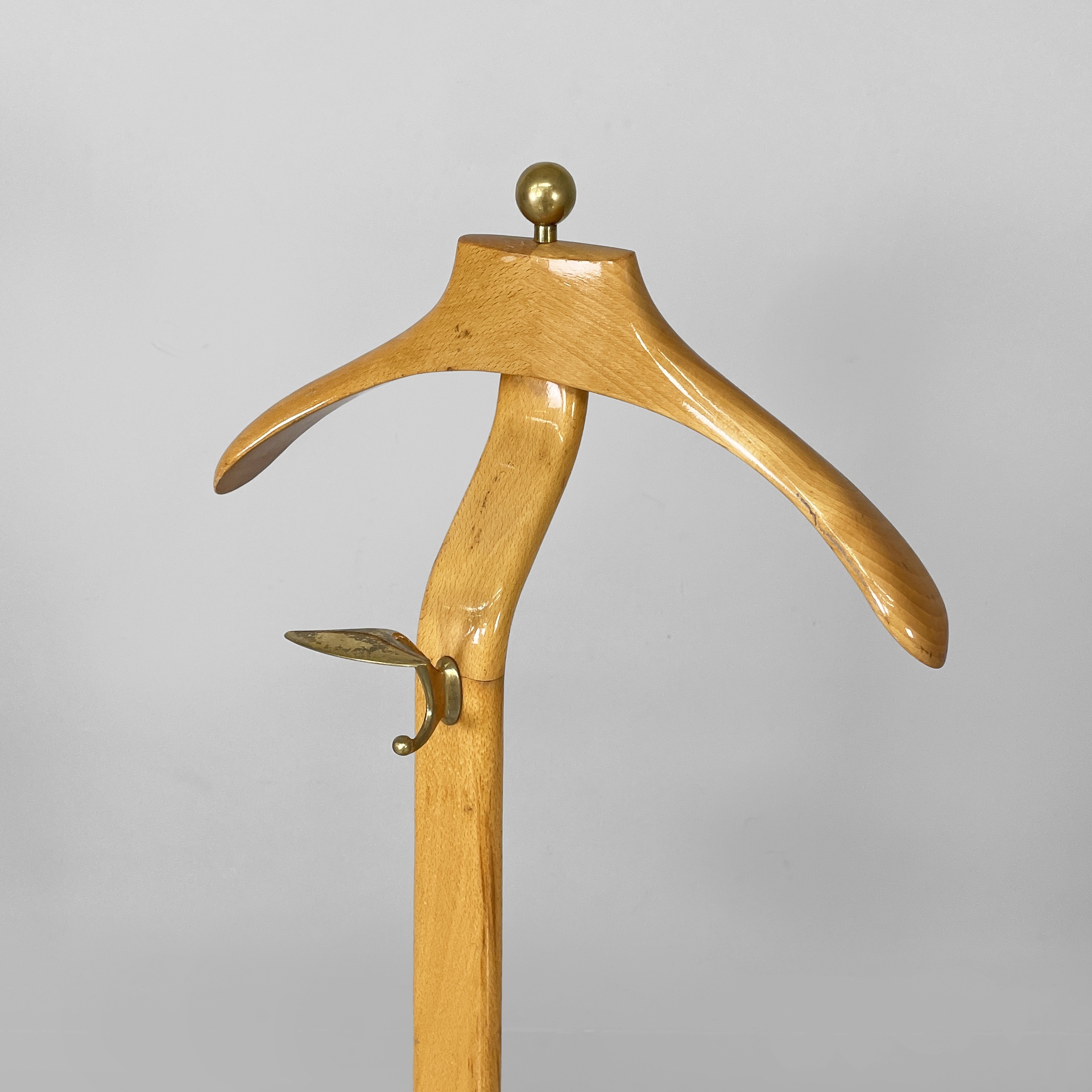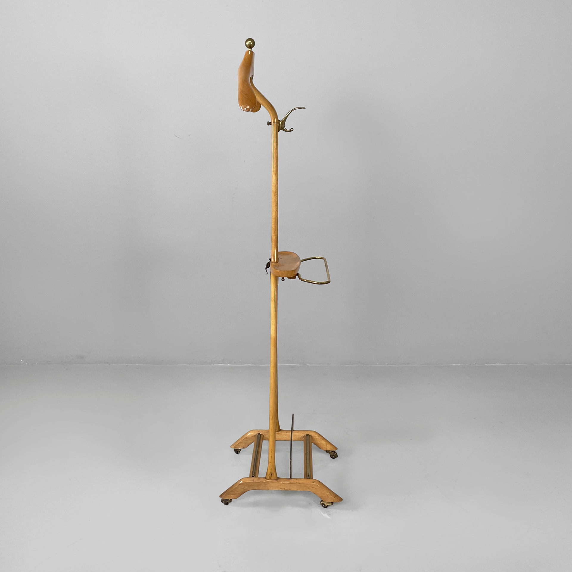Servomuto da terra in legno e ottone. Nella parte superiore è presente un appendiabiti in legno con una sfera in ottone utilizzabile come portacappello, un gancio frontale in ottone e uno piccolo sul retro in metallo. Al centro è presente una piccola mensola con due tondini di ottone estraibili. La base in legno presenta dettagli in ottone e ruote.