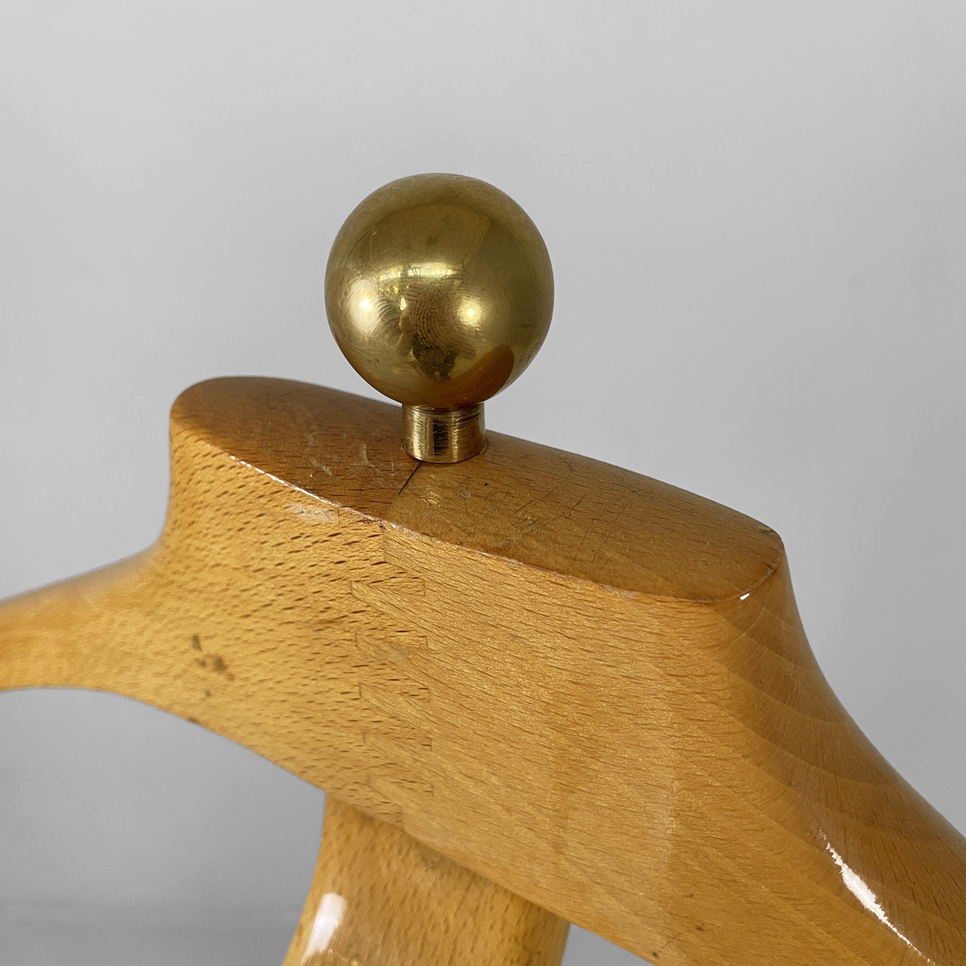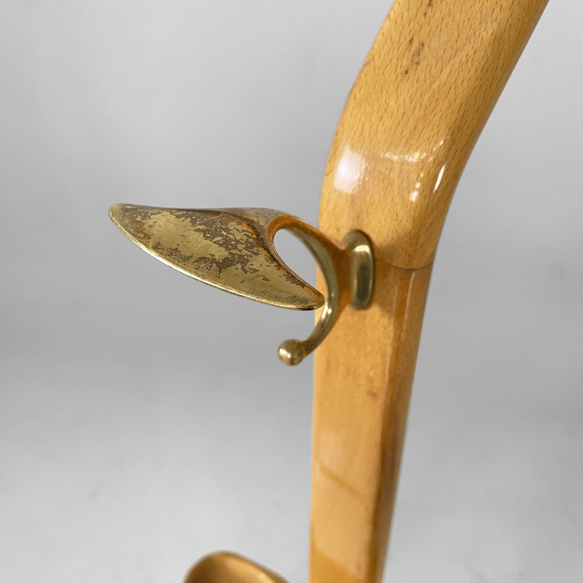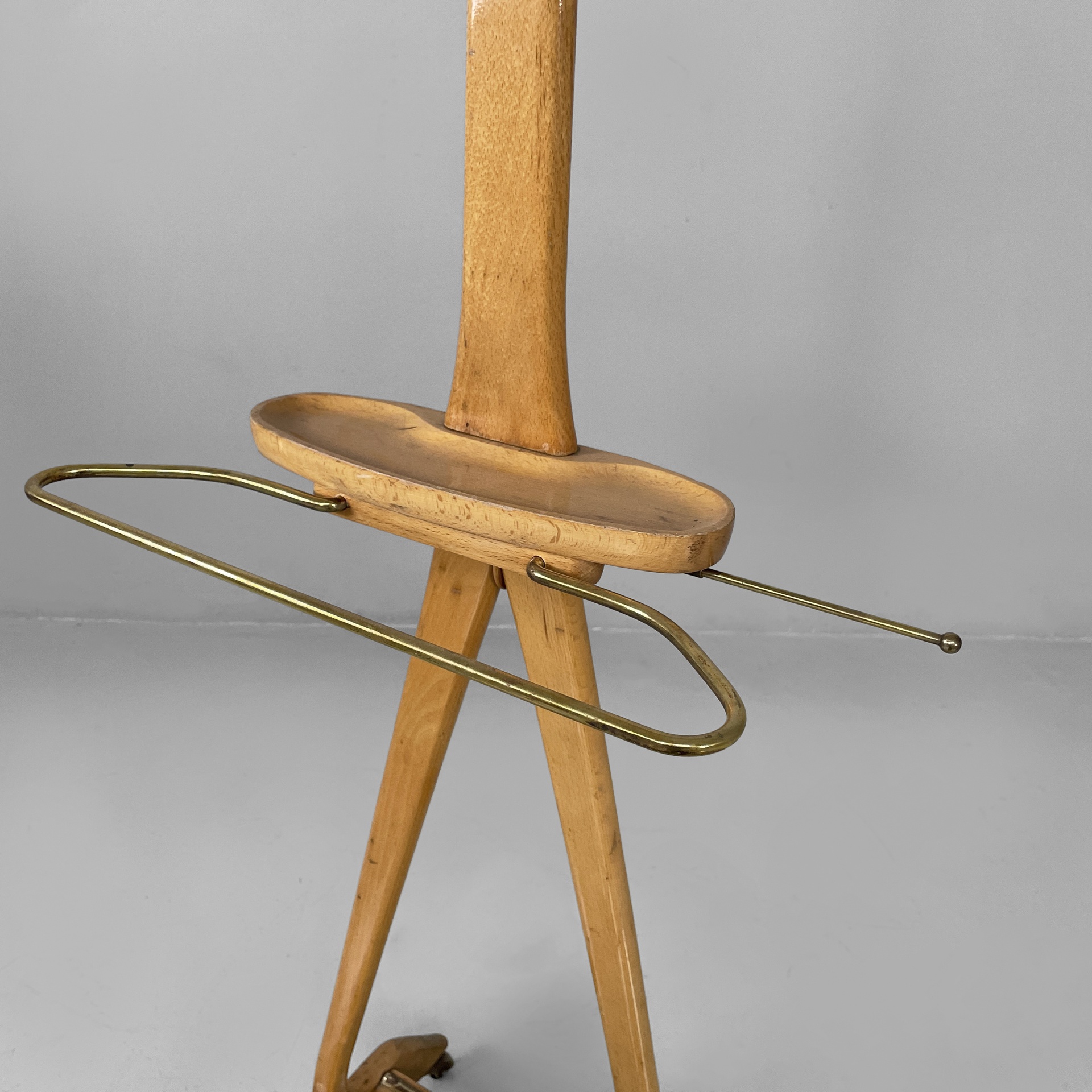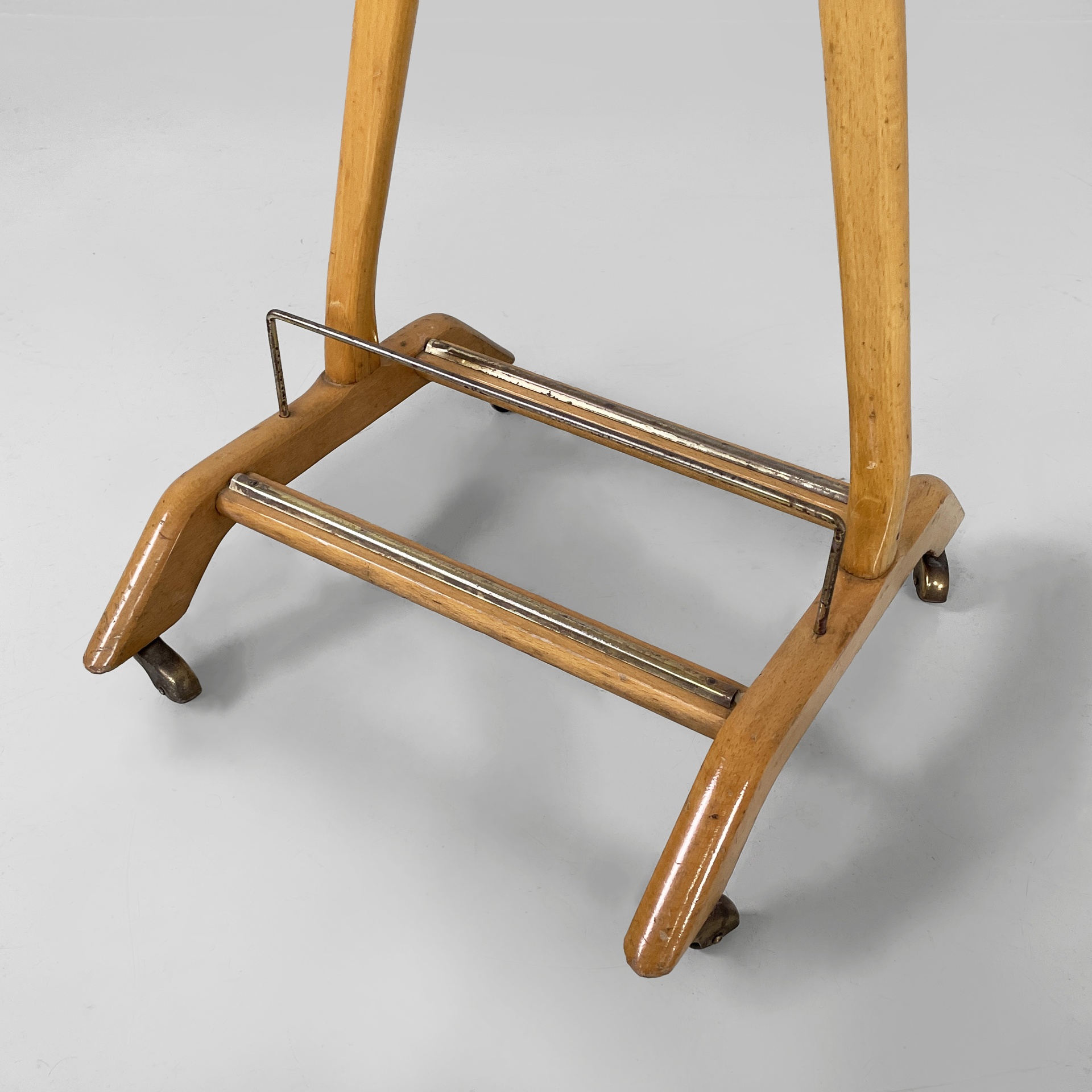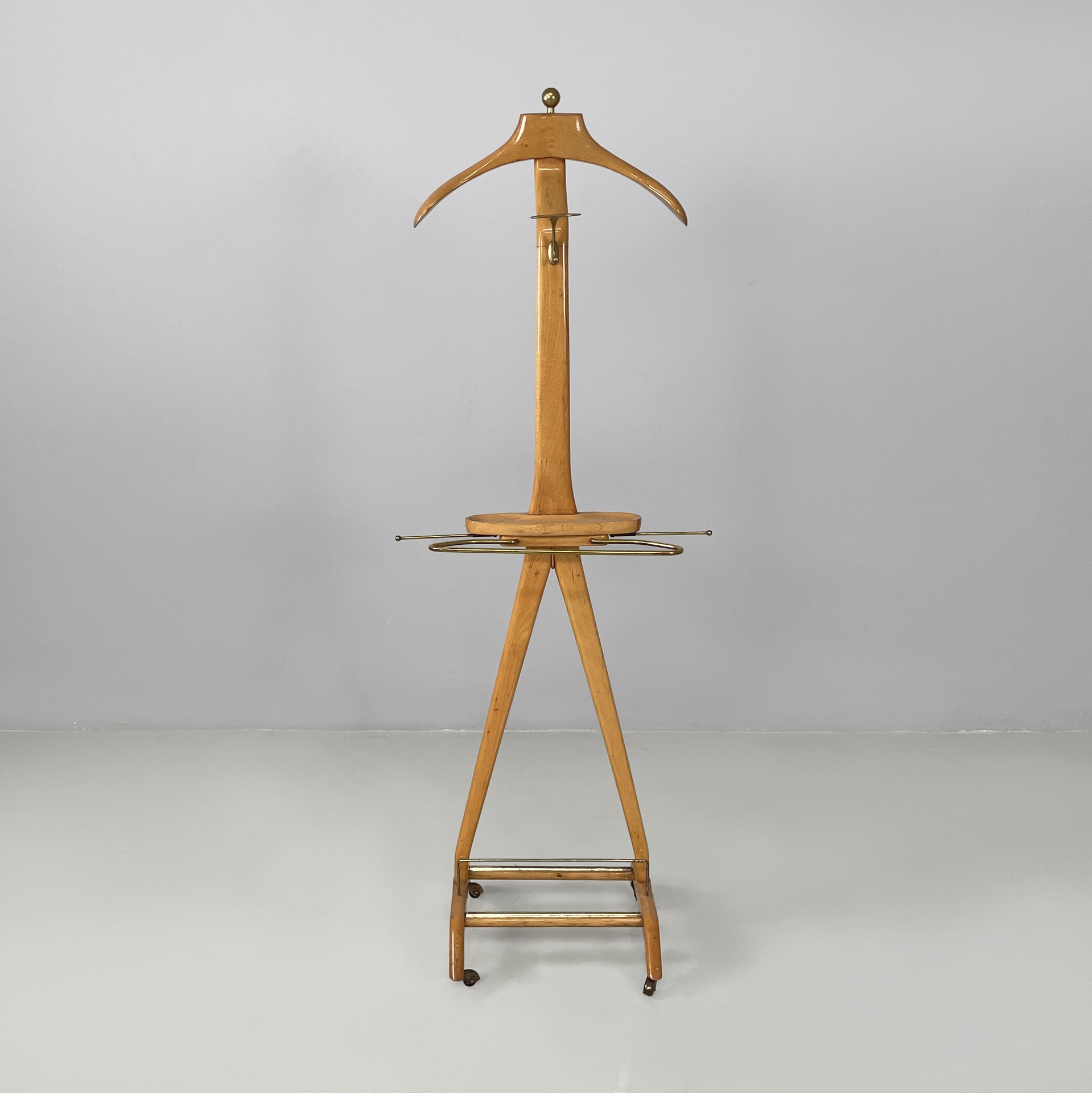 Servomuto da terra in legno e ottone. Nella parte superiore è presente un appendiabiti in legno con una sfera in ottone utilizzabile come portacappello, un gancio frontale in ottone e uno piccolo sul retro in metallo. Al centro è presente una piccola mensola con due tondini di ottone estraibili. La base in legno presenta dettagli in ottone e ruote.