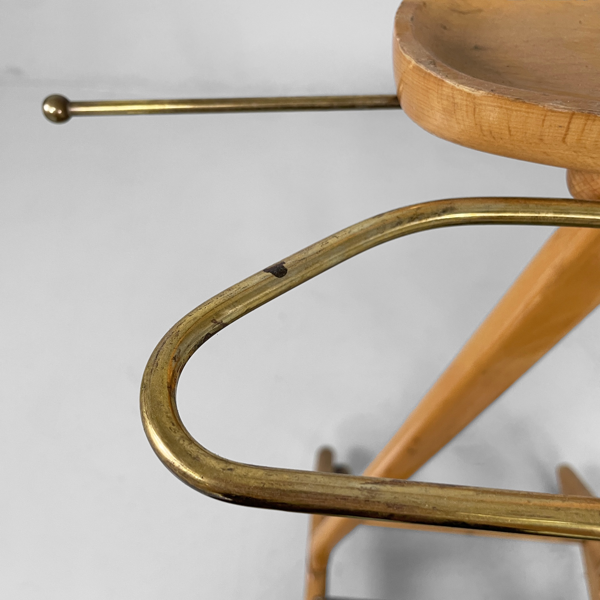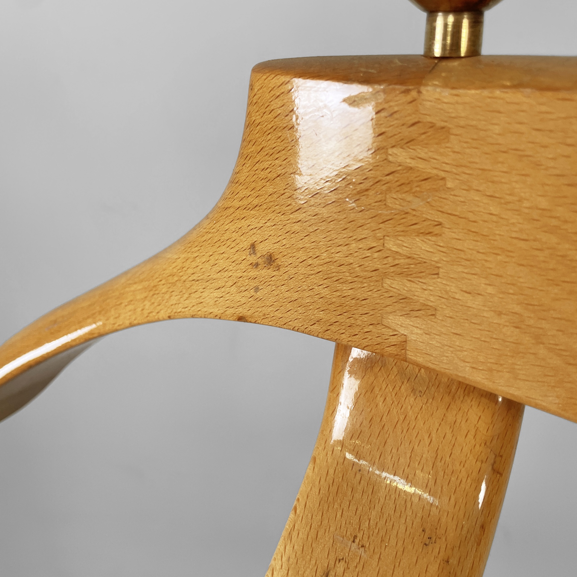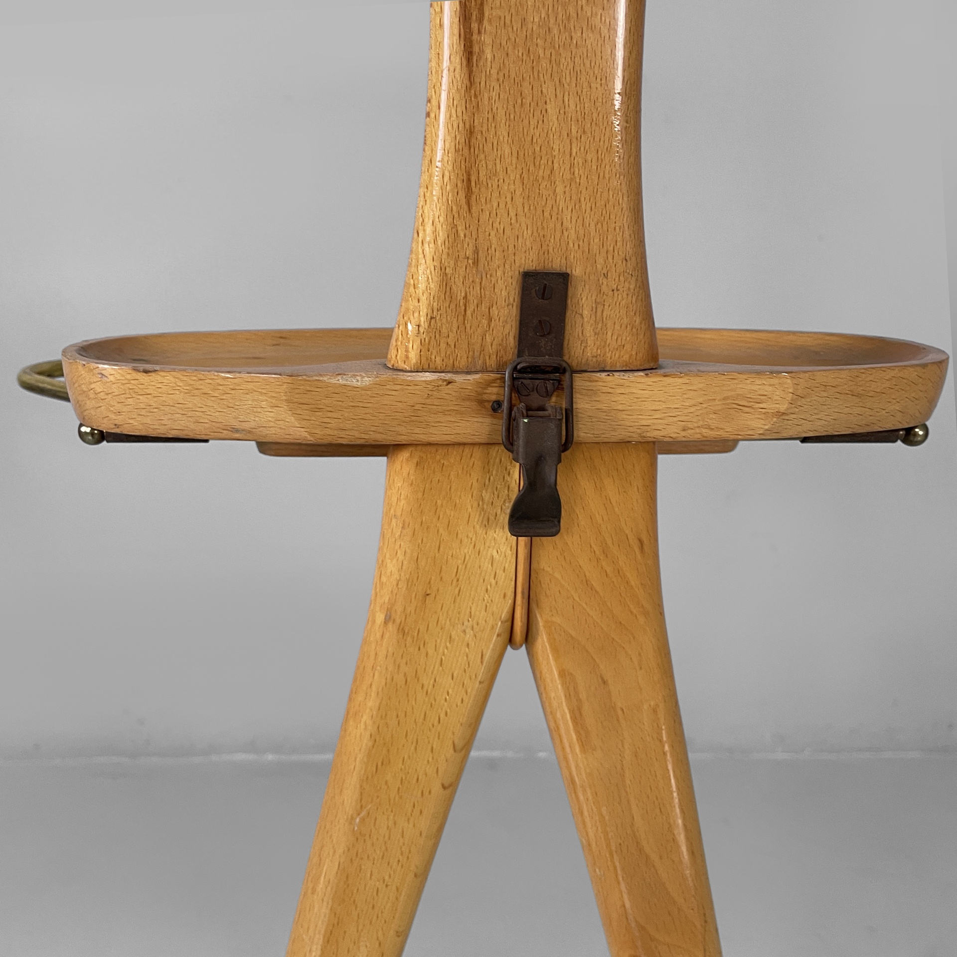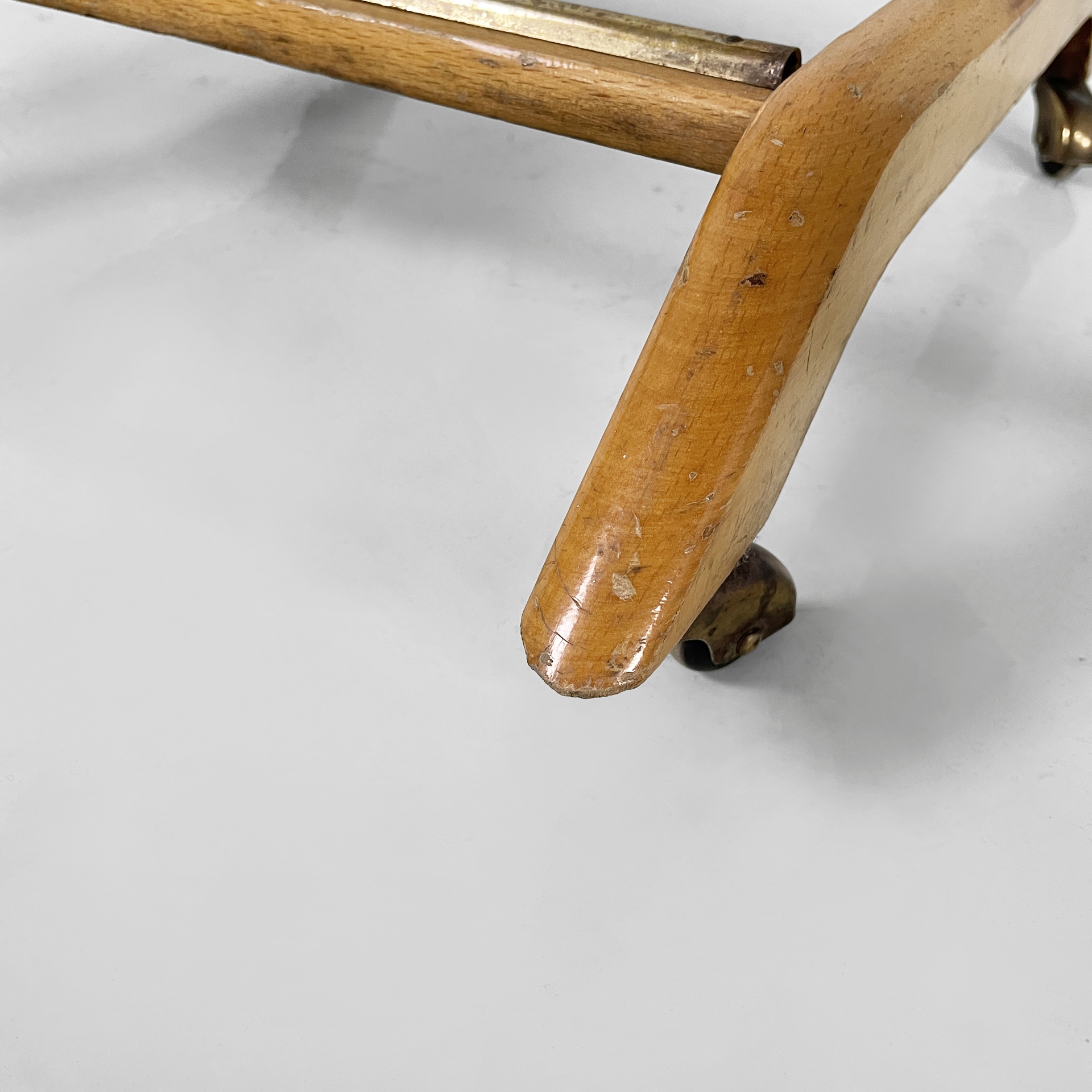 Servomuto da terra in legno e ottone. Nella parte superiore è presente un appendiabiti in legno con una sfera in ottone utilizzabile come portacappello, un gancio frontale in ottone e uno piccolo sul retro in metallo. Al centro è presente una piccola mensola con due tondini di ottone estraibili. La base in legno presenta dettagli in ottone e ruote.