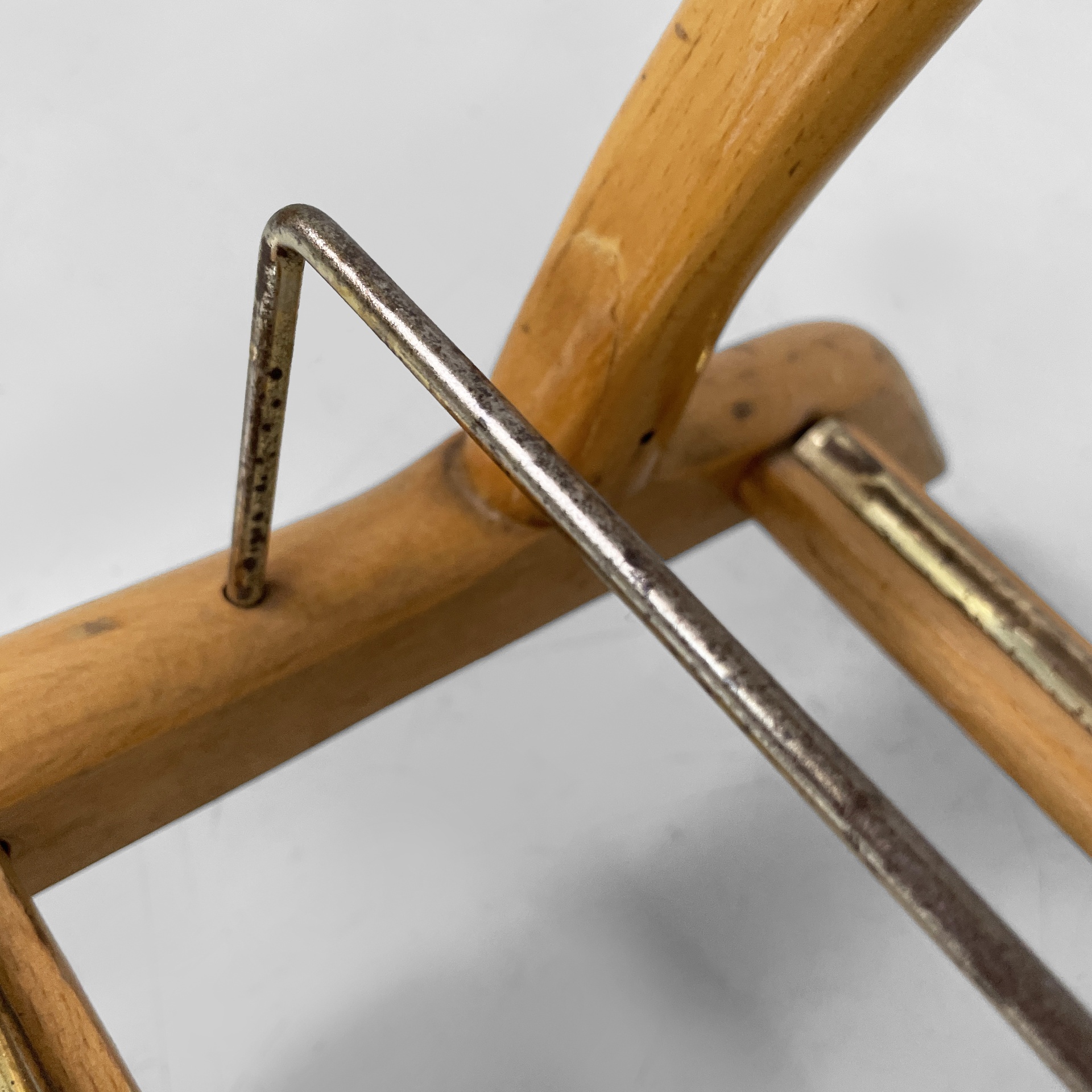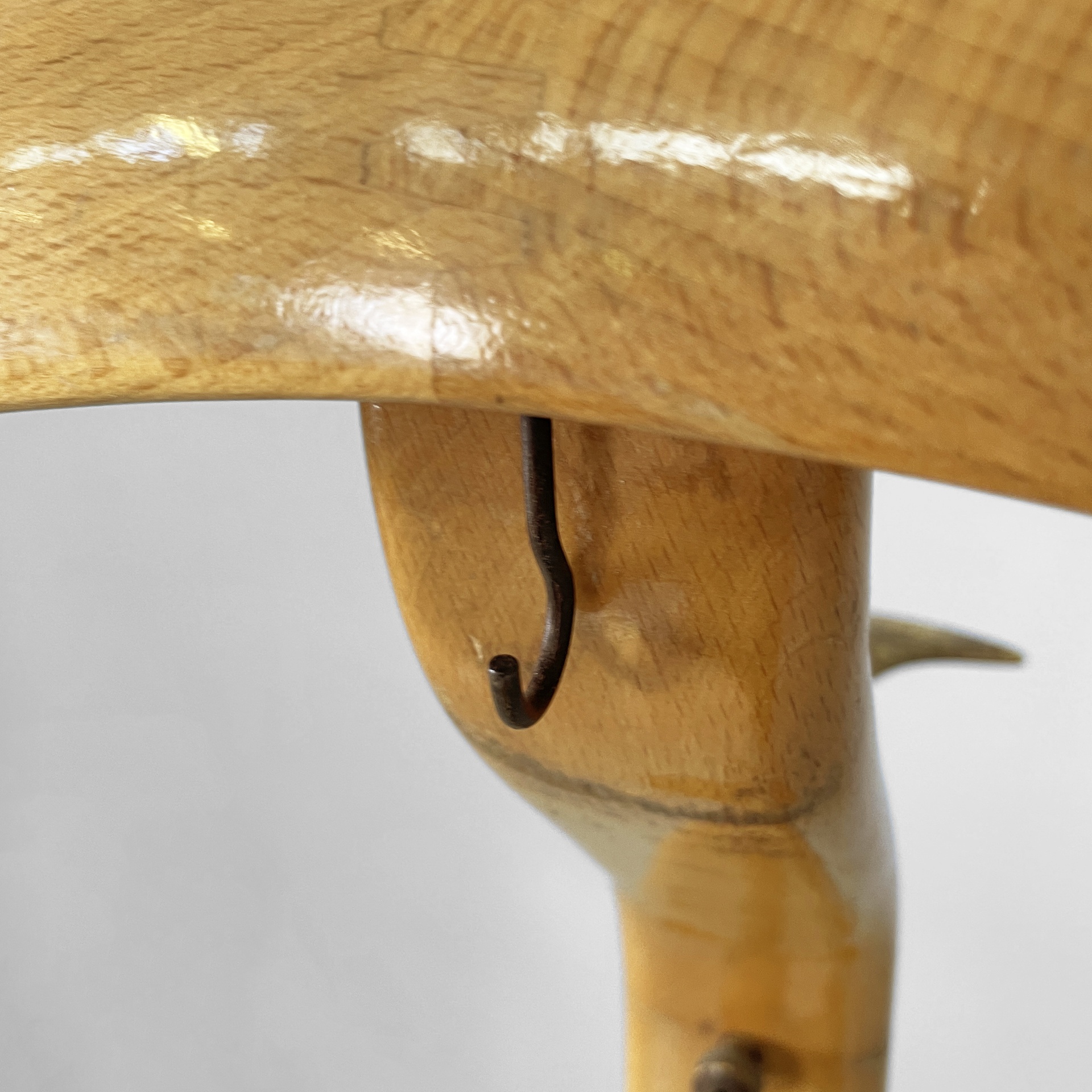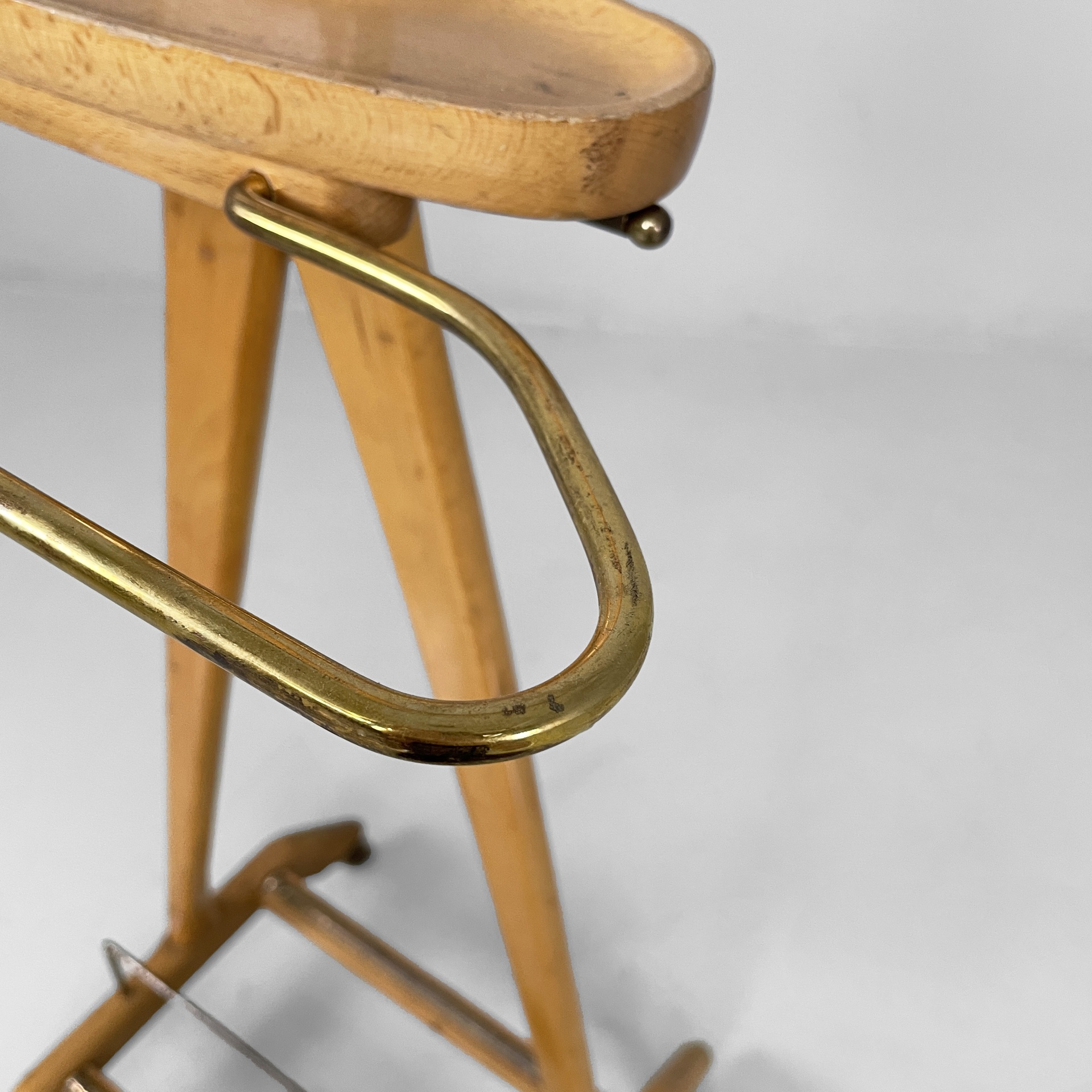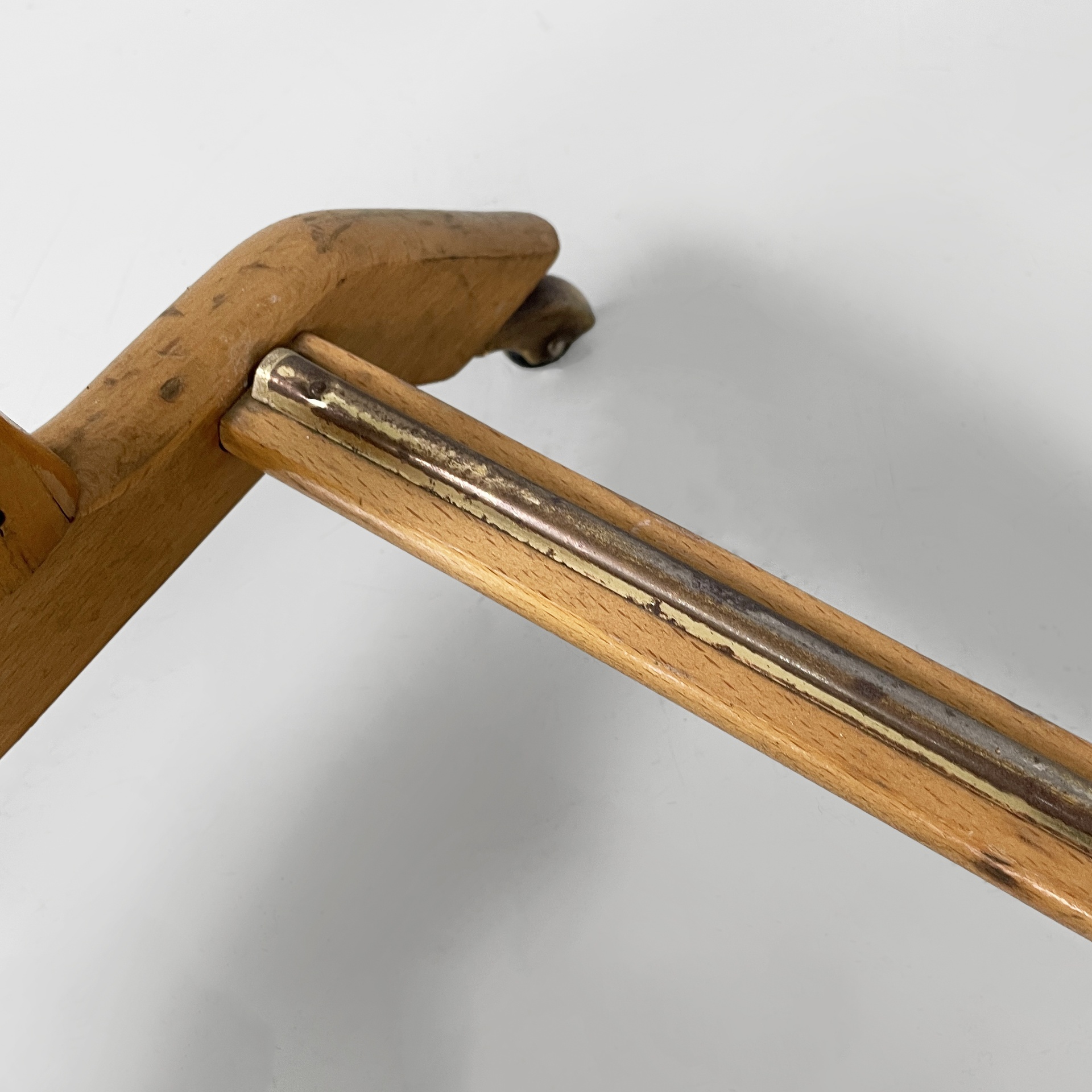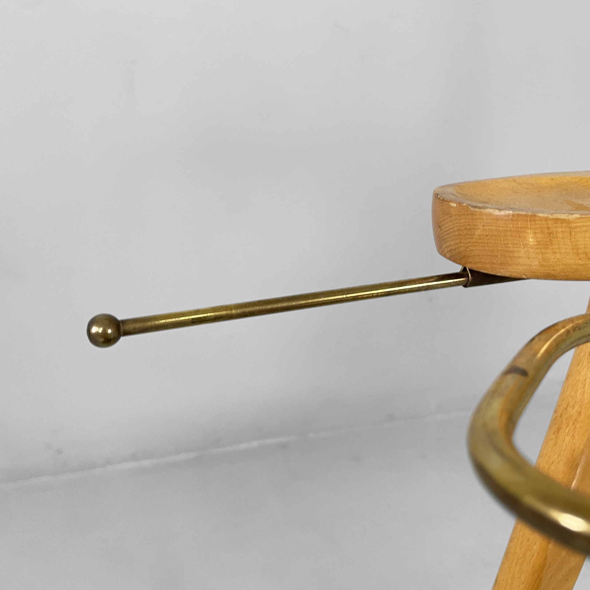 Servomuto da terra in legno e ottone. Nella parte superiore è presente un appendiabiti in legno con una sfera in ottone utilizzabile come portacappello, un gancio frontale in ottone e uno piccolo sul retro in metallo. Al centro è presente una piccola mensola con due tondini di ottone estraibili. La base in legno presenta dettagli in ottone e ruote.