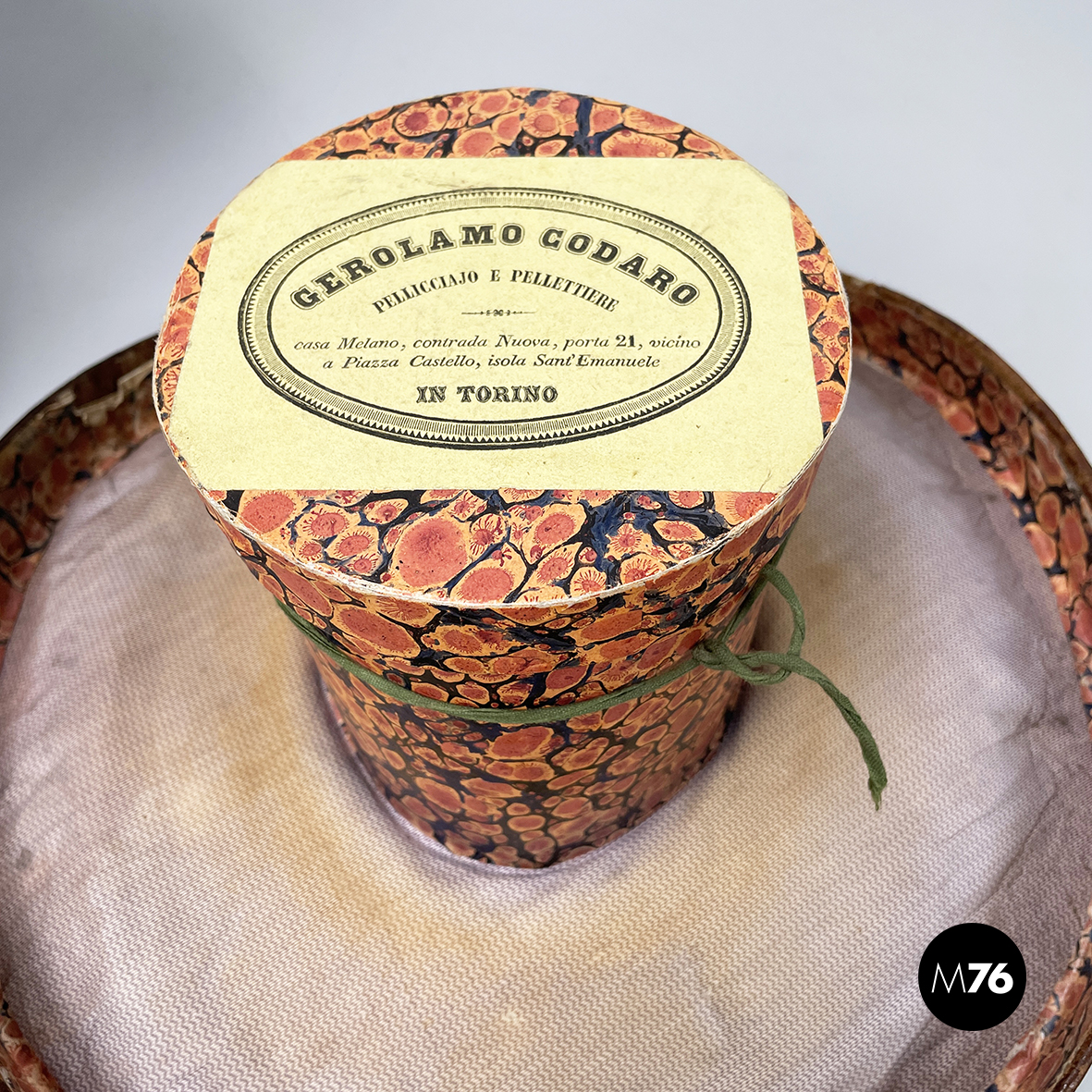 Metà 1900 ca. La cappelliera presenta internamente l’etichetta di Gerolamo Codaro. Il cappello presenta un logo interno.
