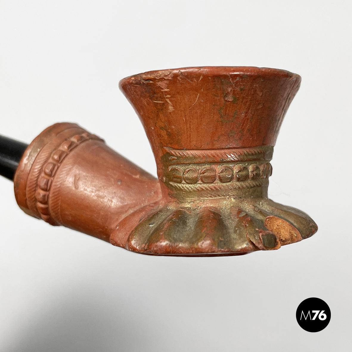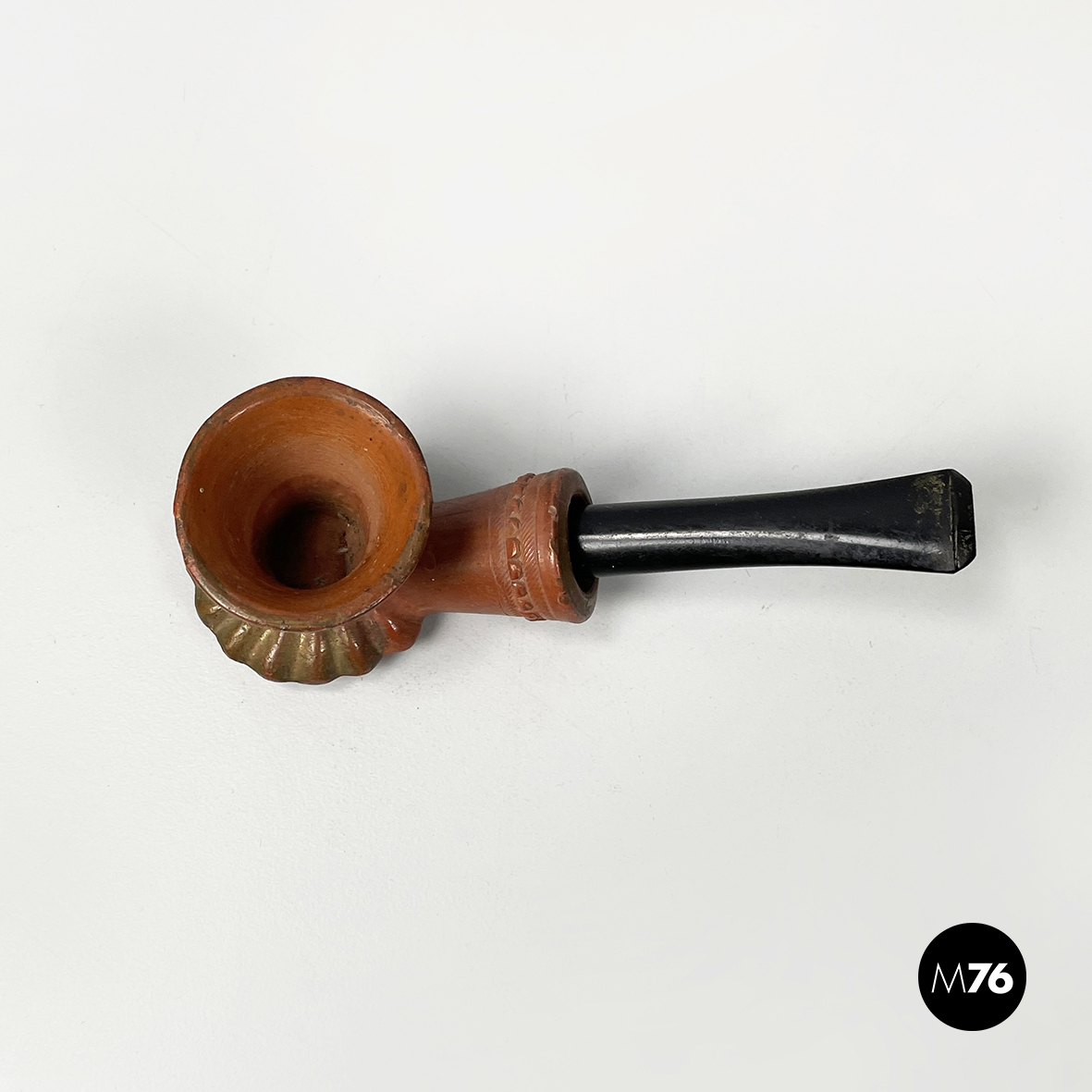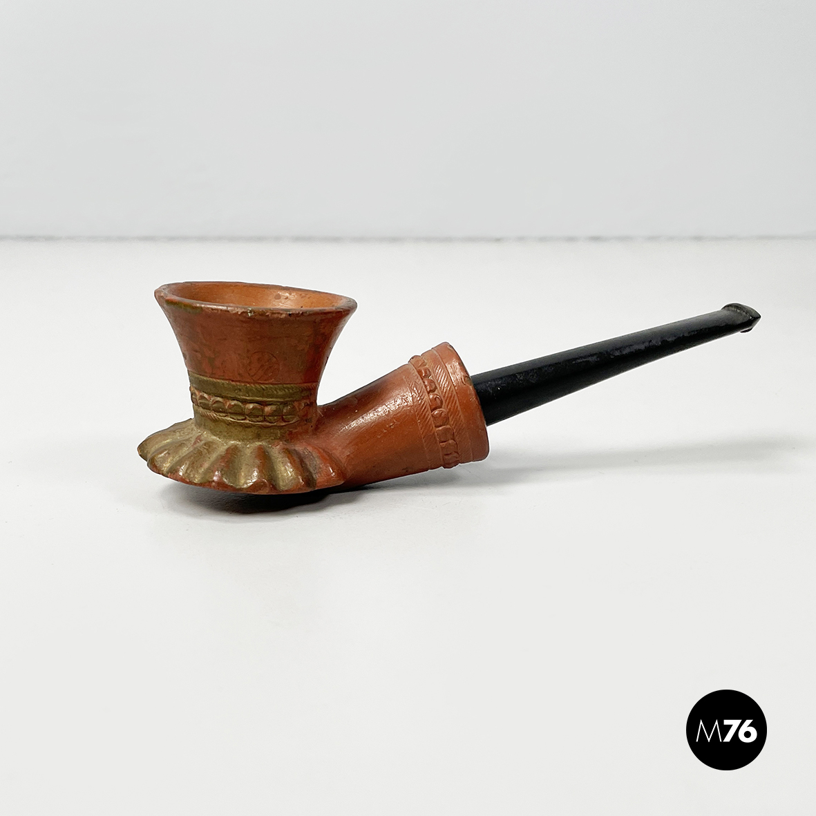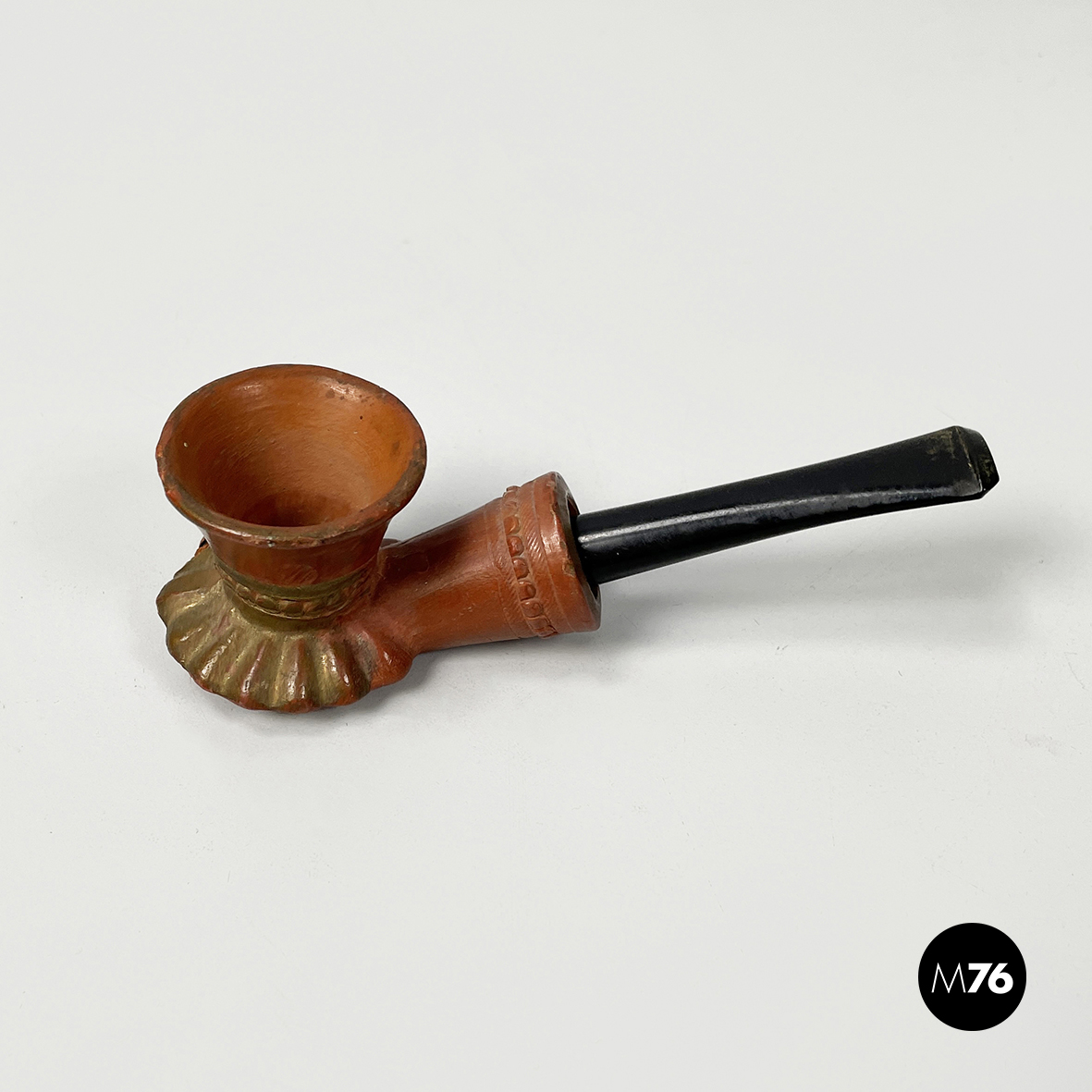 Set da festa composto da cappello a cilindro con cappelliera in cuoio maschera piccolo papillon nero e pipa. Il cappello nero è esternamente in tessuto peloso nero con una passamaneria nera e internamente in cartone. La cappelliera in pelle marrone presenta un interno imbottito e un vano cilindrico in cartone colorato per riporre i piccoli oggetti. La maschera in carta è davanti nera e bianca sul retro. Il piccolo papillon è in tessuto nero con due cordini elastici bianchi e due ganci per la chiusura. La pipa ha il bocchino in plastica nera e la testa in terracotta lavorata e con piccoli dettagli dorati.