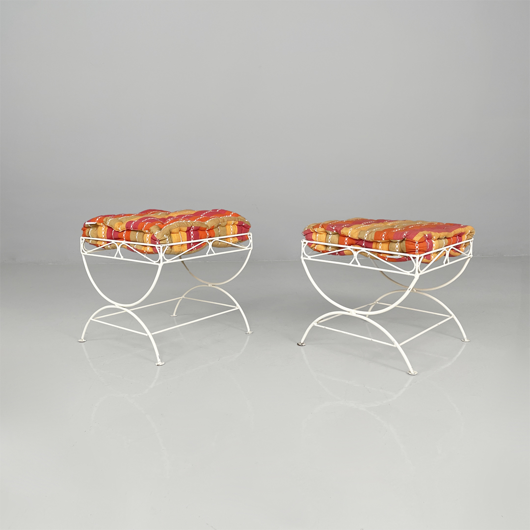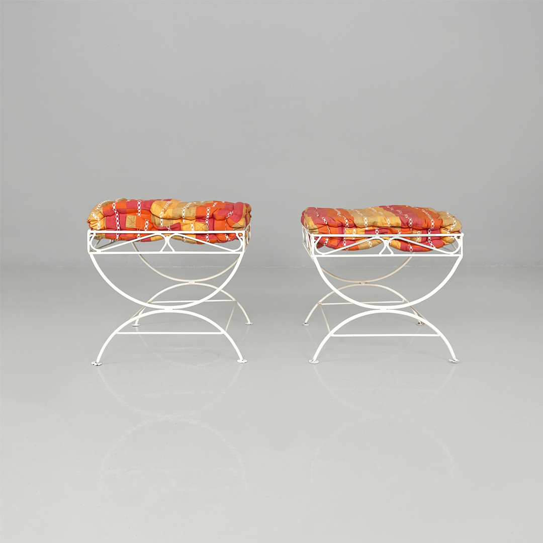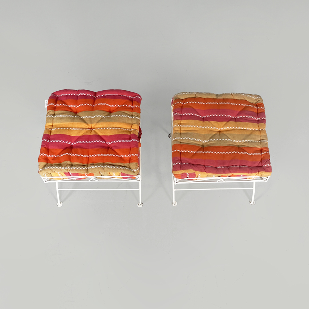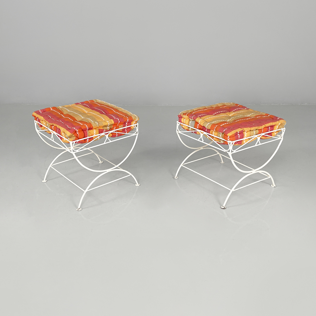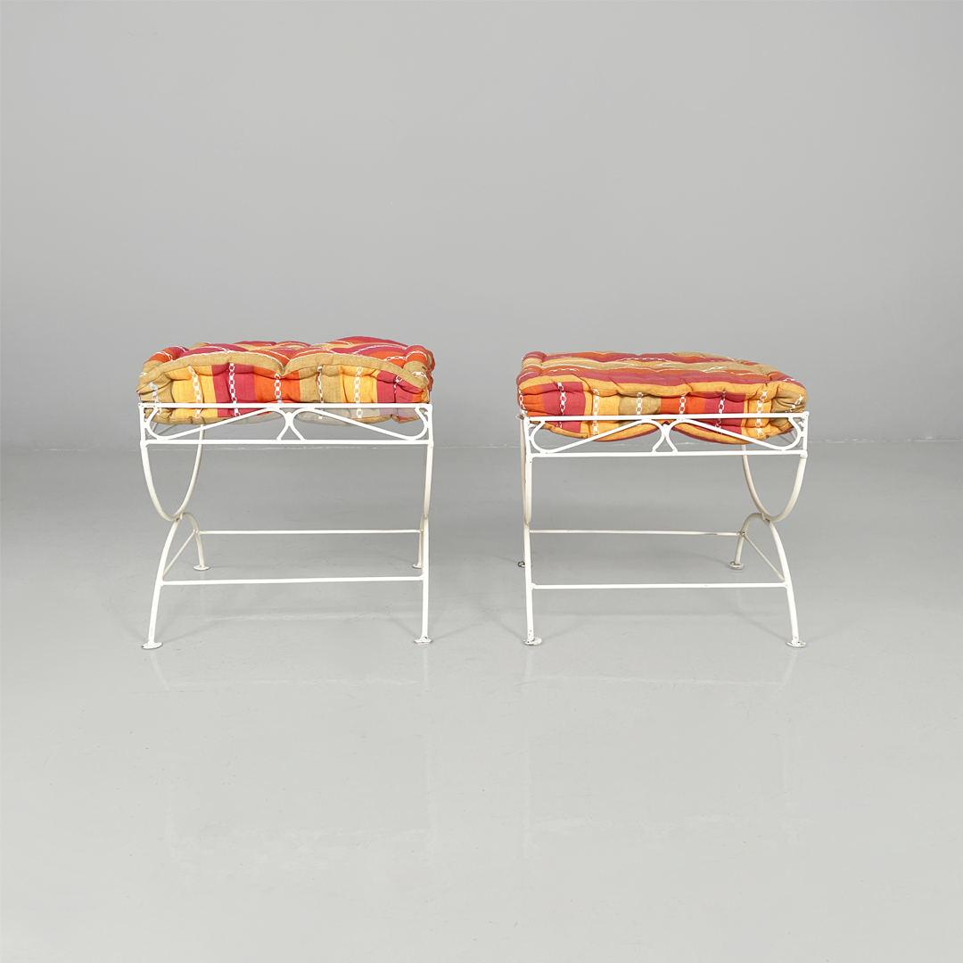 Coppia di sgabelli con struttura interamente realizzata in ferro battuto verniciato bianco. La seduta, la quale presenta un motivo decorativo, accoglie un cuscino quadrato rivestito in tessuto a righe dai colori caldi. Le zampe hanno forme curve e terminano con dei piedini tondi piatti. Adatte per essere usate in giardino o in esterno, oltre che per uso domestico interno.