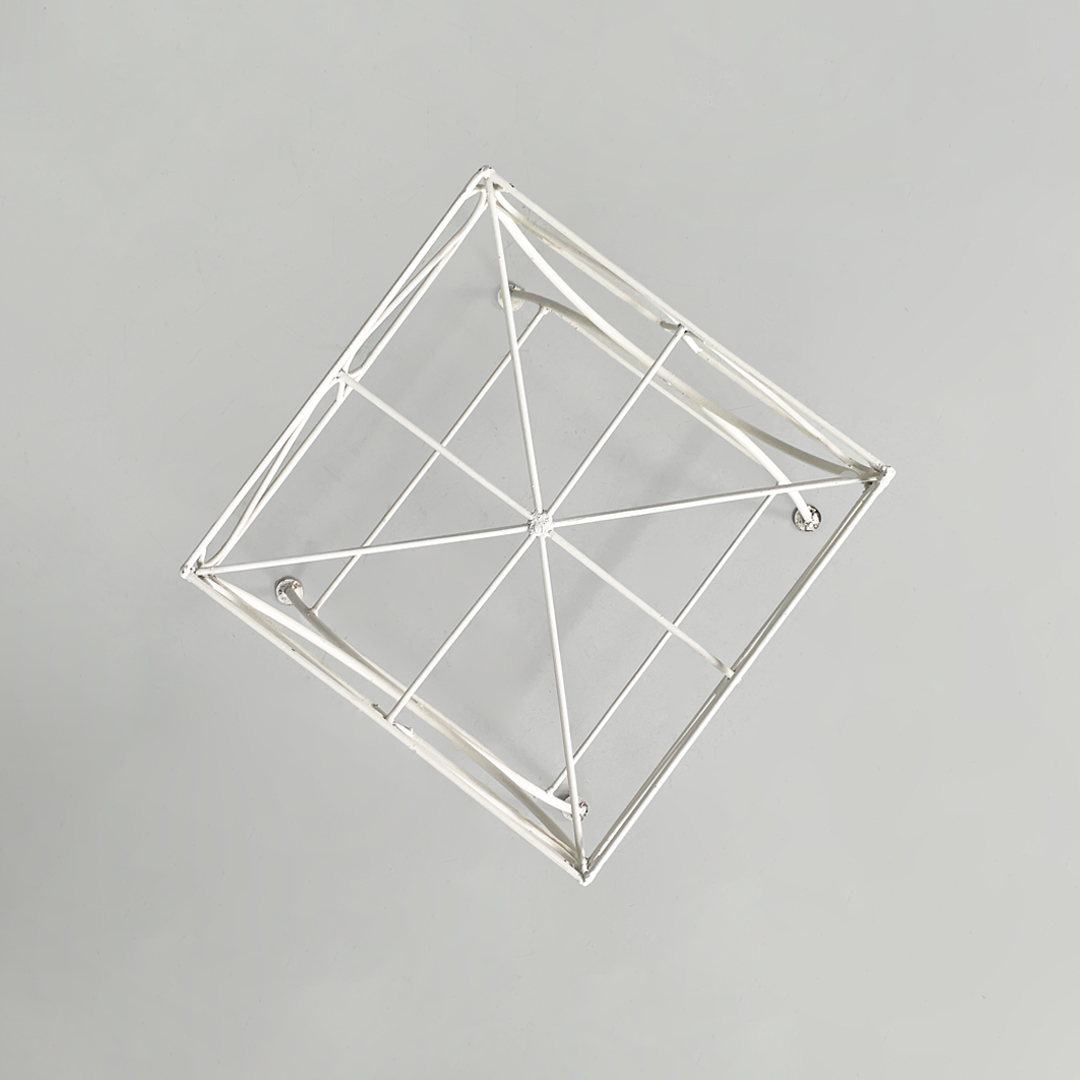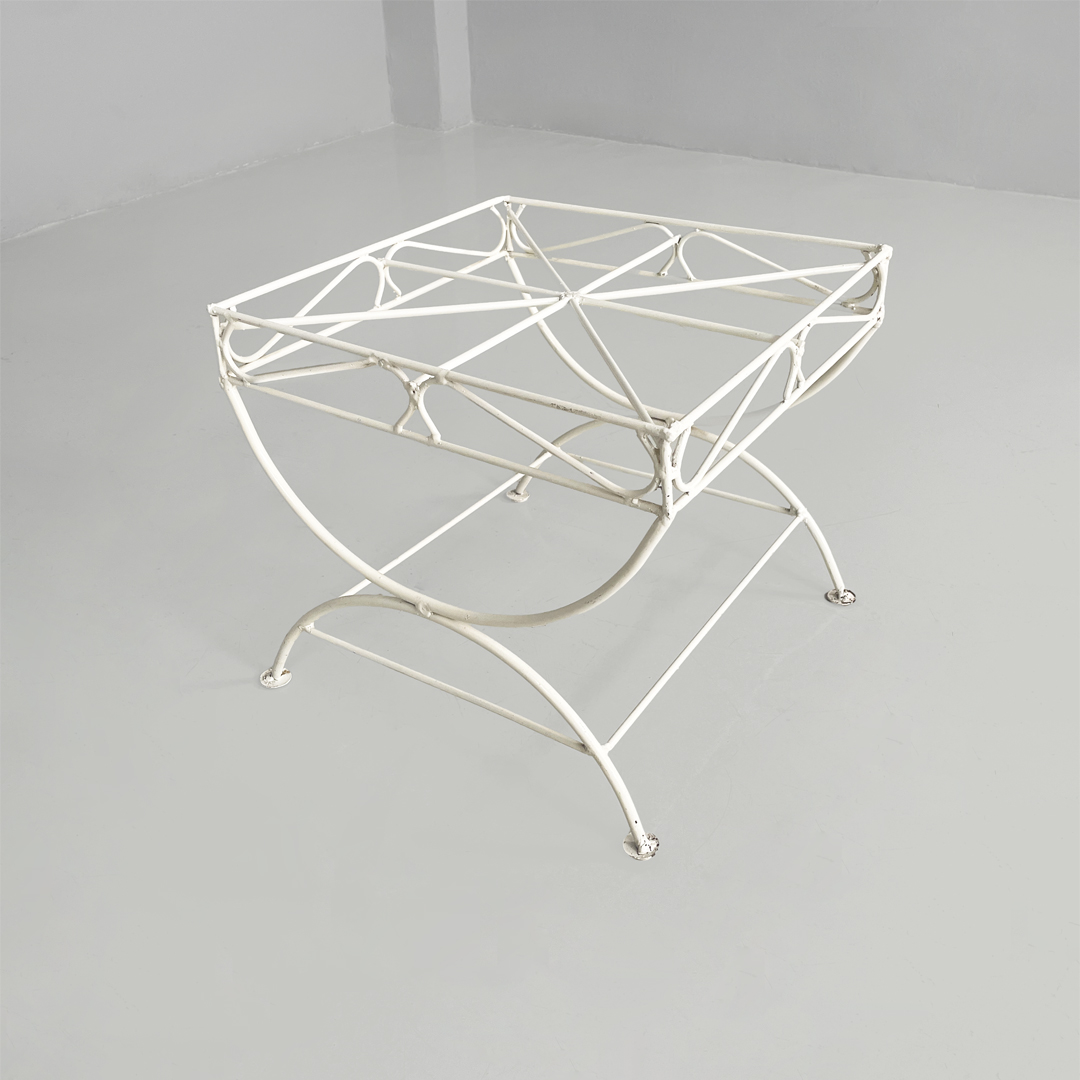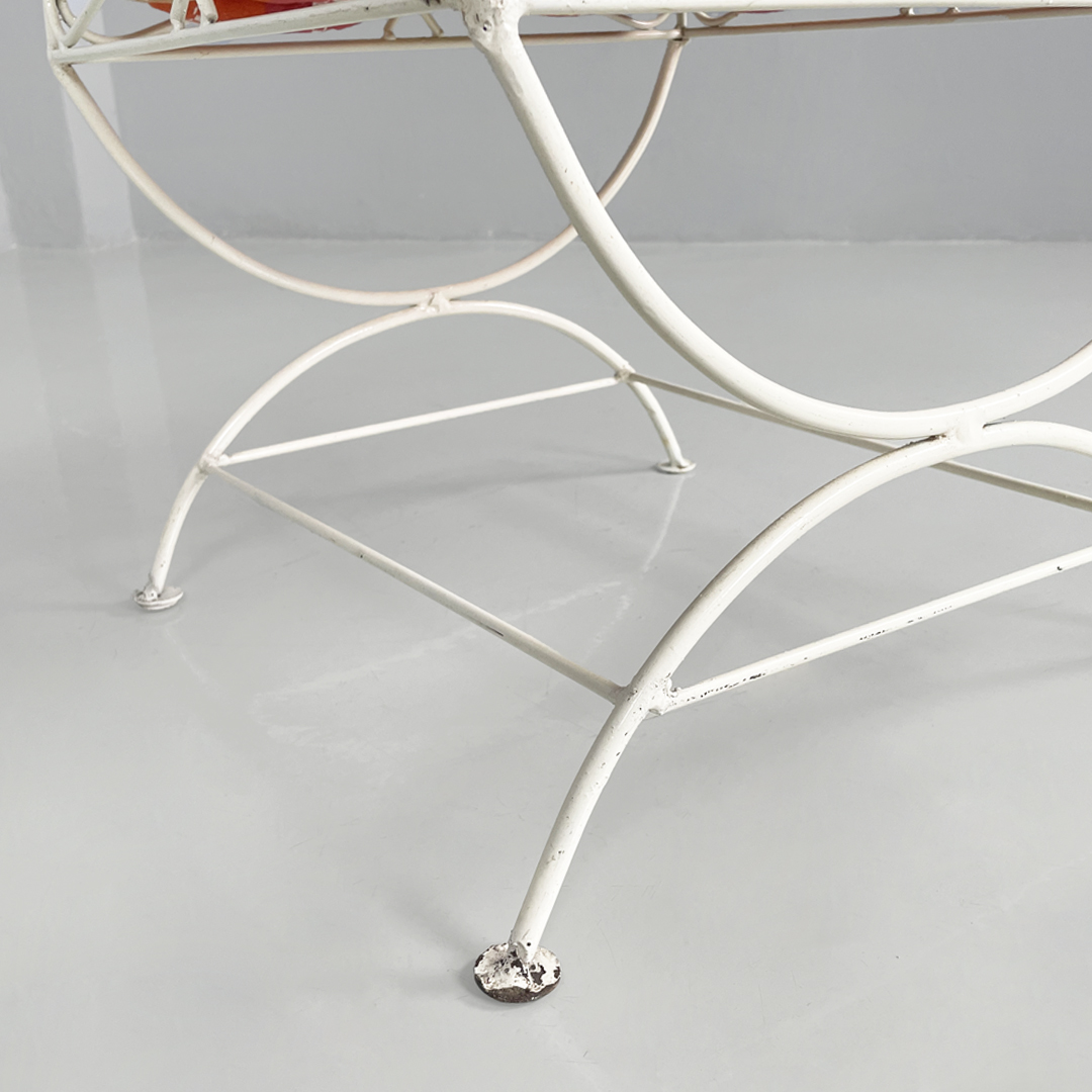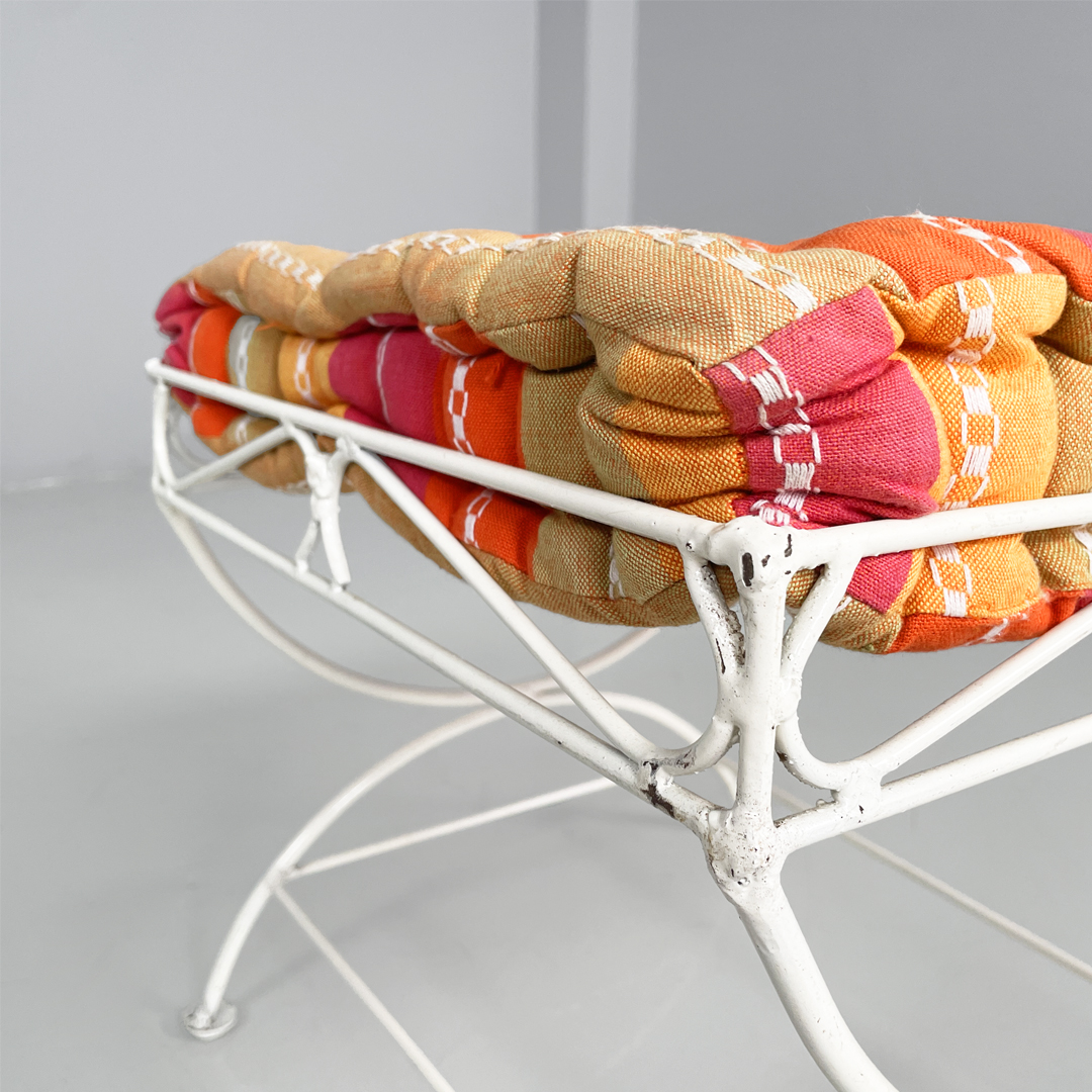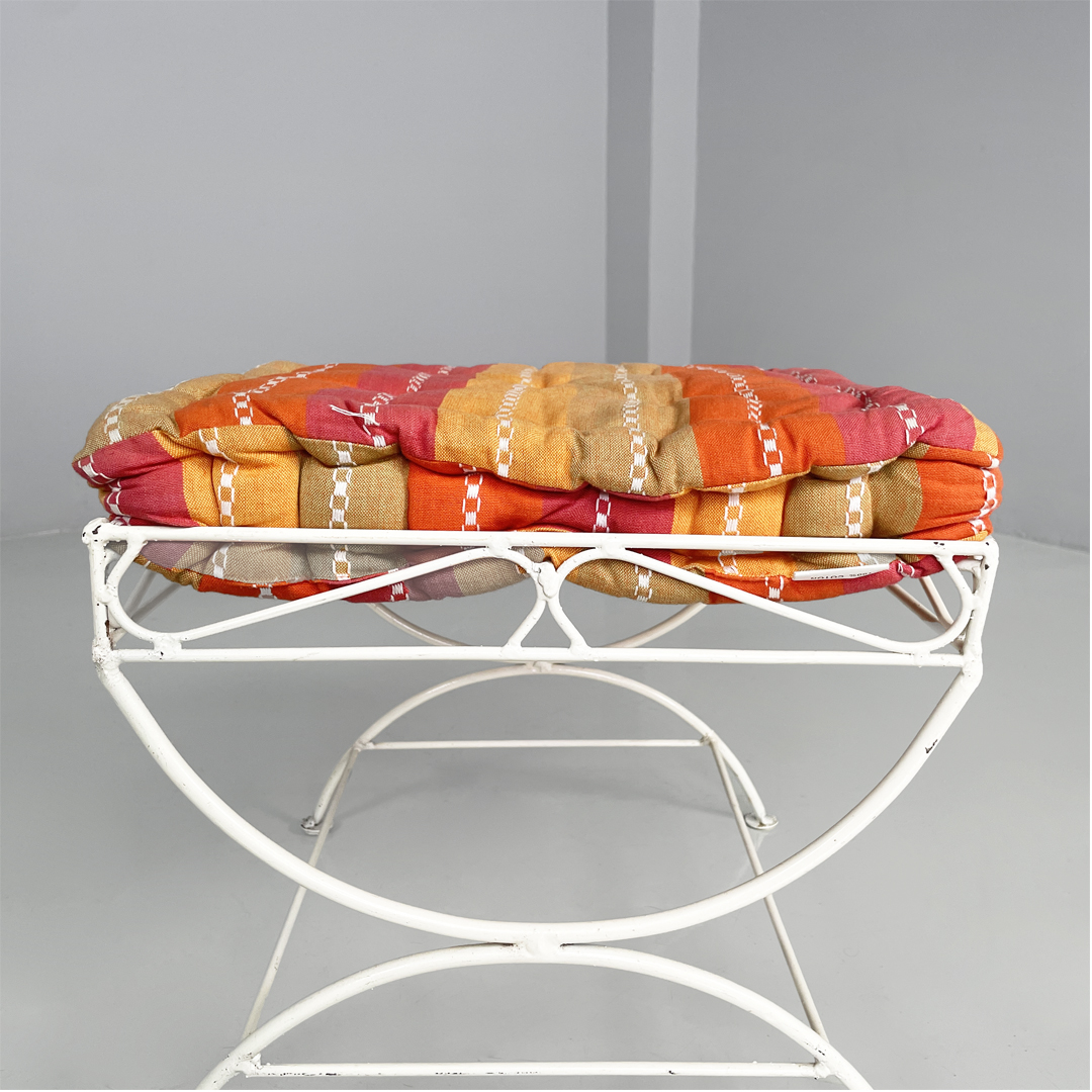 Coppia di sgabelli con struttura interamente realizzata in ferro battuto verniciato bianco. La seduta, la quale presenta un motivo decorativo, accoglie un cuscino quadrato rivestito in tessuto a righe dai colori caldi. Le zampe hanno forme curve e terminano con dei piedini tondi piatti. Adatte per essere usate in giardino o in esterno, oltre che per uso domestico interno.