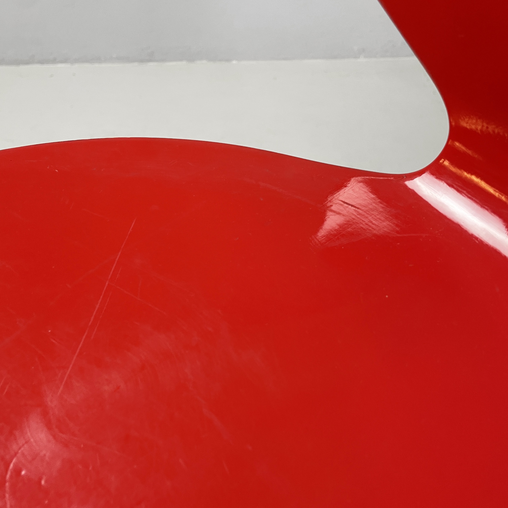 Set di tre sgabelli da bar con seduta e schienale sagomati in legno verniciato rosso. La struttura che comprende le tre zampe e poggiapiedi è in tondino di metallo verniciato rosso.
