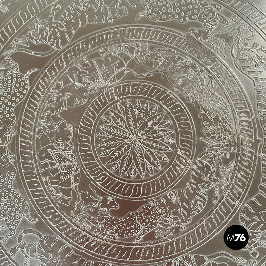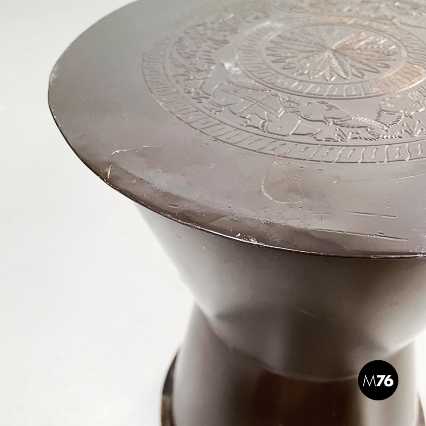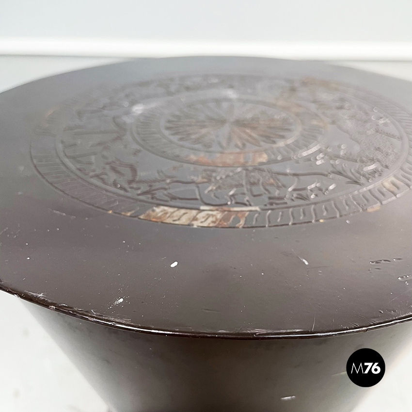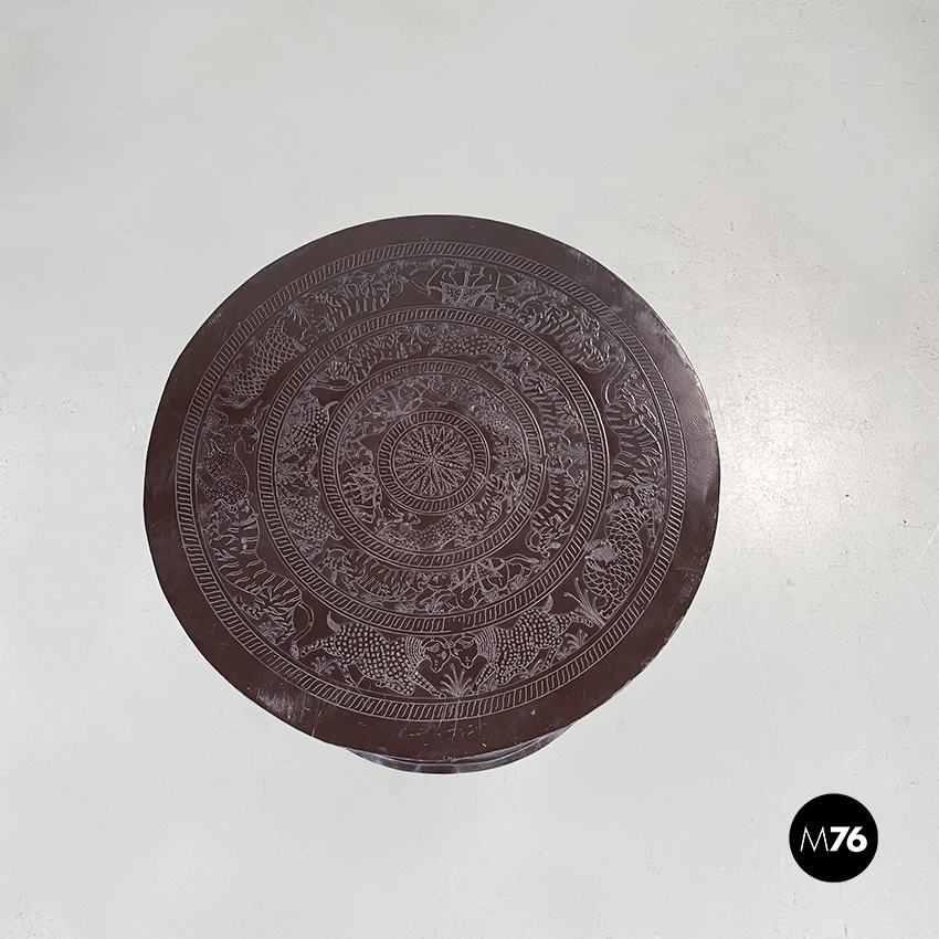 Set composto da un tavolo da caffè e due sgabelli tondi in metallo verniciato marrone. Il tavolo e gli sgabelli presentano una forma a clessidra. Sul piano del tavolo e sulle sedute sono preseti dei disegni disposti su cerchi concentrici di animali e piante di origine indiana. Adatto ad uso esterno come in giardino.