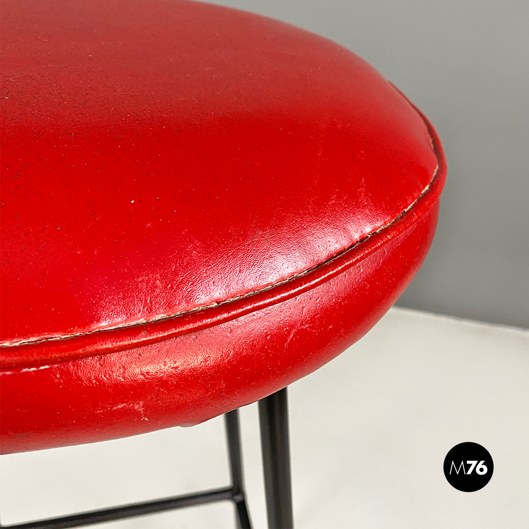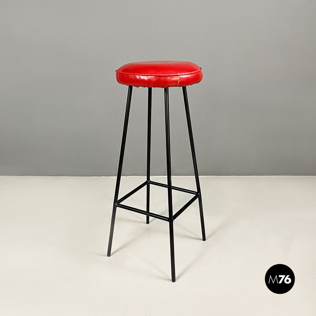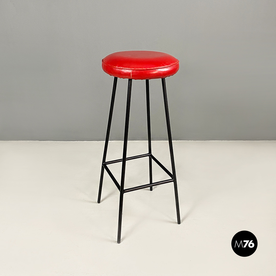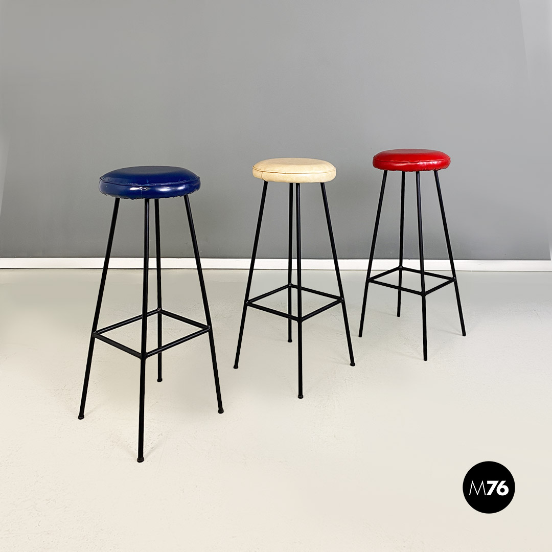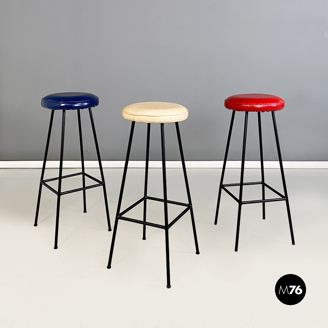 Set di tre sgabelli con struttura in tondino di metallo verniciato nero opaco e sedute di forma tonda imbottite e rivestite nel loro sky originale in tre colorazioni: beige rosso e blu.