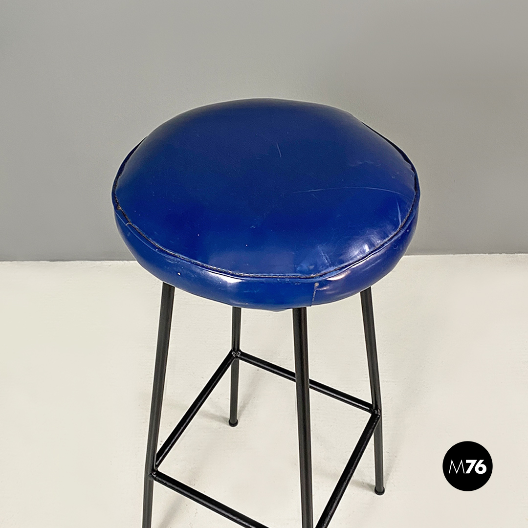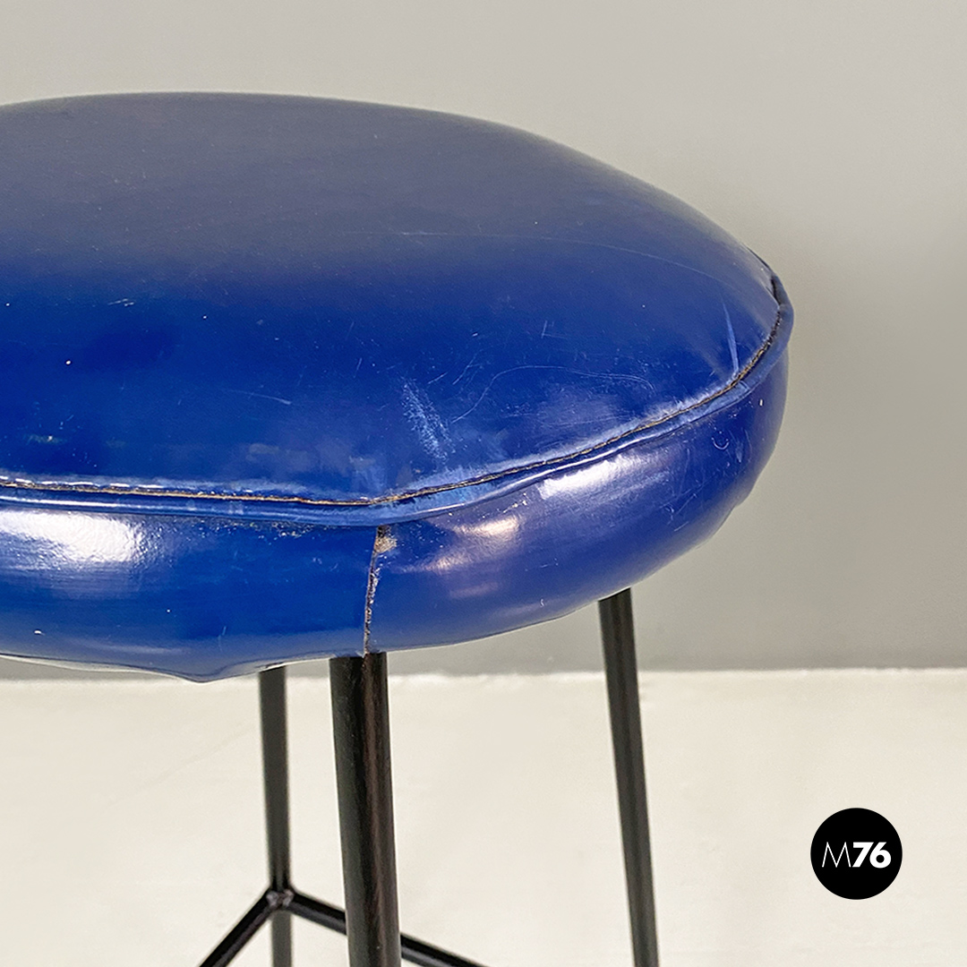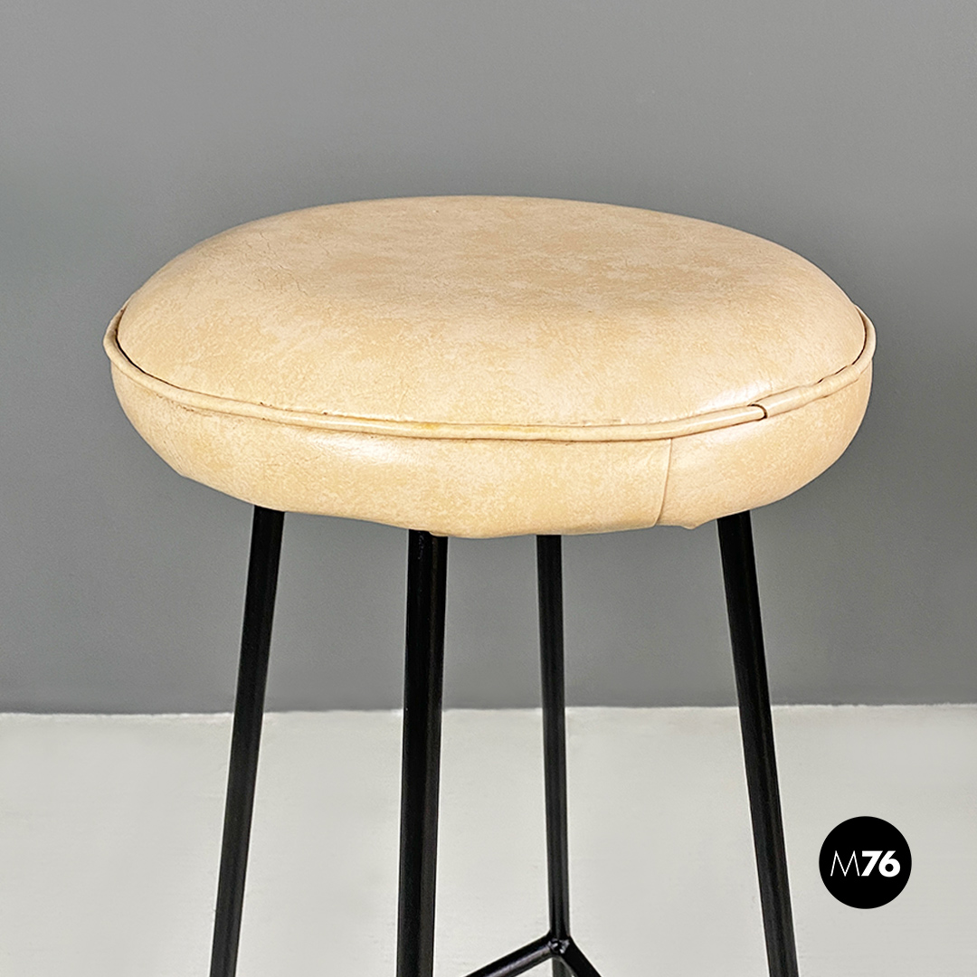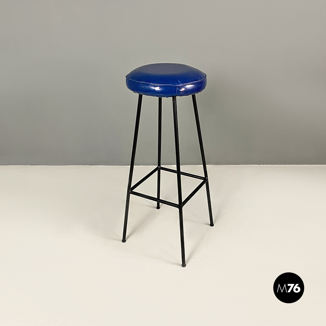 Set di tre sgabelli con struttura in tondino di metallo verniciato nero opaco e sedute di forma tonda imbottite e rivestite nel loro sky originale in tre colorazioni: beige rosso e blu.