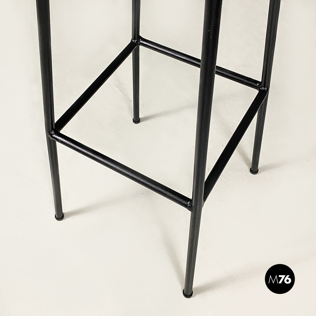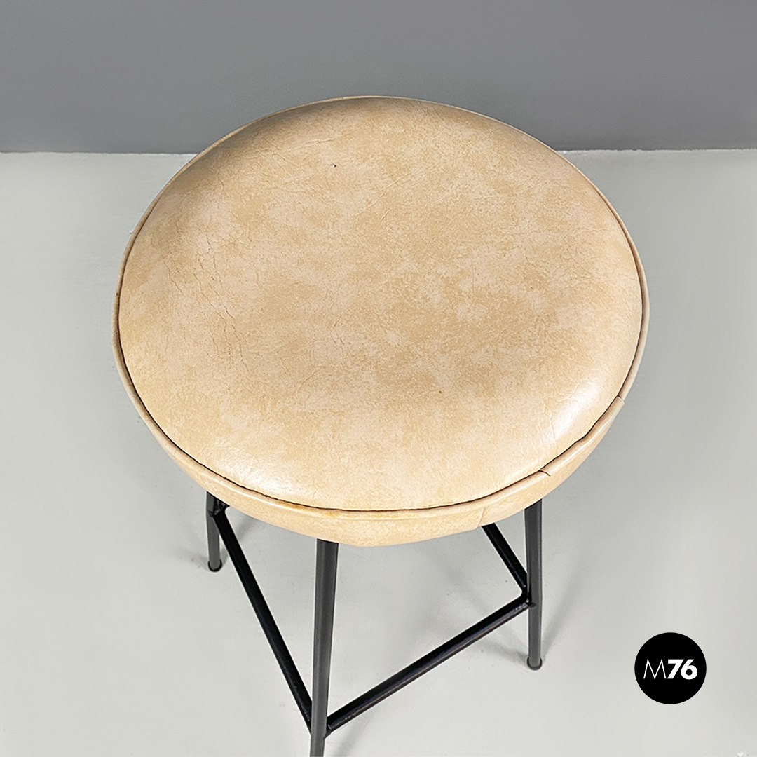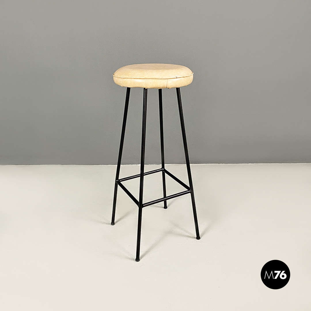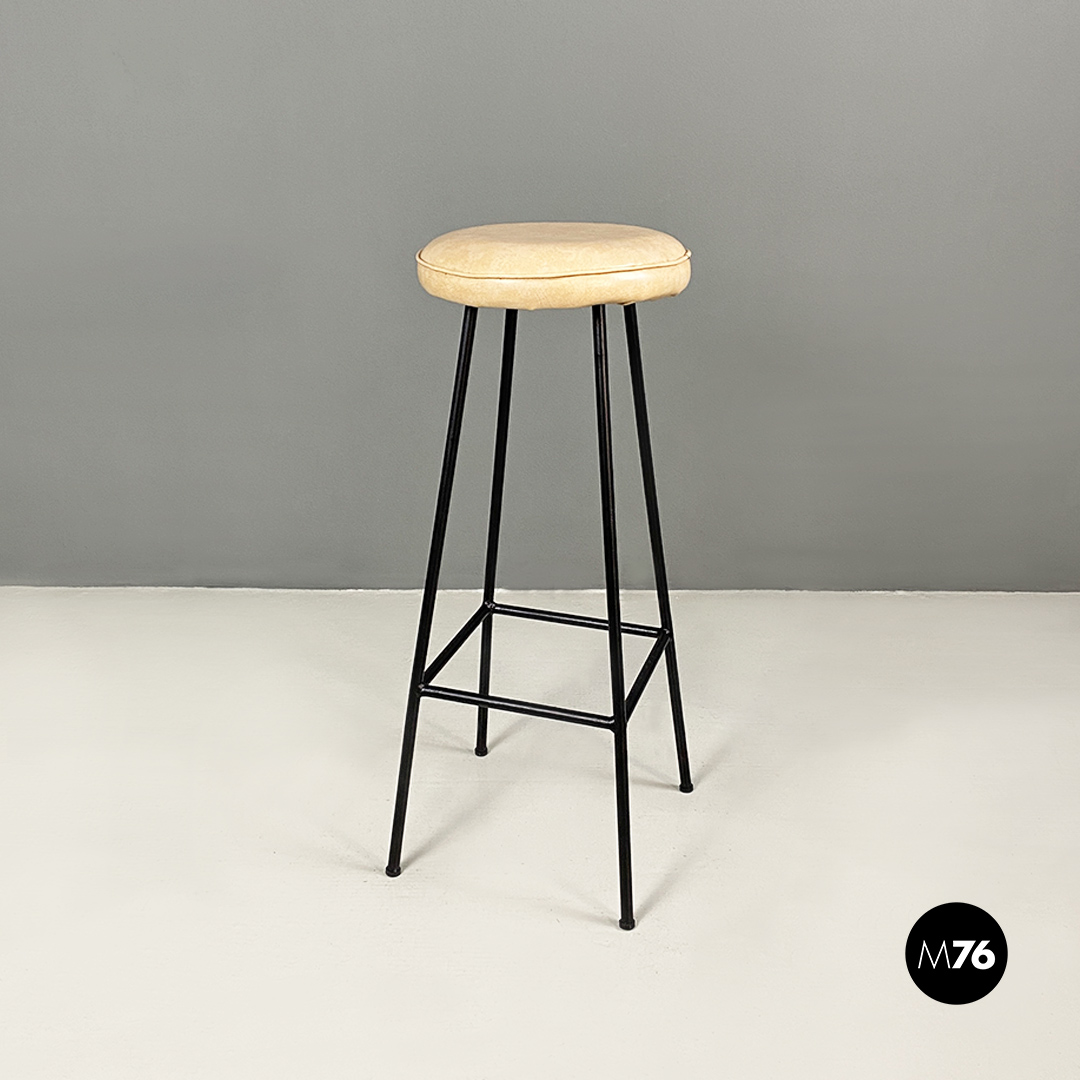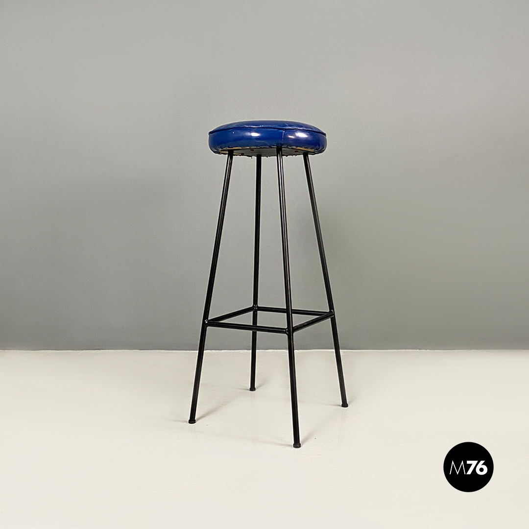 Set di tre sgabelli con struttura in tondino di metallo verniciato nero opaco e sedute di forma tonda imbottite e rivestite nel loro sky originale in tre colorazioni: beige rosso e blu.