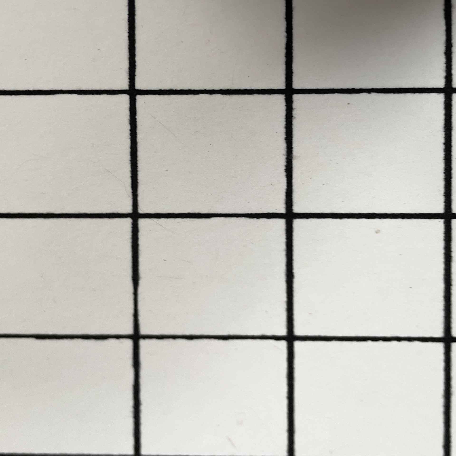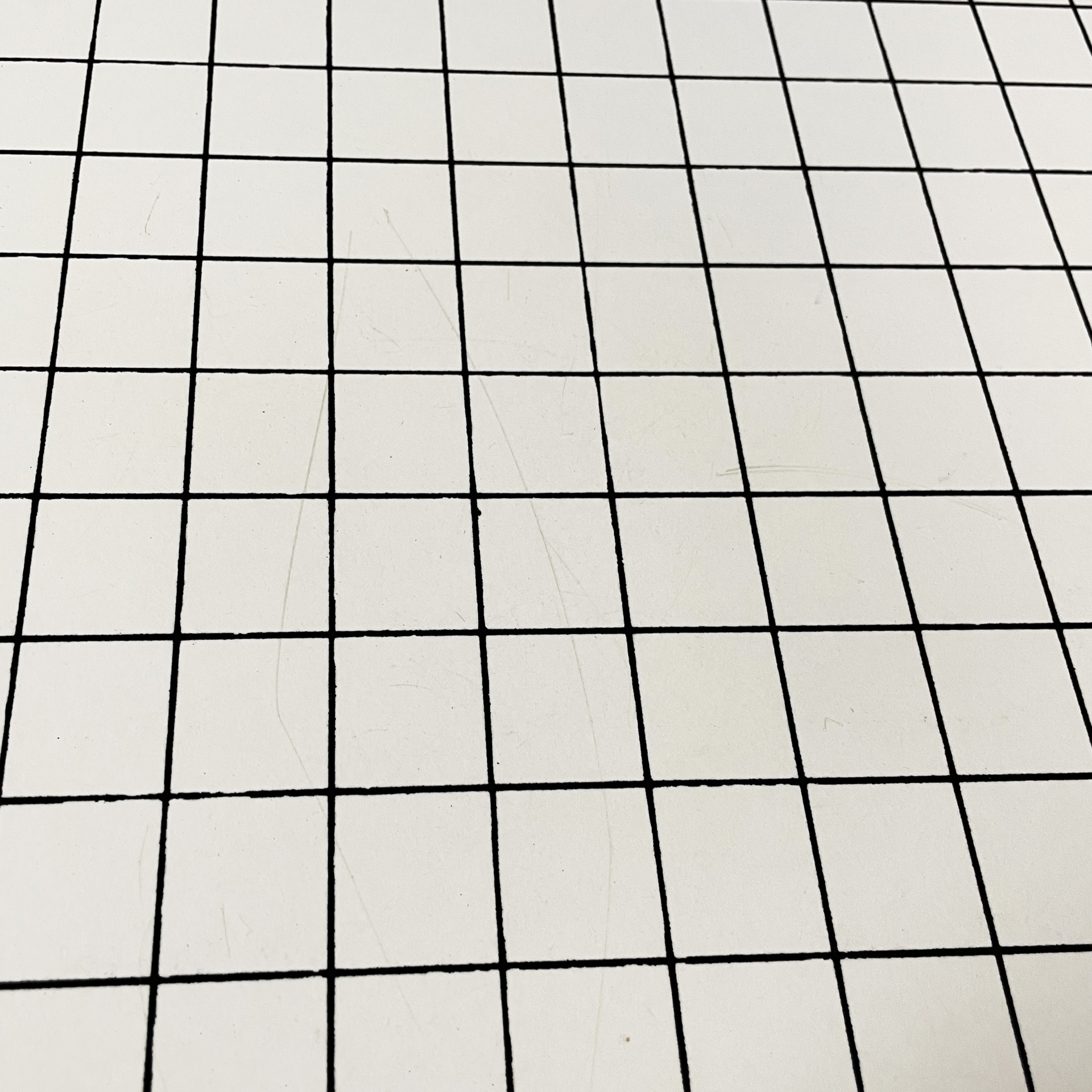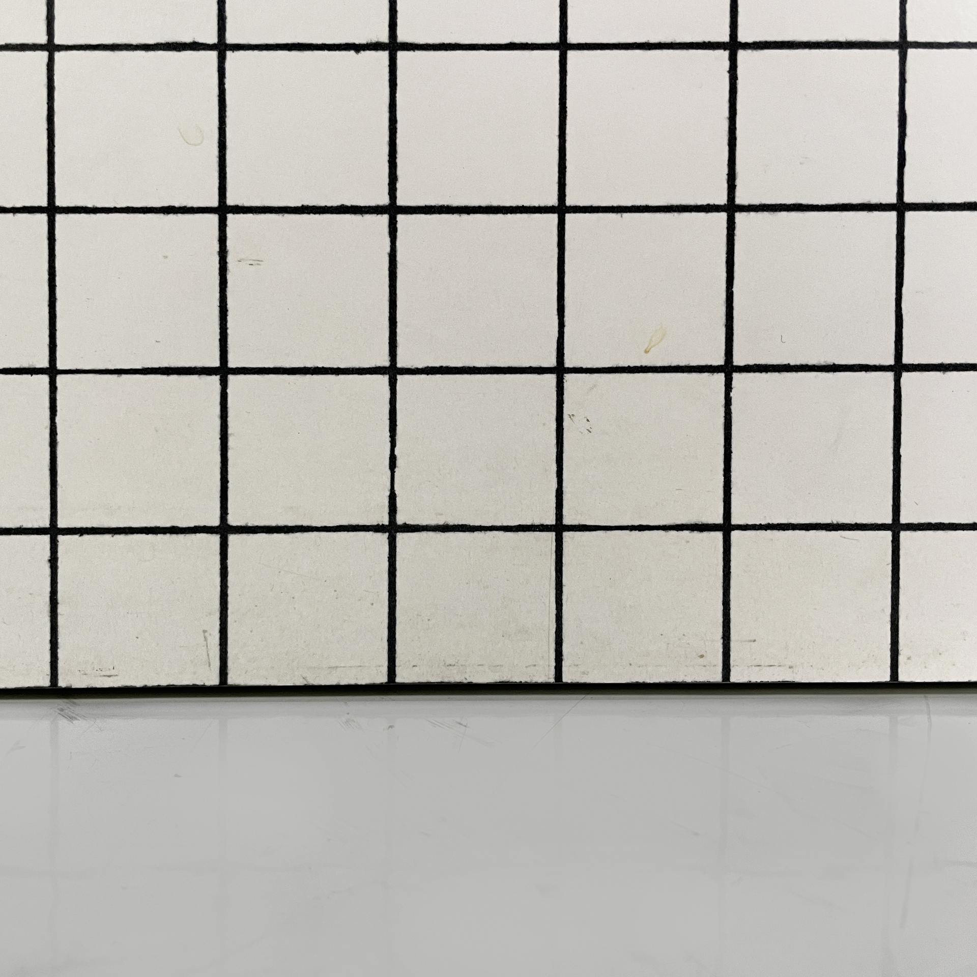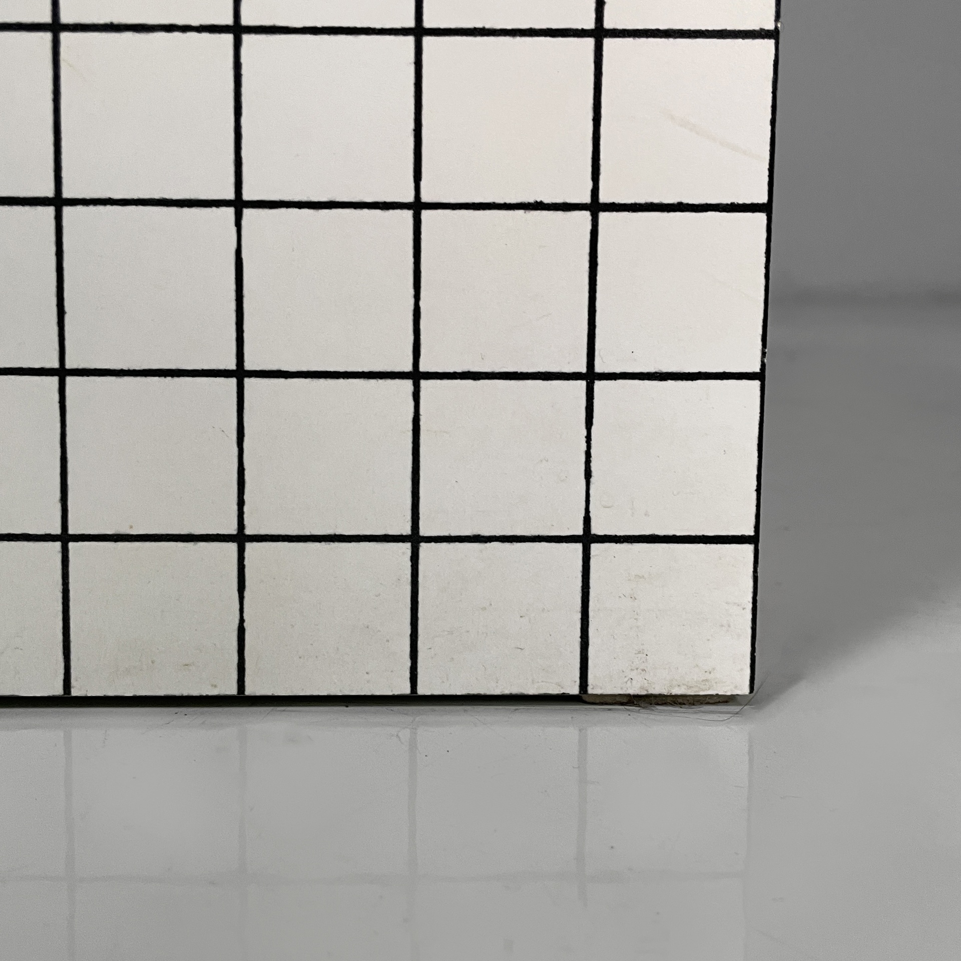 Set di quattro sgabelli modello Quaderna in legno con finitura in laminato bianco con stampa a quadrati di tre cm a righe nere. La seduta è rettangolare.