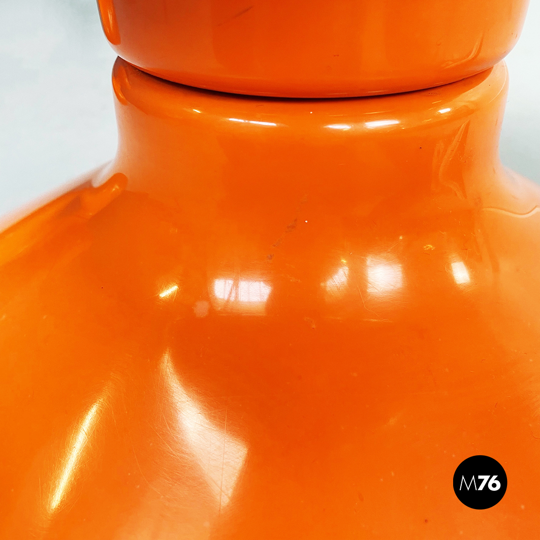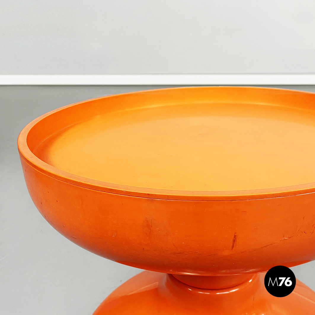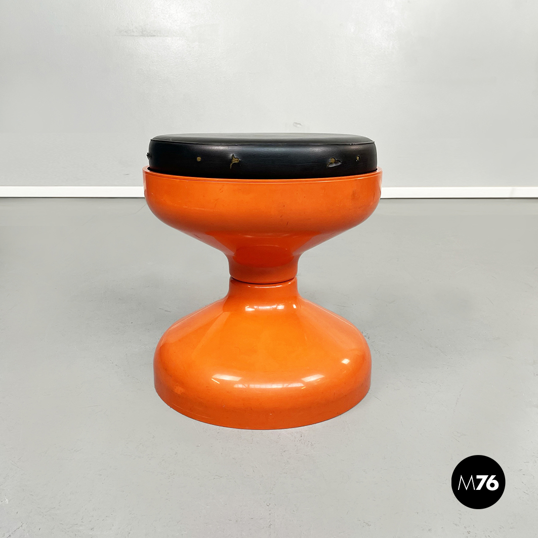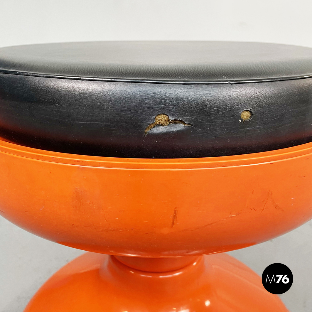 Coppia di sgabelli Rocchetto in plastica arancione. La struttura è di forma sinuosa: si stringe nel mezzo e si allarga verso base e seduta. Sulla seduta tonda è posto un cuscino in pelle nera.