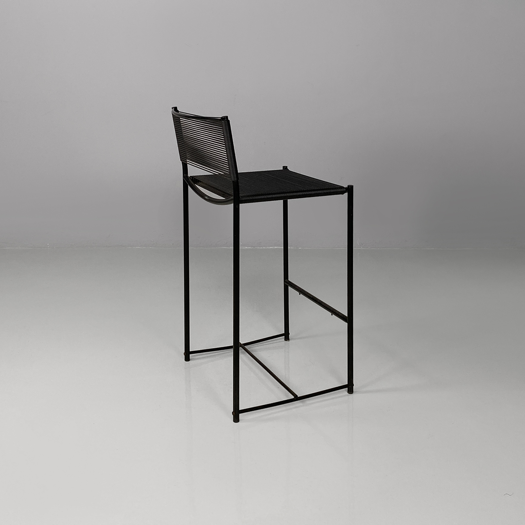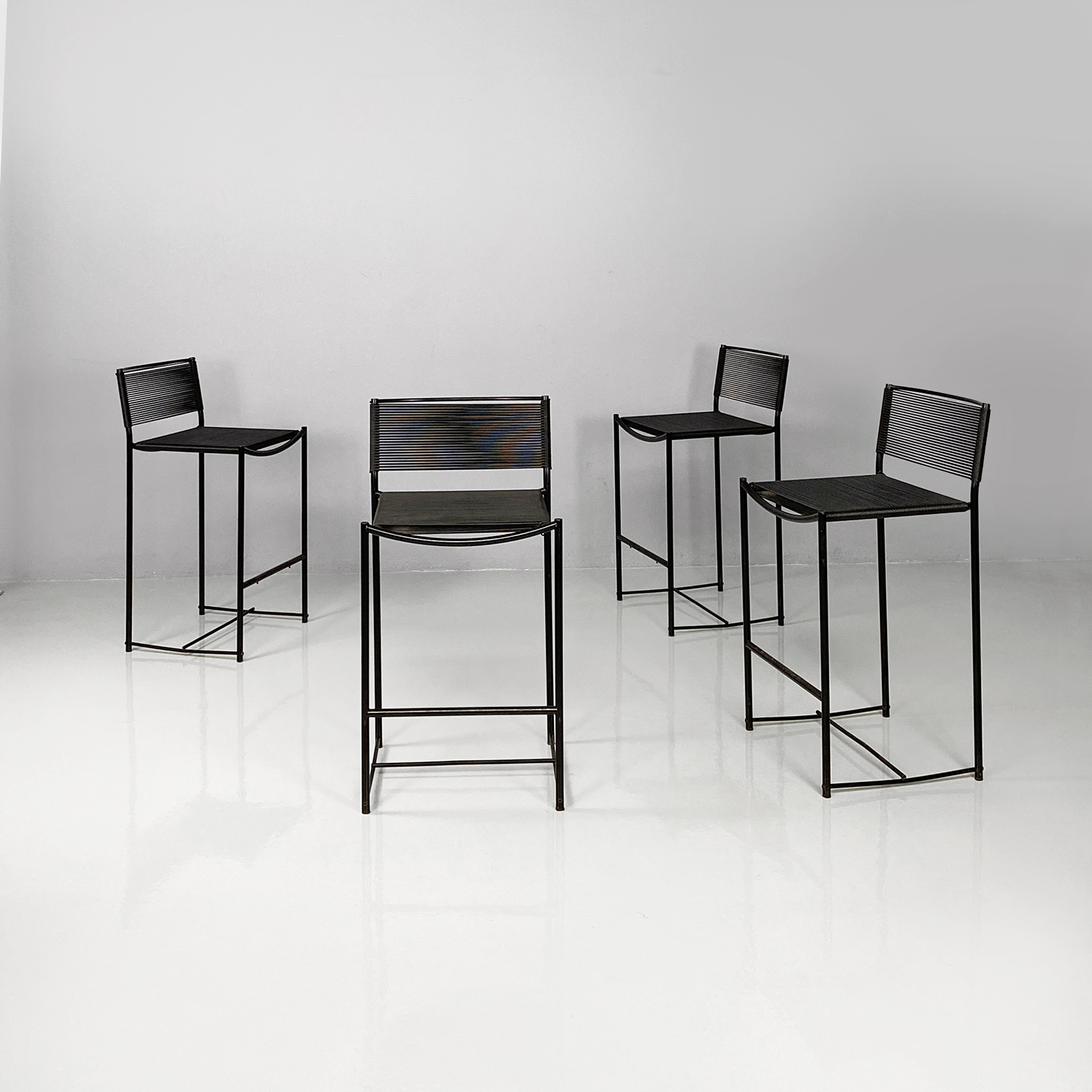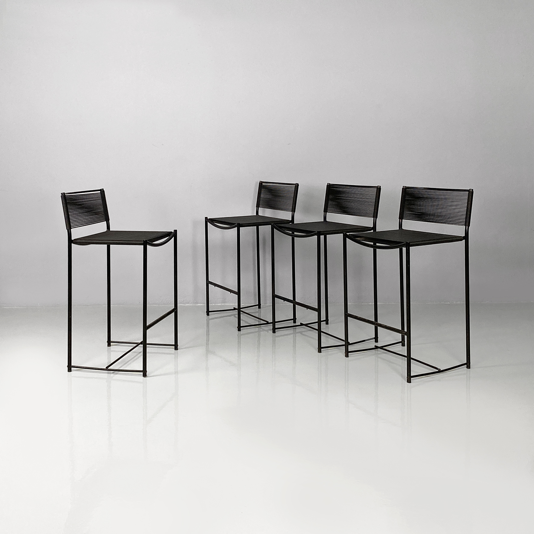 Set di sei sgabelli alti della serie Spaghetti con struttura in tondino di metallo nero e seduta e schienale intrecciati con fili di plastica color nero.