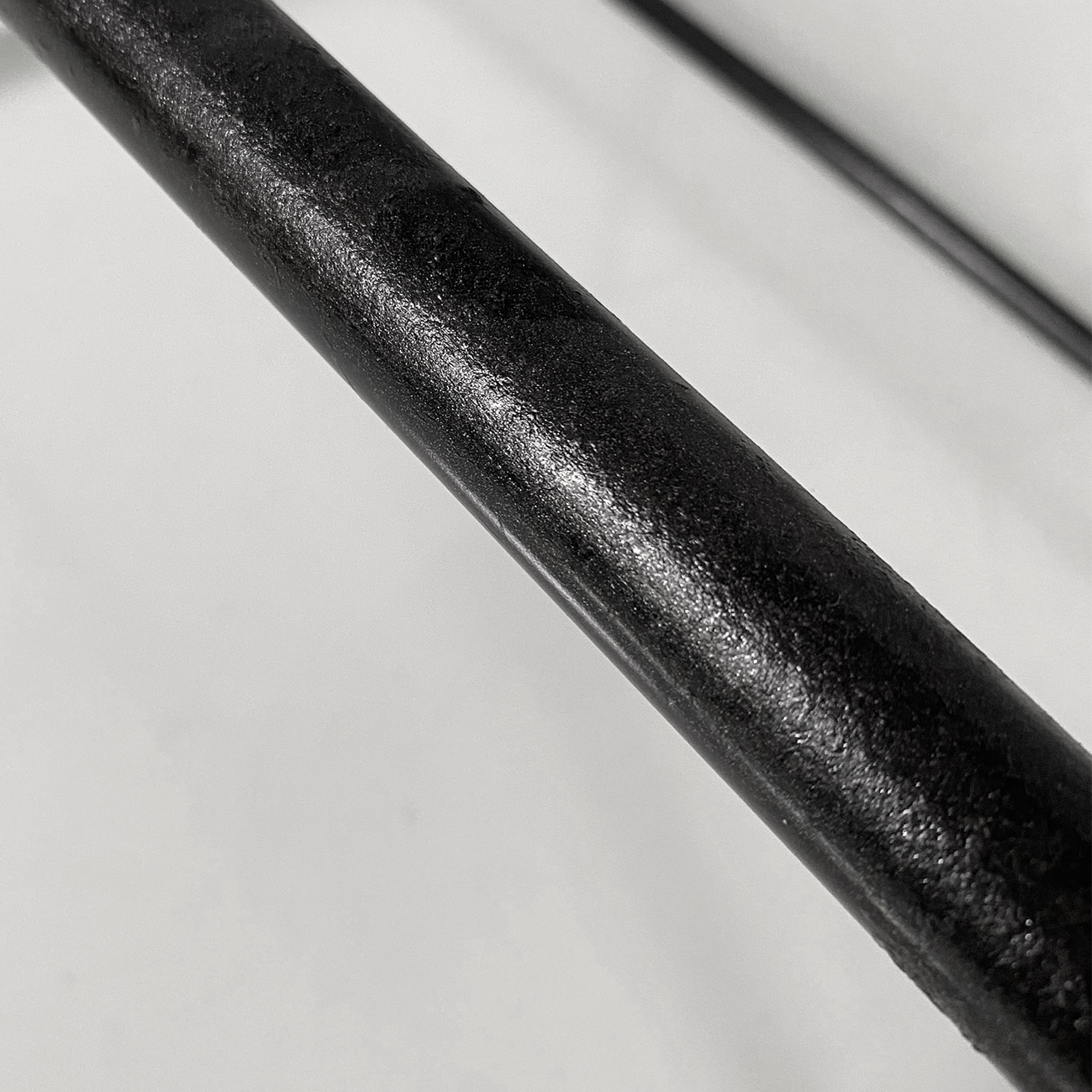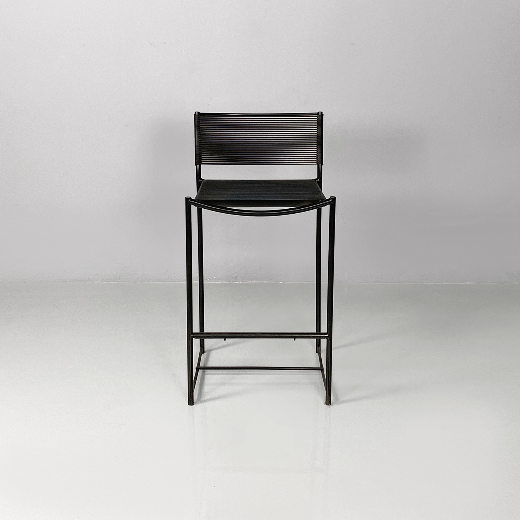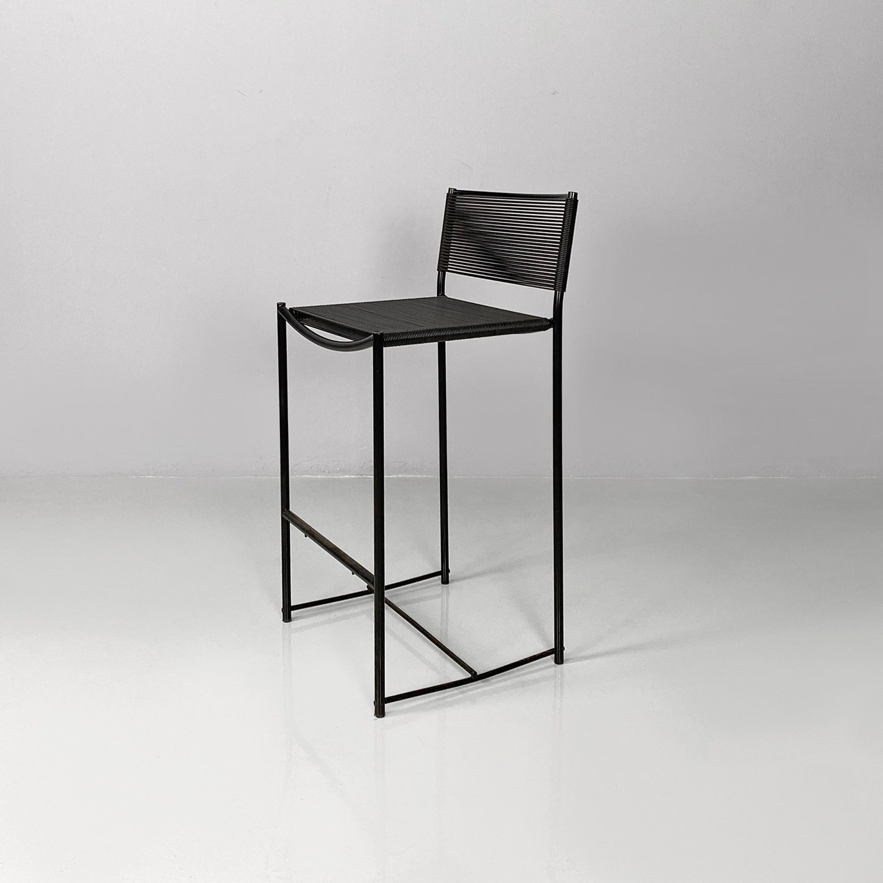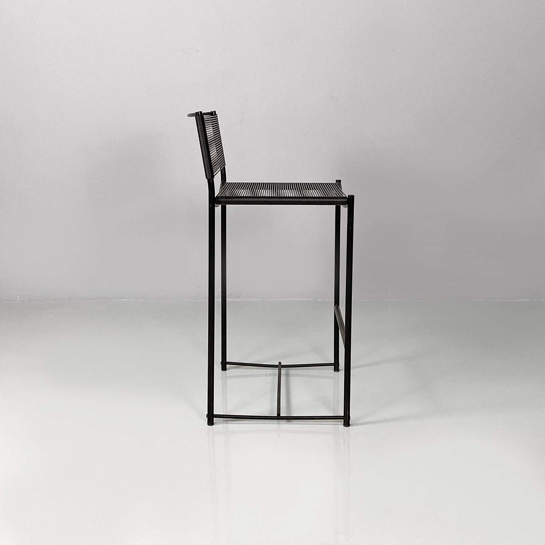 Set di sei sgabelli alti della serie Spaghetti con struttura in tondino di metallo nero e seduta e schienale intrecciati con fili di plastica color nero.