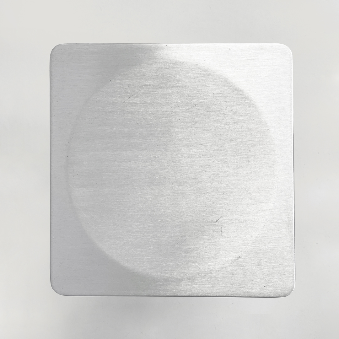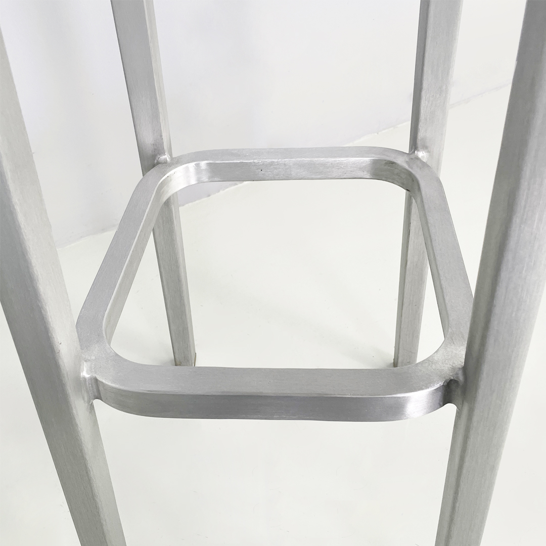 Sgabello interamente in alluminio spazzolato a mano. Presenta una seduta sagomata. Le zampe sono unite da un poggiapiedi dalle forme curve. Piedini in plastica.
