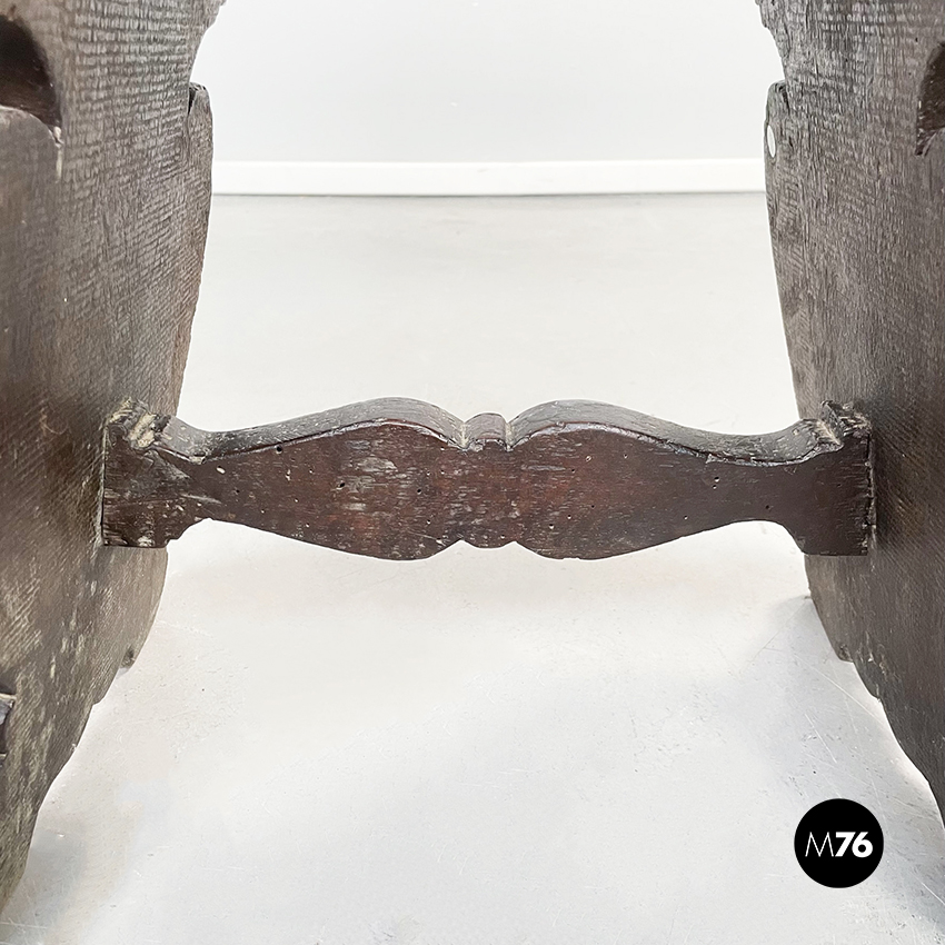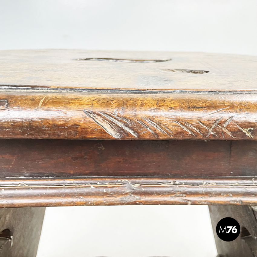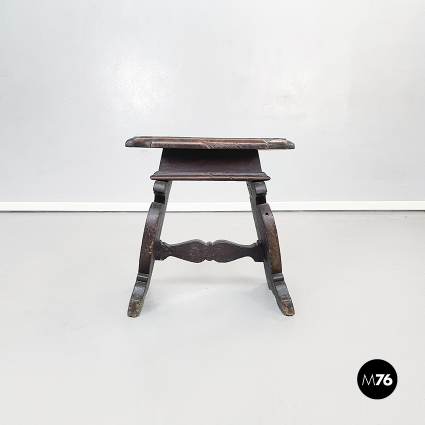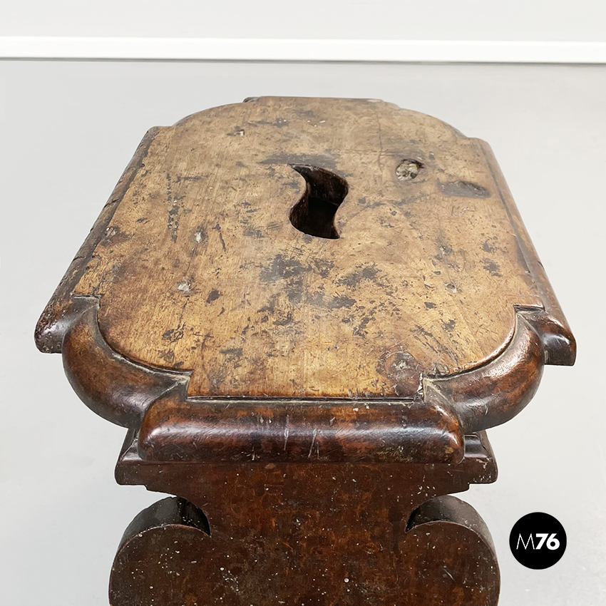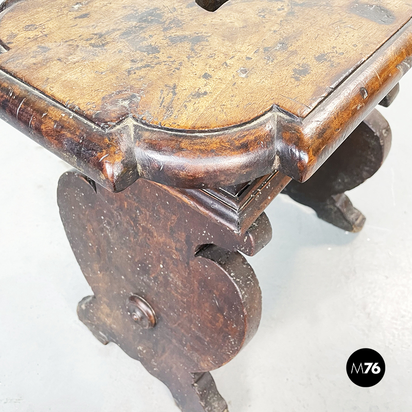 Sgabello d’antiquariato in legno di noce finemente lavorato. La seduta presenta un foro nel centro. Le due gambe tendono ad allargarsi verso il basso.