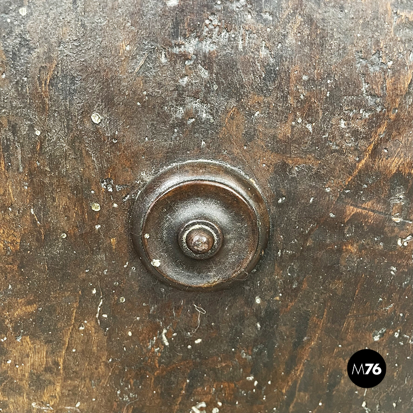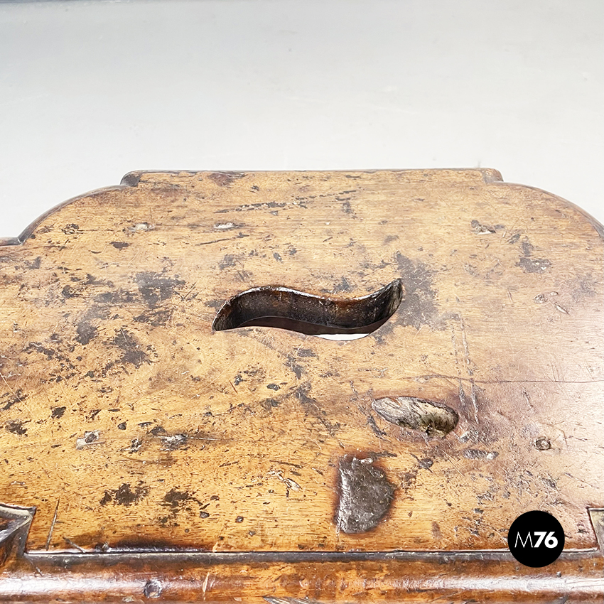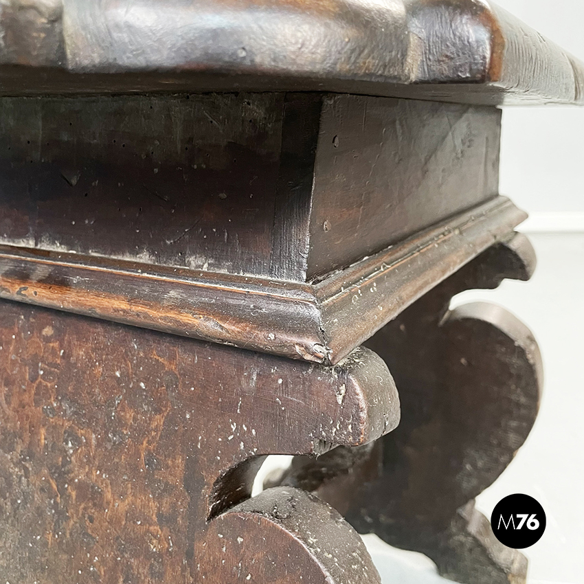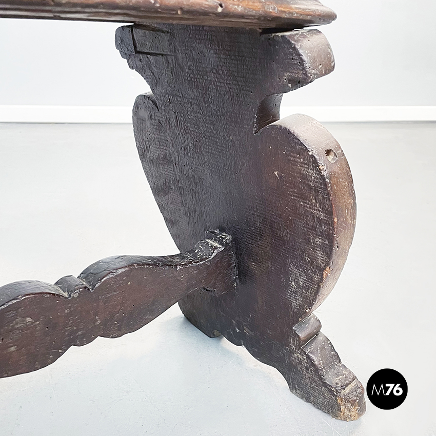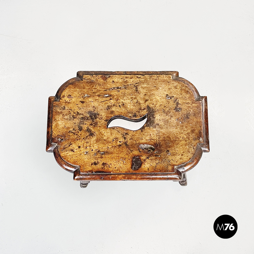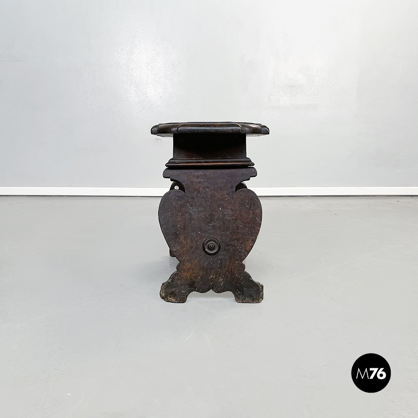 Sgabello d’antiquariato in legno di noce finemente lavorato. La seduta presenta un foro nel centro. Le due gambe tendono ad allargarsi verso il basso.