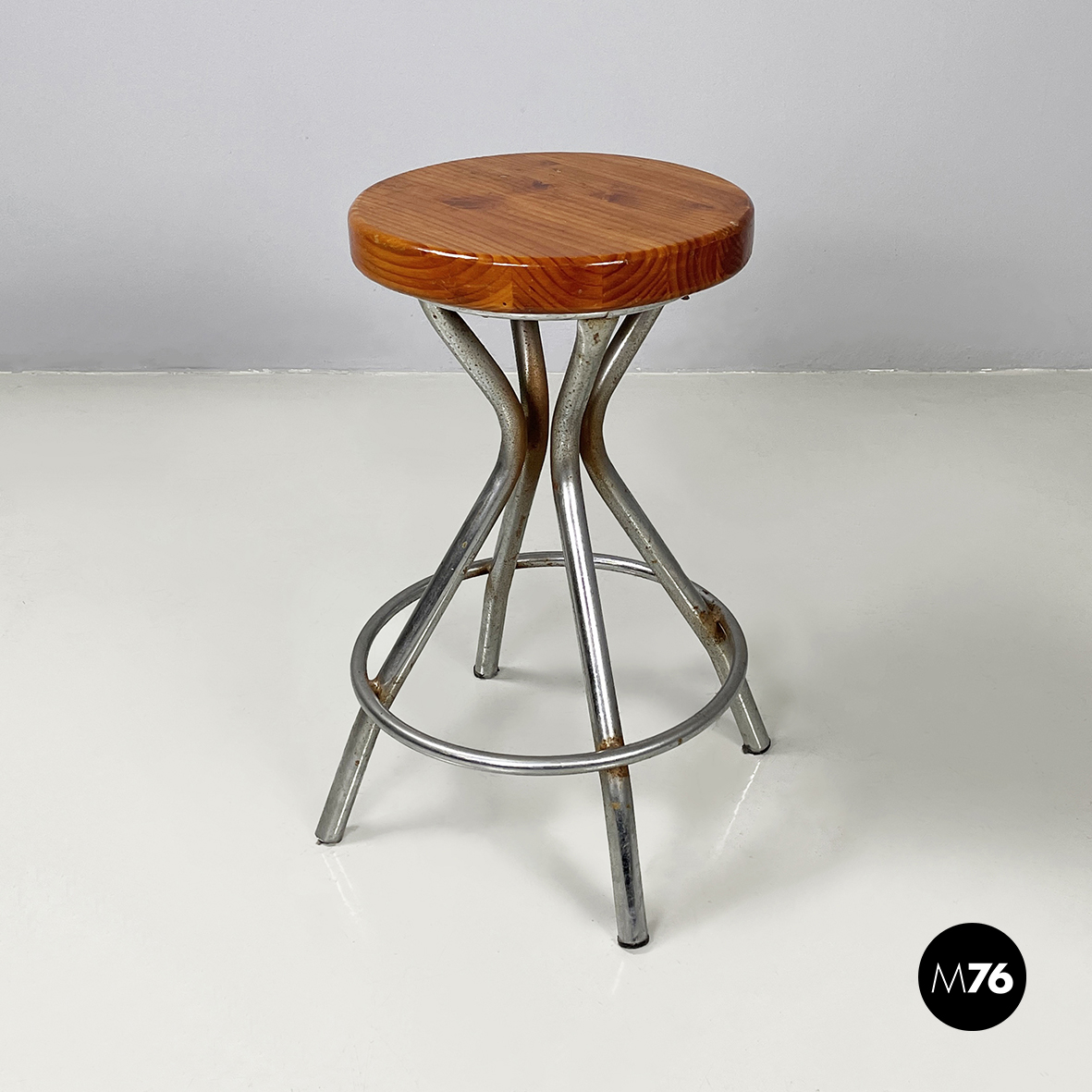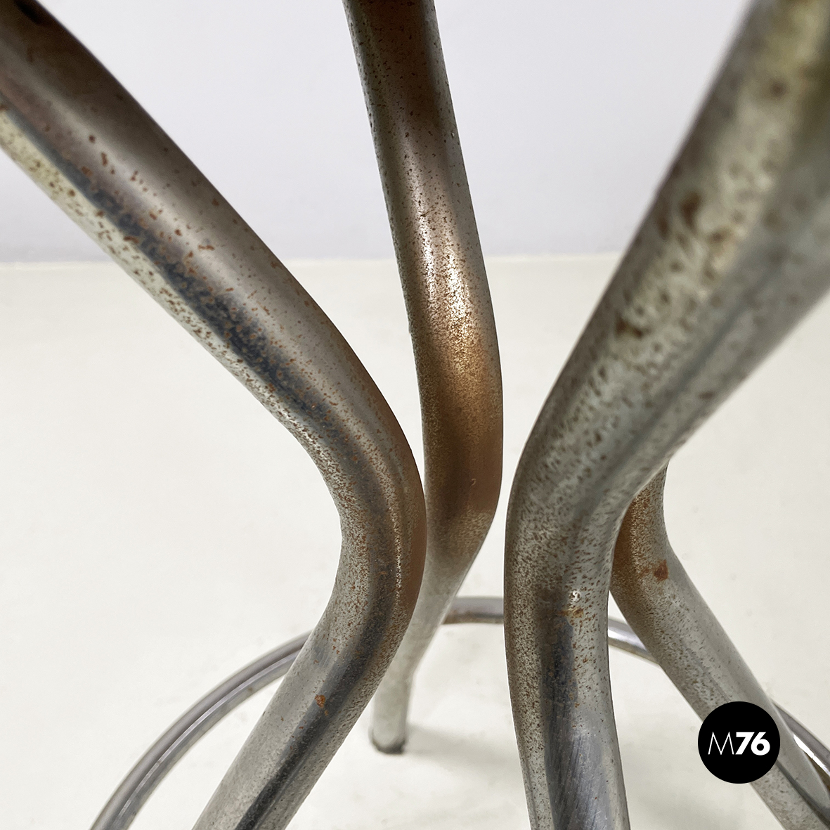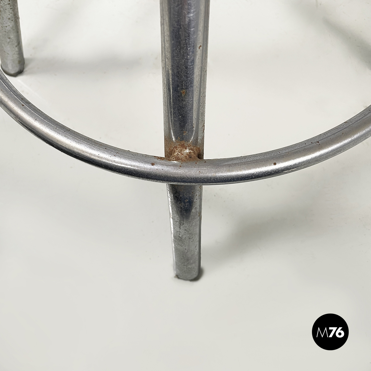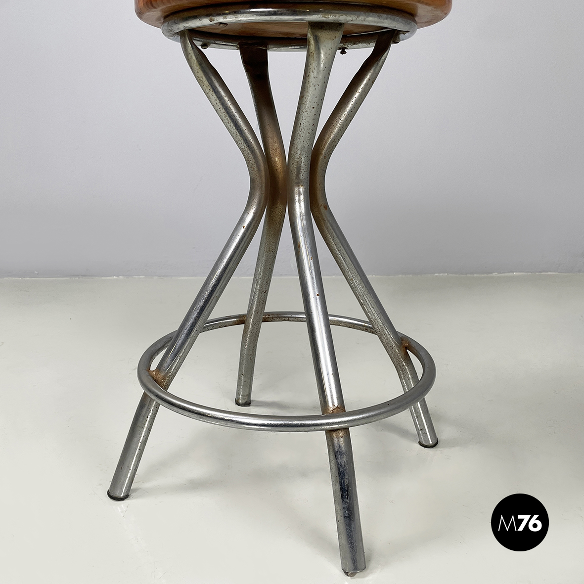 Condizioni vintage. La seduta in legno presenta segni sparsi. Il metallo presenta segni evidenti dati dal tempo.