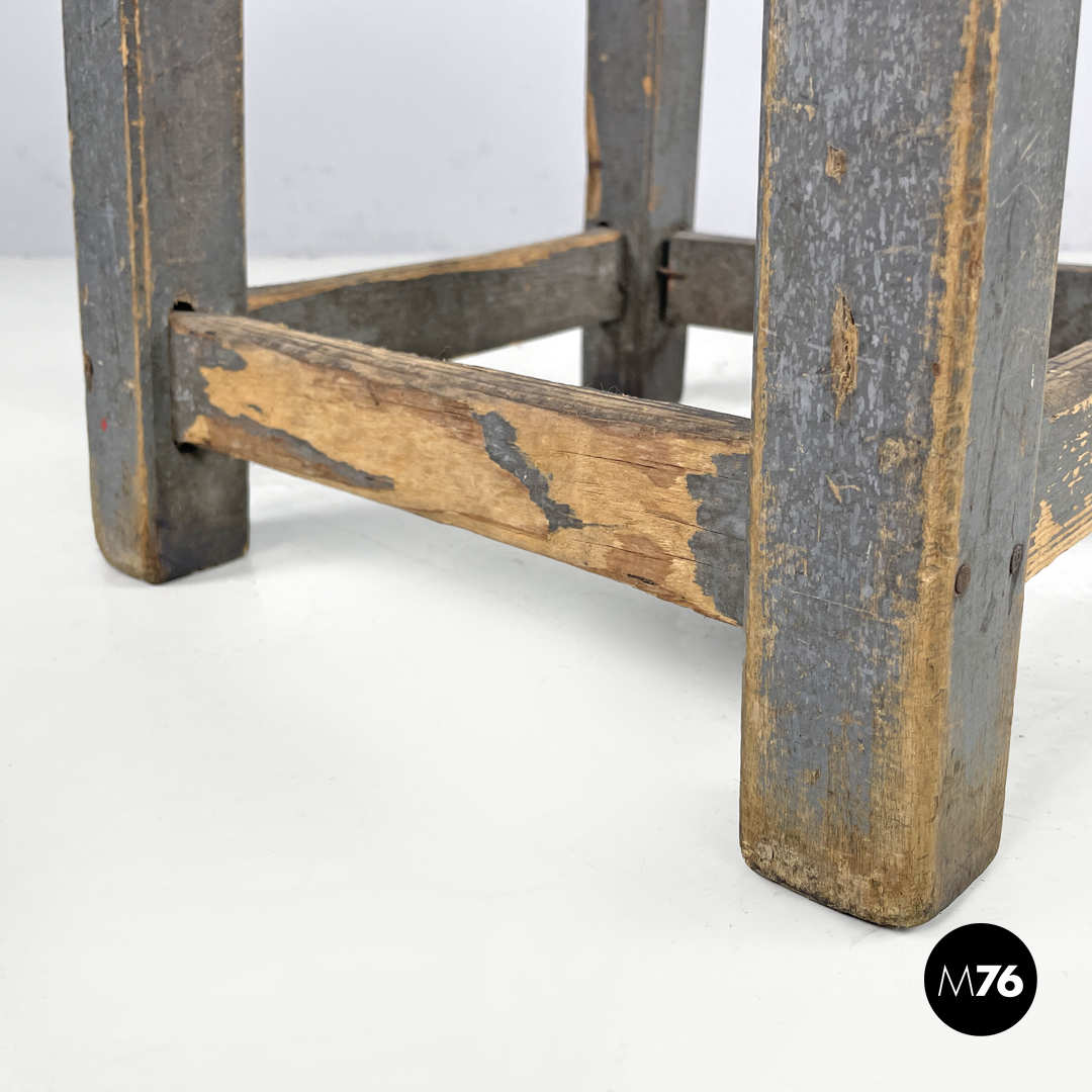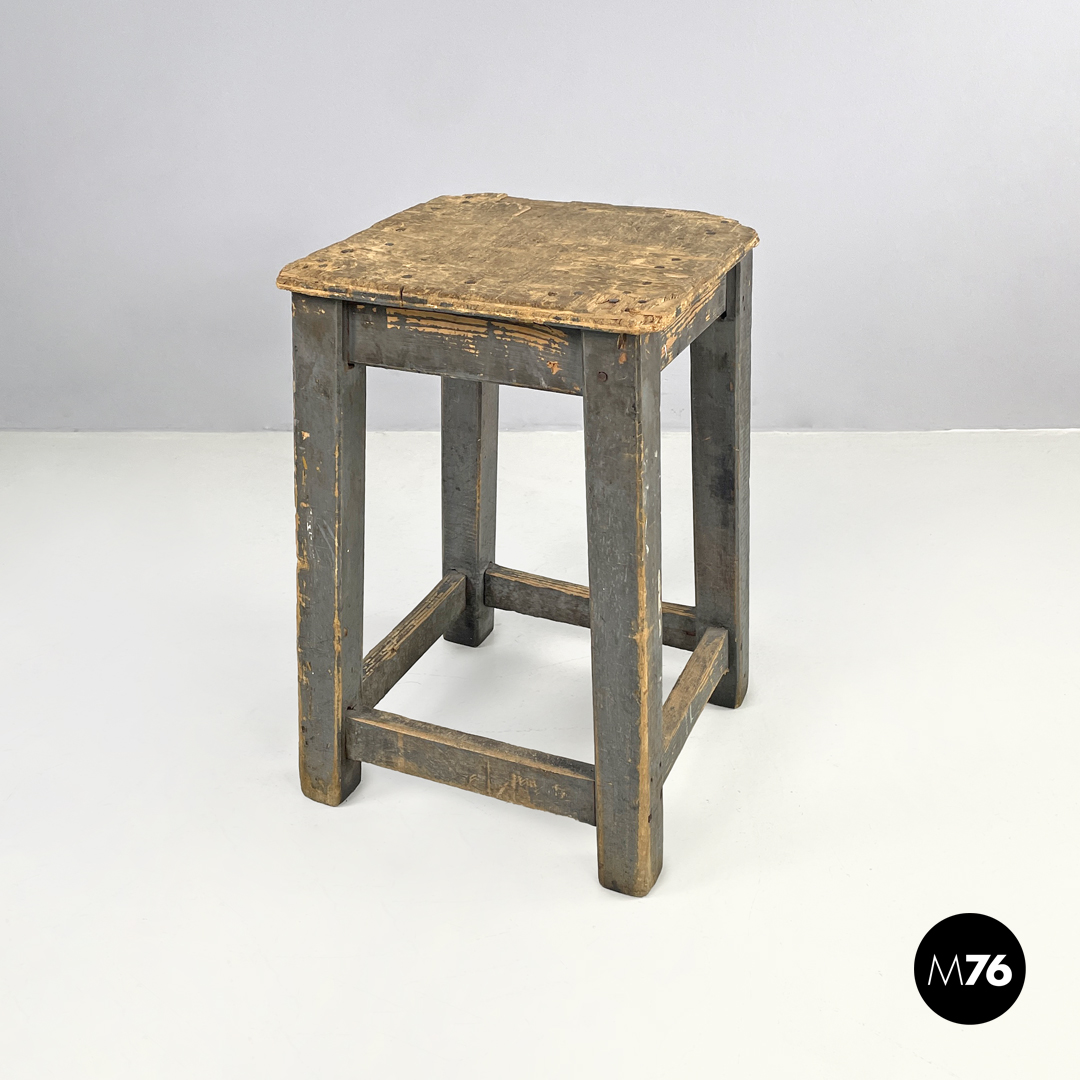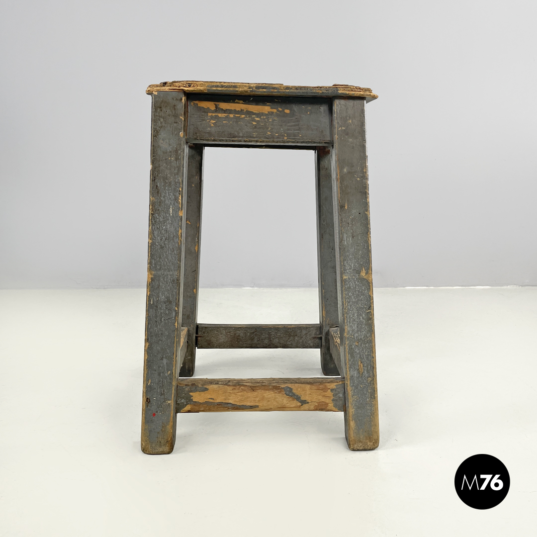 Sgabello industriale in legno. La seduta è quadrata le quattro gambe sono a sezione quadrata con quattro travi alla base che fanno da poggiapiedi. Lo sgabello è verniciato grigio. Gli elementi che lo compongono sono uniti tra di loro tramite chiodi visibili soprattutto sulla seduta.
