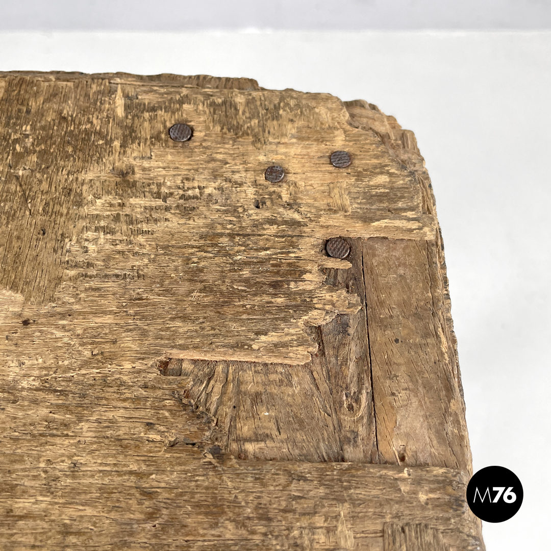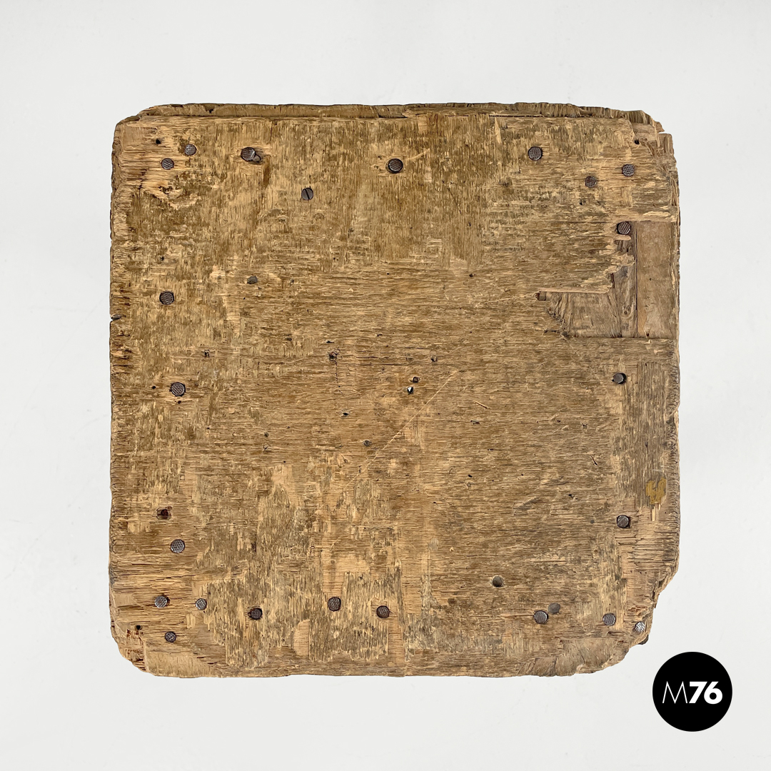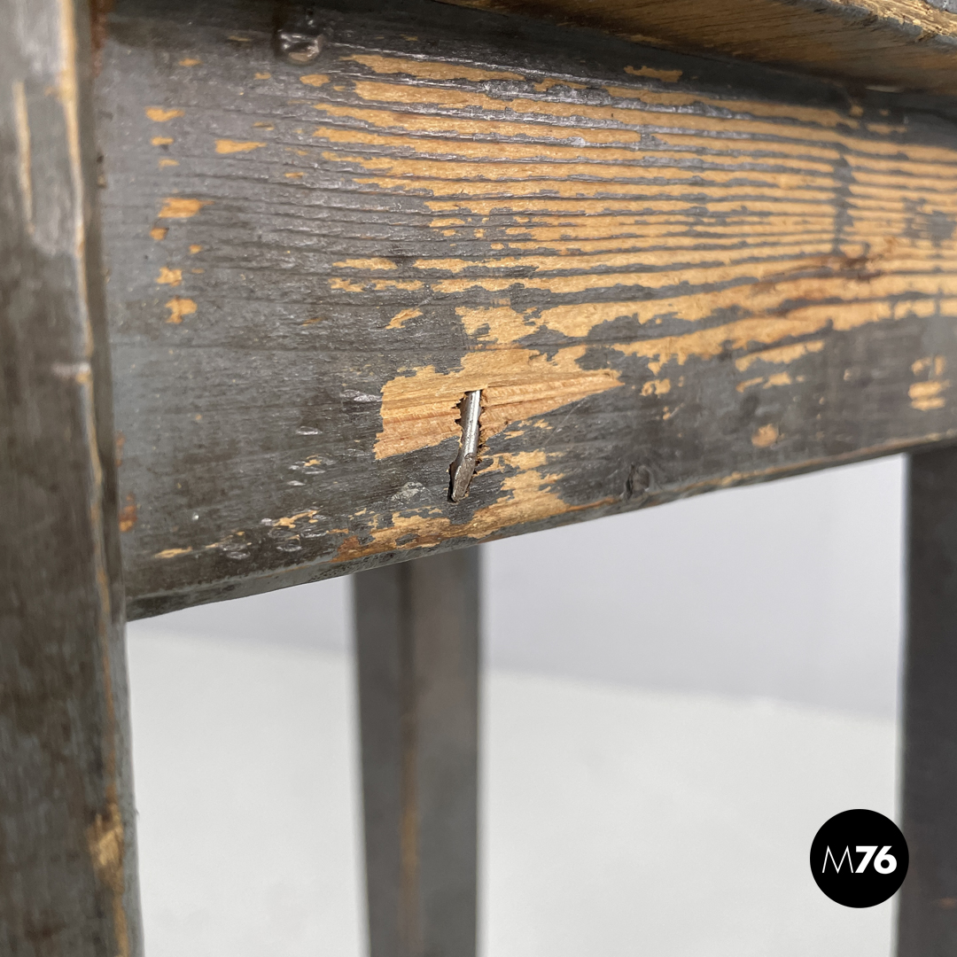 Sgabello industriale in legno. La seduta è quadrata le quattro gambe sono a sezione quadrata con quattro travi alla base che fanno da poggiapiedi. Lo sgabello è verniciato grigio. Gli elementi che lo compongono sono uniti tra di loro tramite chiodi visibili soprattutto sulla seduta.